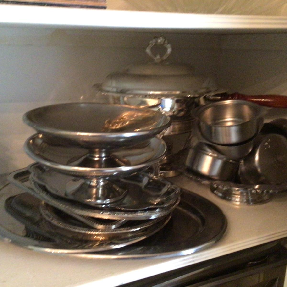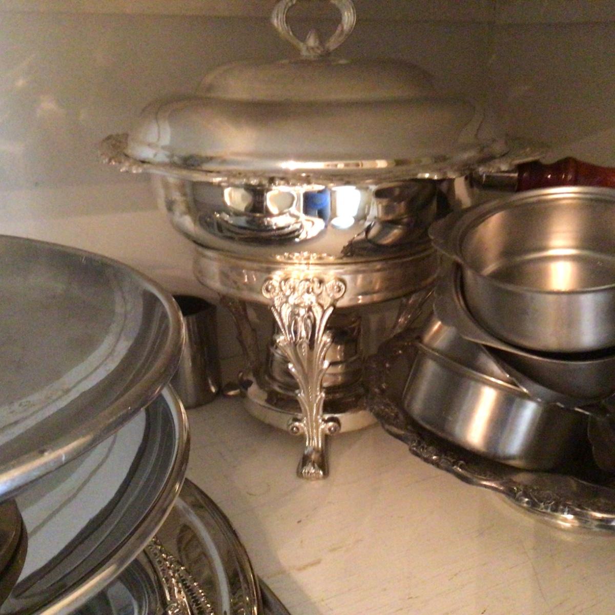 Round chafing dish has a wooden handle and detailed legs and is complete, lot also includes numerous stainless steel serving dishes and trays.
