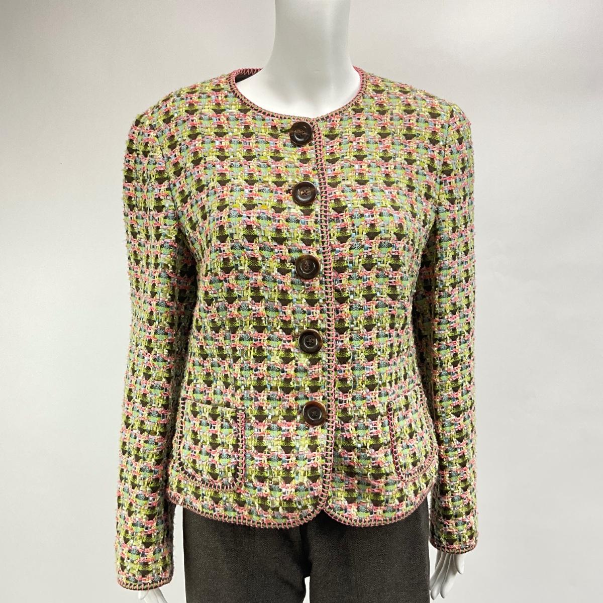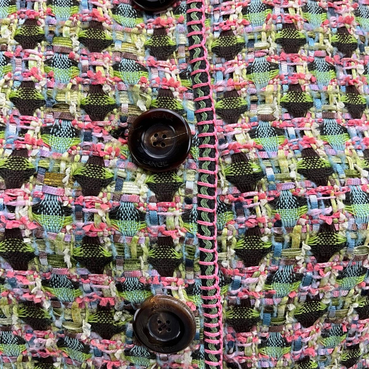 The jacket is size 12 and measures 20" from armpit to armpit and 24" in length, beautiful textures and pink,green and brown. The pants are brown wool size 6, measures 14" from hip to hip when flat, 40" overall length and the inseam is 32".