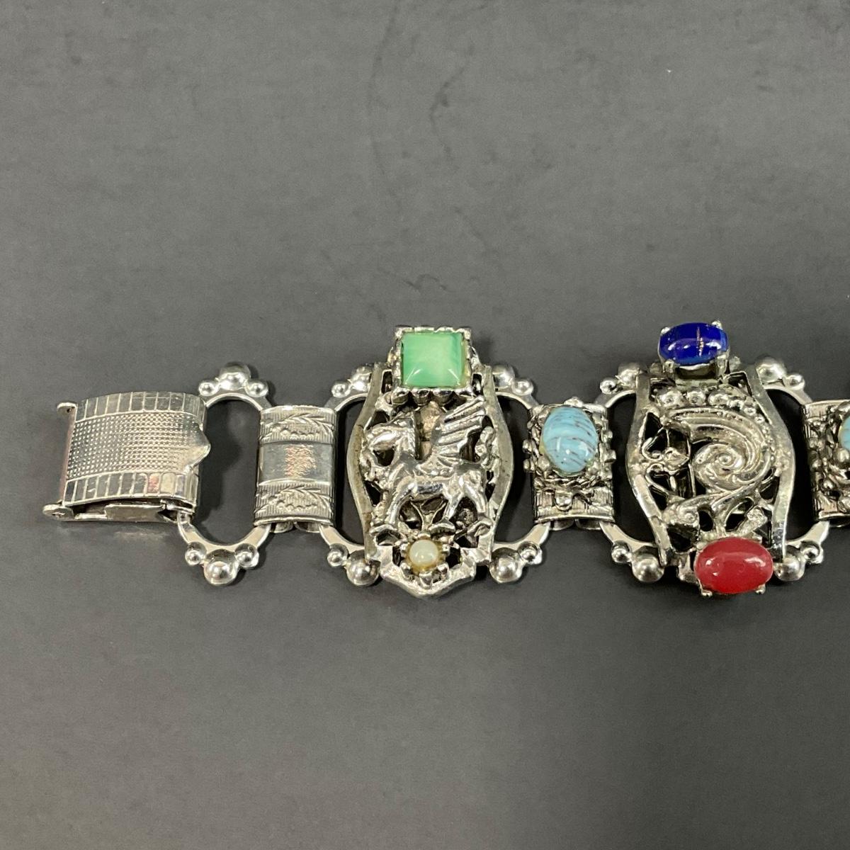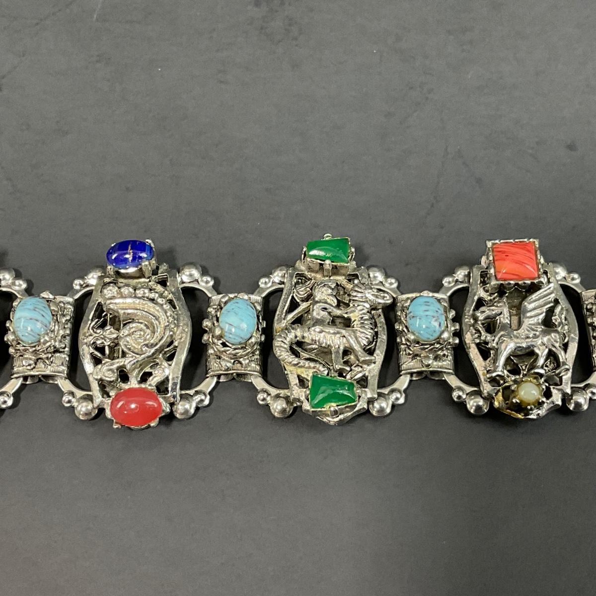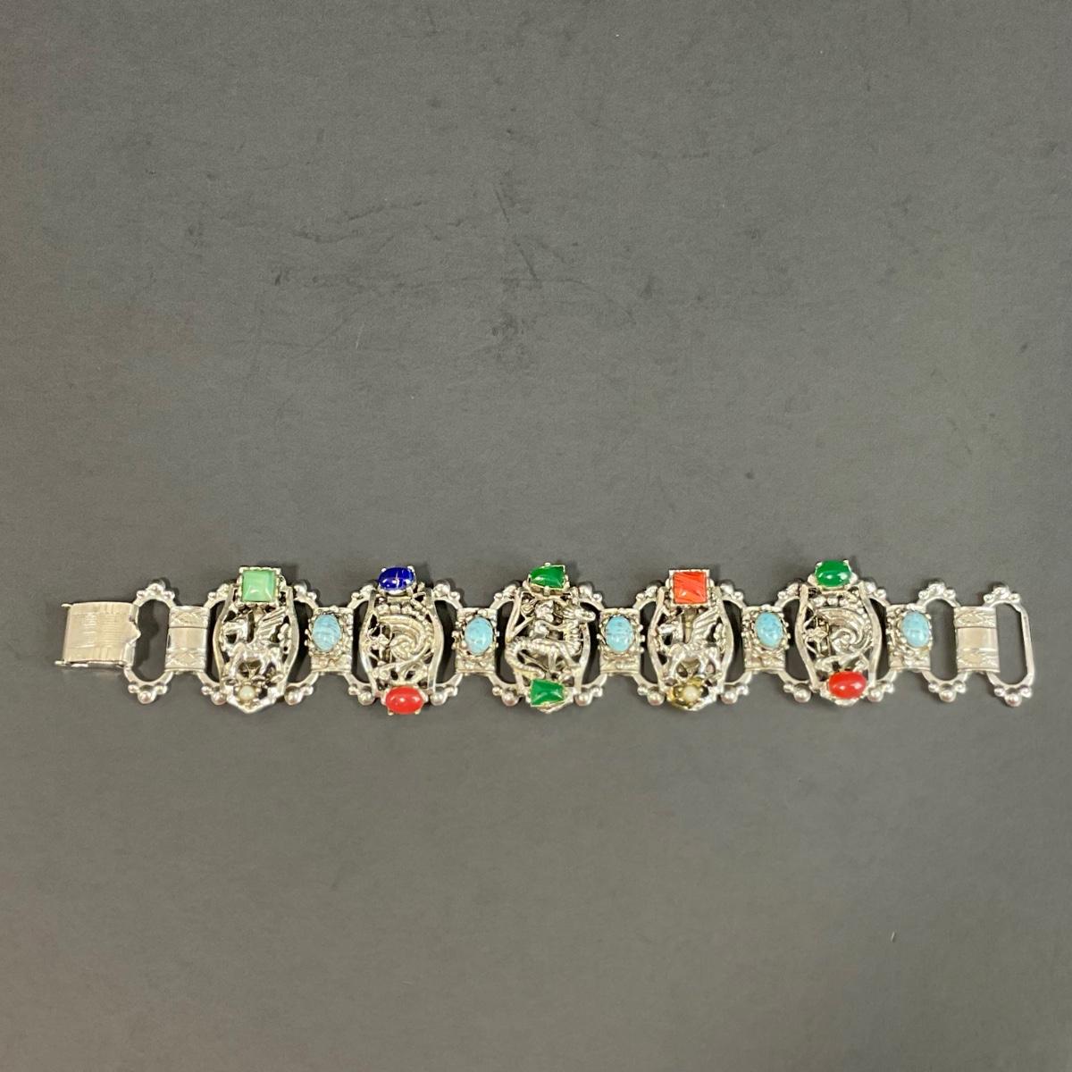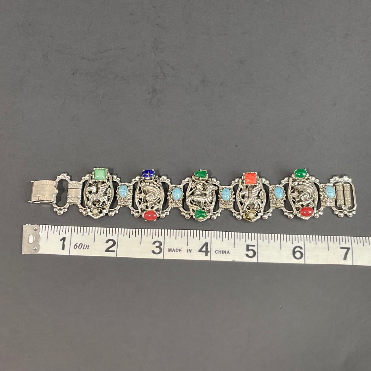 One vintage gemstone Mythological bracelet. This piece does have some scuffs, scratches, marks, or slight damage, but otherwise appears to be in great shape. Please see photos for details and condition. Any condition statement is given as a courtesy to a client, is an opinion, and should not be treated as a statement of fact. Reference to condition written, oral or within a condition report shall not be regarded as a full account of condition and may not include all defects, alterations, or restorations. Absence of a condition report does not imply a lot is flawless or lacking imperfections or damage. Katherine’s Auction & Appraisal Service shall have no responsibility for any error or omission. Returns shall not be accepted on the basis of condition. ::: Shipping is available on this lot. If you require shipping you must let us know at the close of the auction. We will coordinate with you after the item has been won. Shipping fees will include insurance up to or exceeding the value of all items being mailed. If you have any questions regarding this lot please contact the auctioneer either via this website, by direct email or by phone. PICK UP TIMES and other important information can be found in the TERMS and DESCRIPTION of the auction. Please take a look for pertinent information. Thanks!