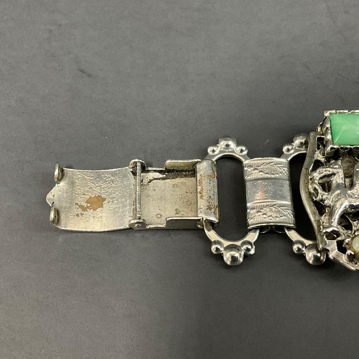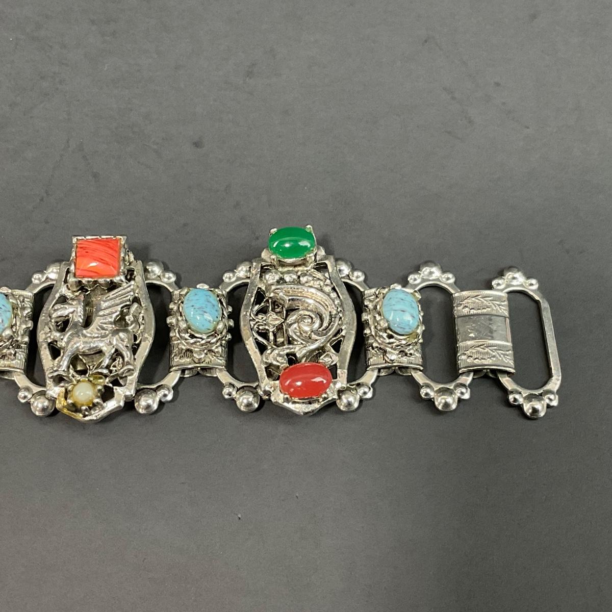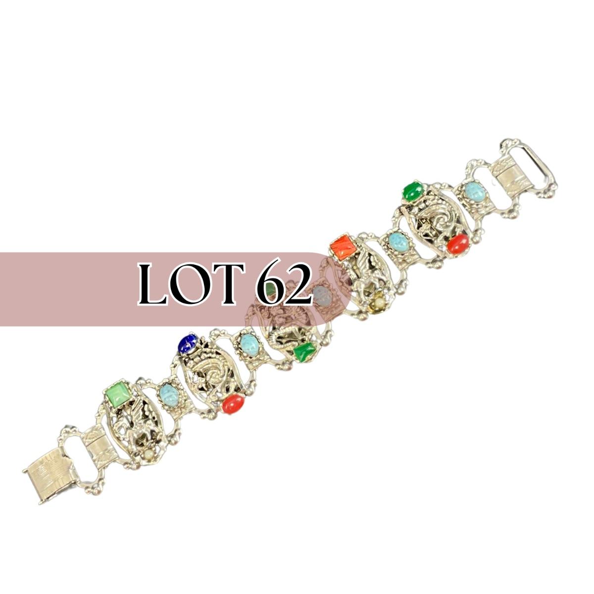 One vintage gemstone Mythological bracelet. This piece does have some scuffs, scratches, marks, or slight damage, but otherwise appears to be in great shape. Please see photos for details and condition. Any condition statement is given as a courtesy to a client, is an opinion, and should not be treated as a statement of fact. Reference to condition written, oral or within a condition report shall not be regarded as a full account of condition and may not include all defects, alterations, or restorations. Absence of a condition report does not imply a lot is flawless or lacking imperfections or damage. Katherine’s Auction & Appraisal Service shall have no responsibility for any error or omission. Returns shall not be accepted on the basis of condition. ::: Shipping is available on this lot. If you require shipping you must let us know at the close of the auction. We will coordinate with you after the item has been won. Shipping fees will include insurance up to or exceeding the value of all items being mailed. If you have any questions regarding this lot please contact the auctioneer either via this website, by direct email or by phone. PICK UP TIMES and other important information can be found in the TERMS and DESCRIPTION of the auction. Please take a look for pertinent information. Thanks!