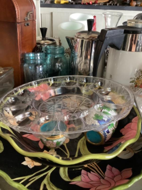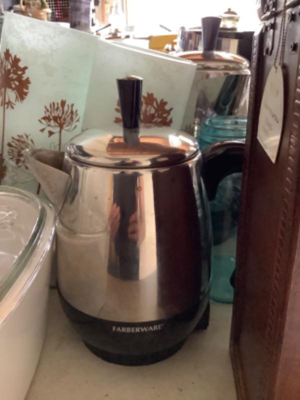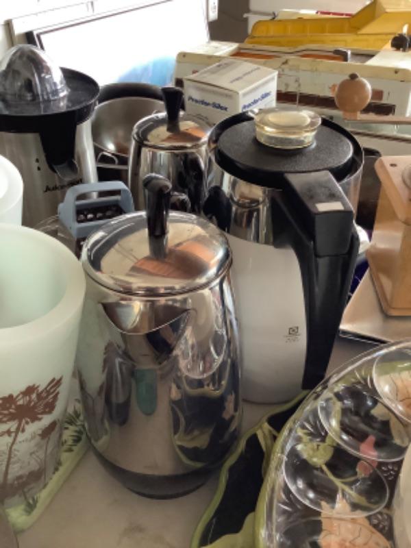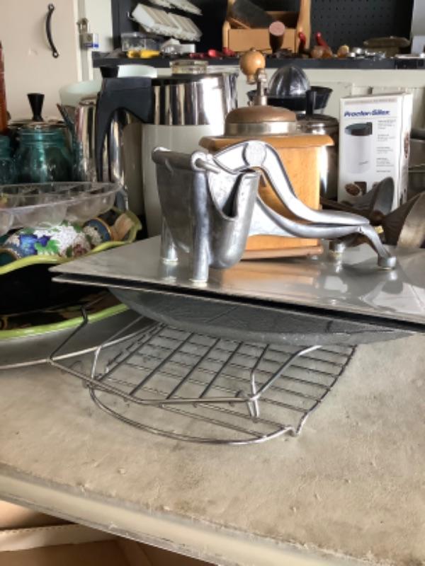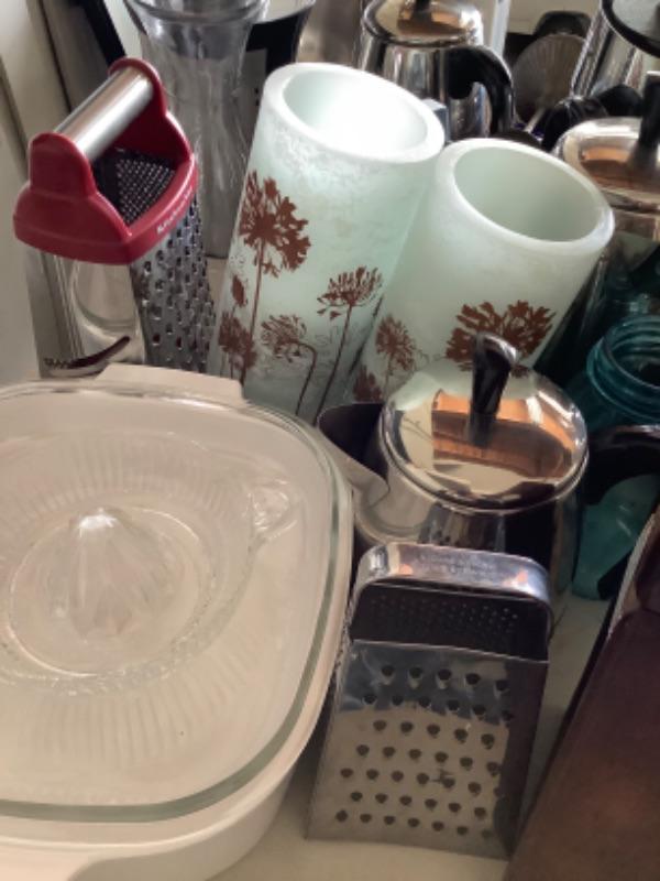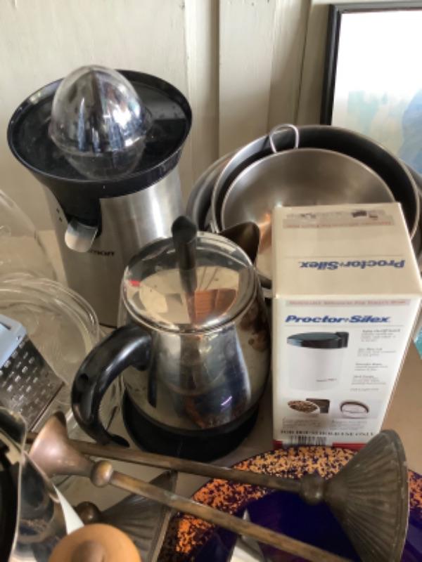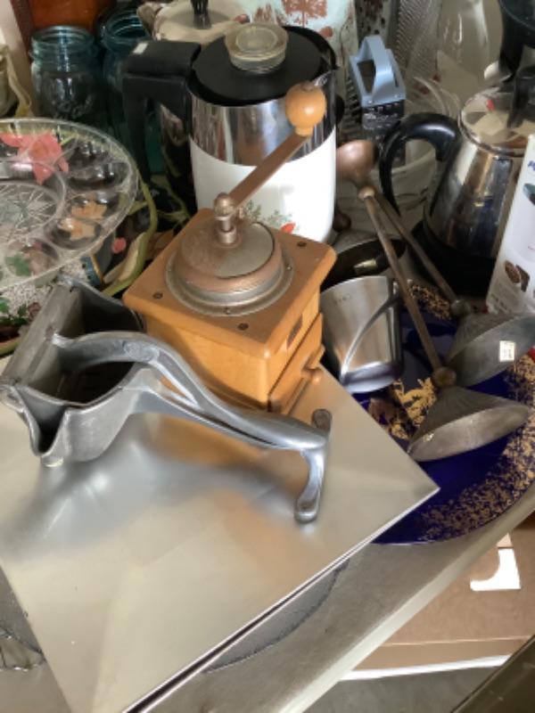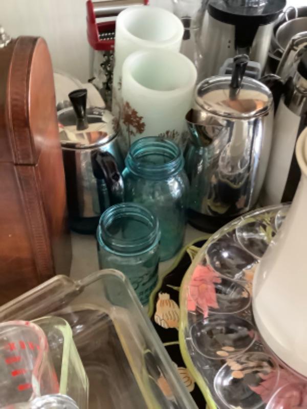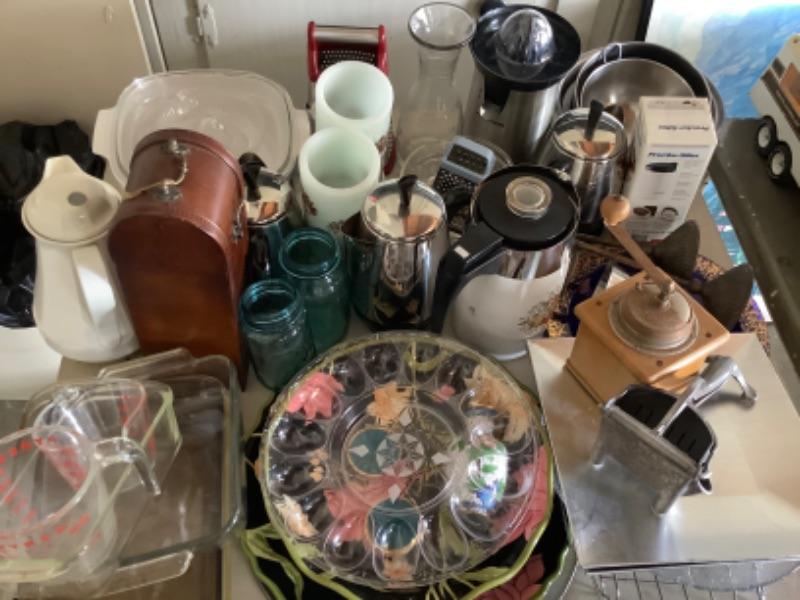 Various coffee pots and percolators, Pyrex, juicer, pans, trays, graters, coffee finders, strainers.