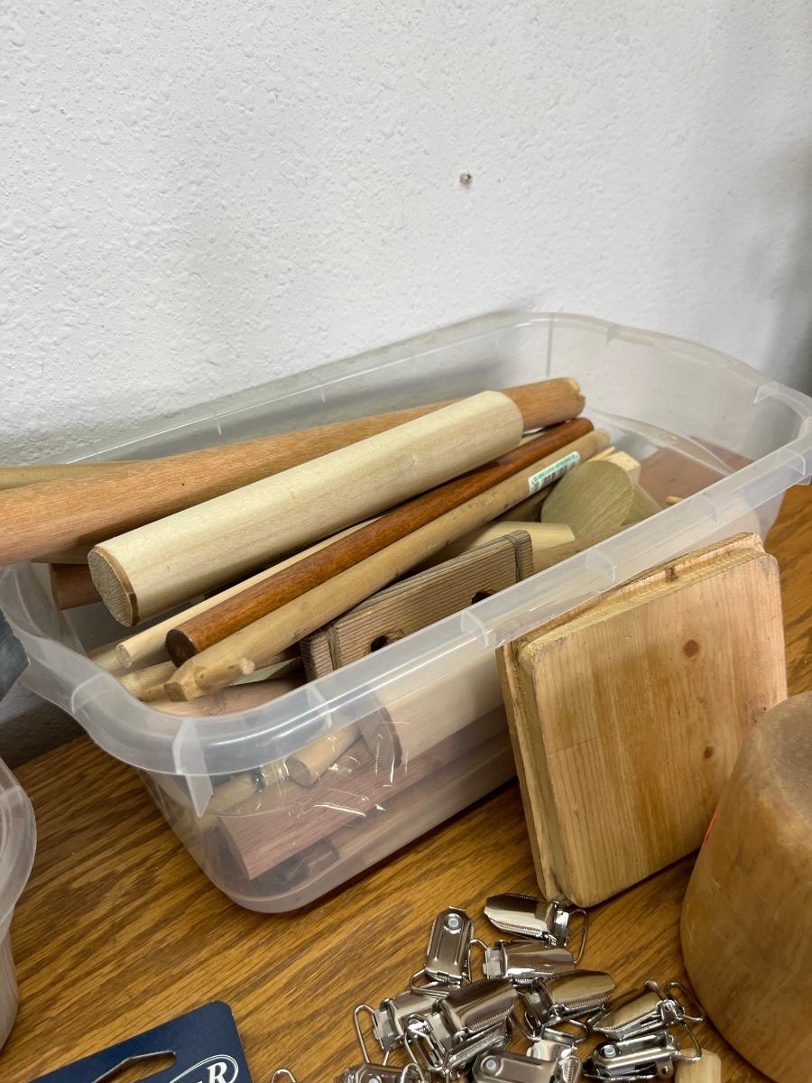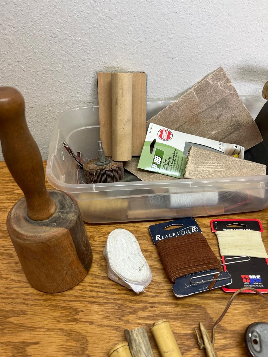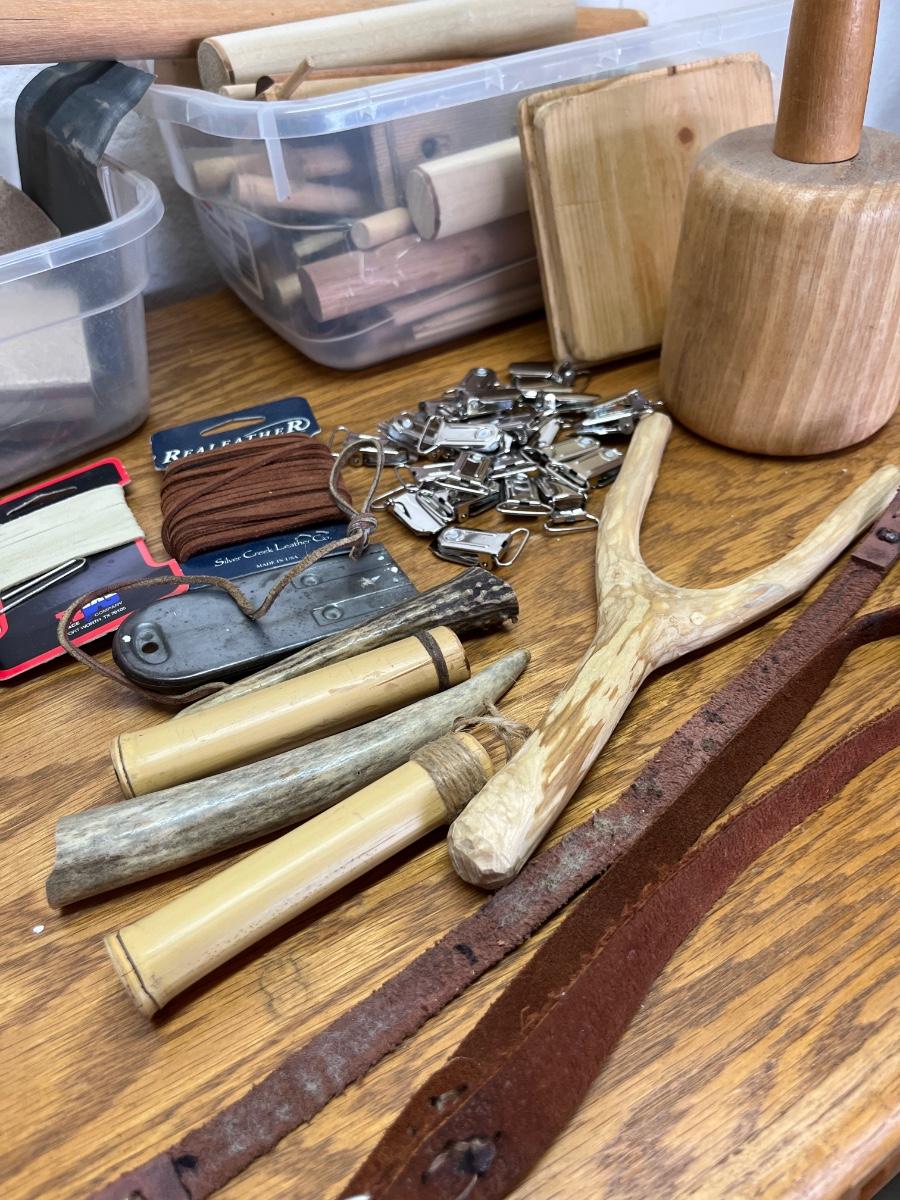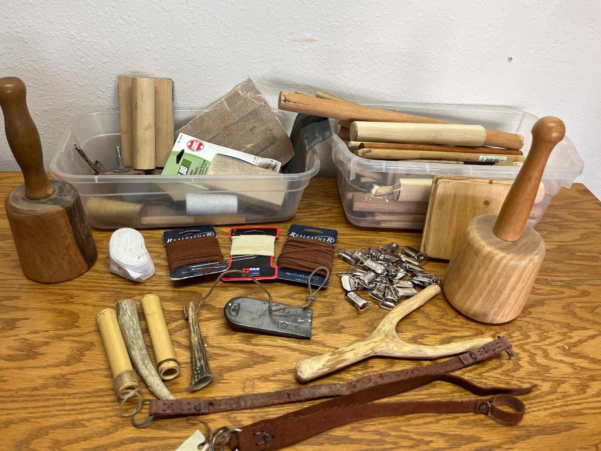 62- misc wood PCs, leather, deer horns, etc