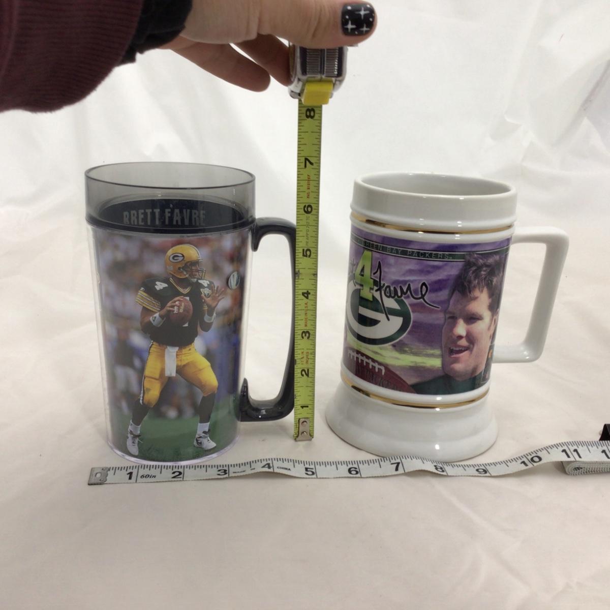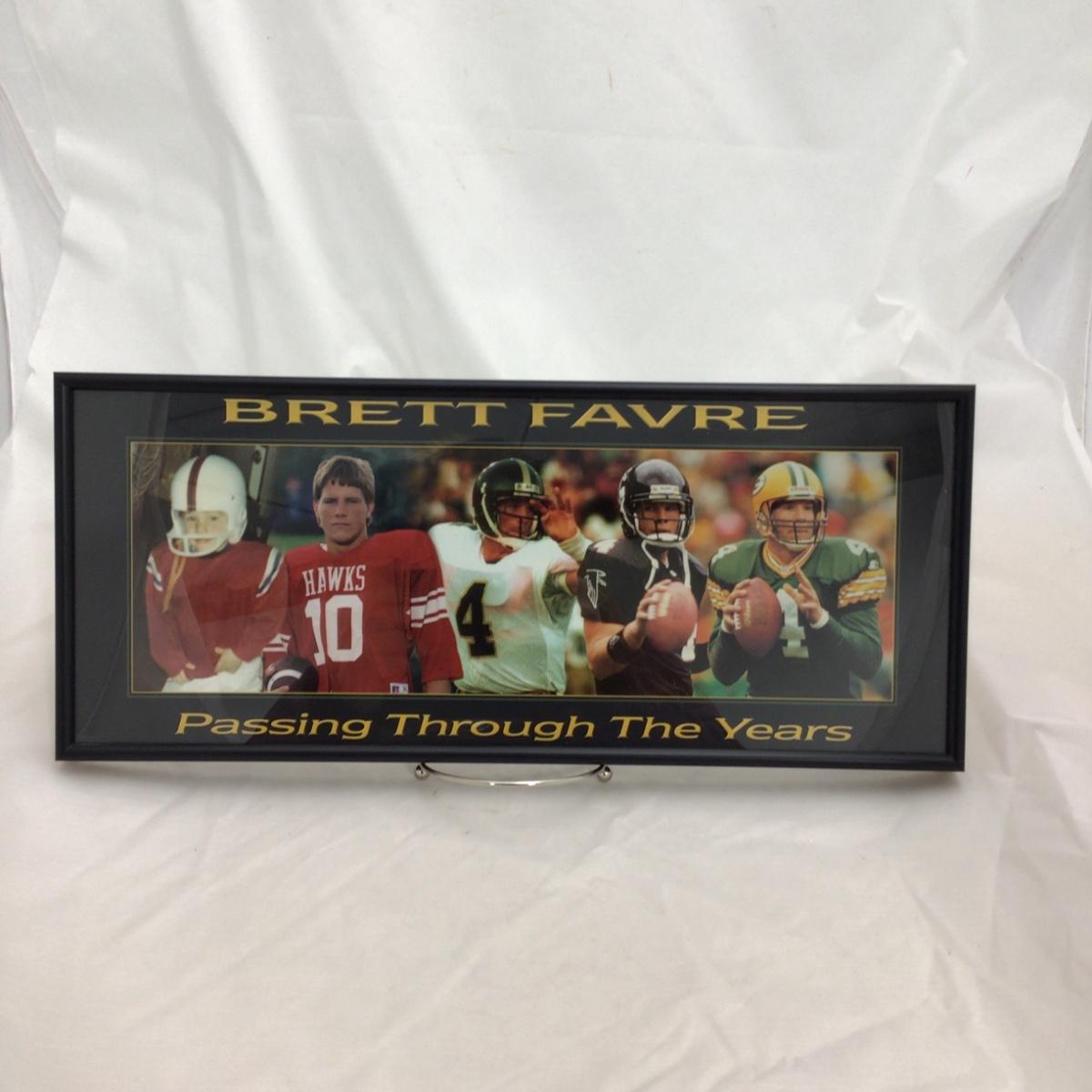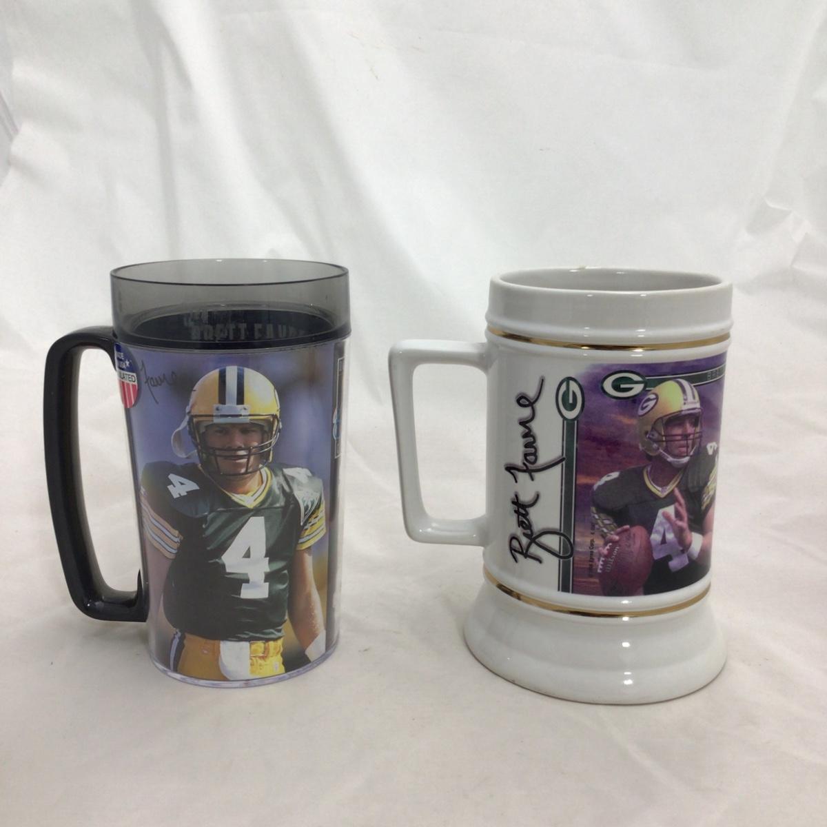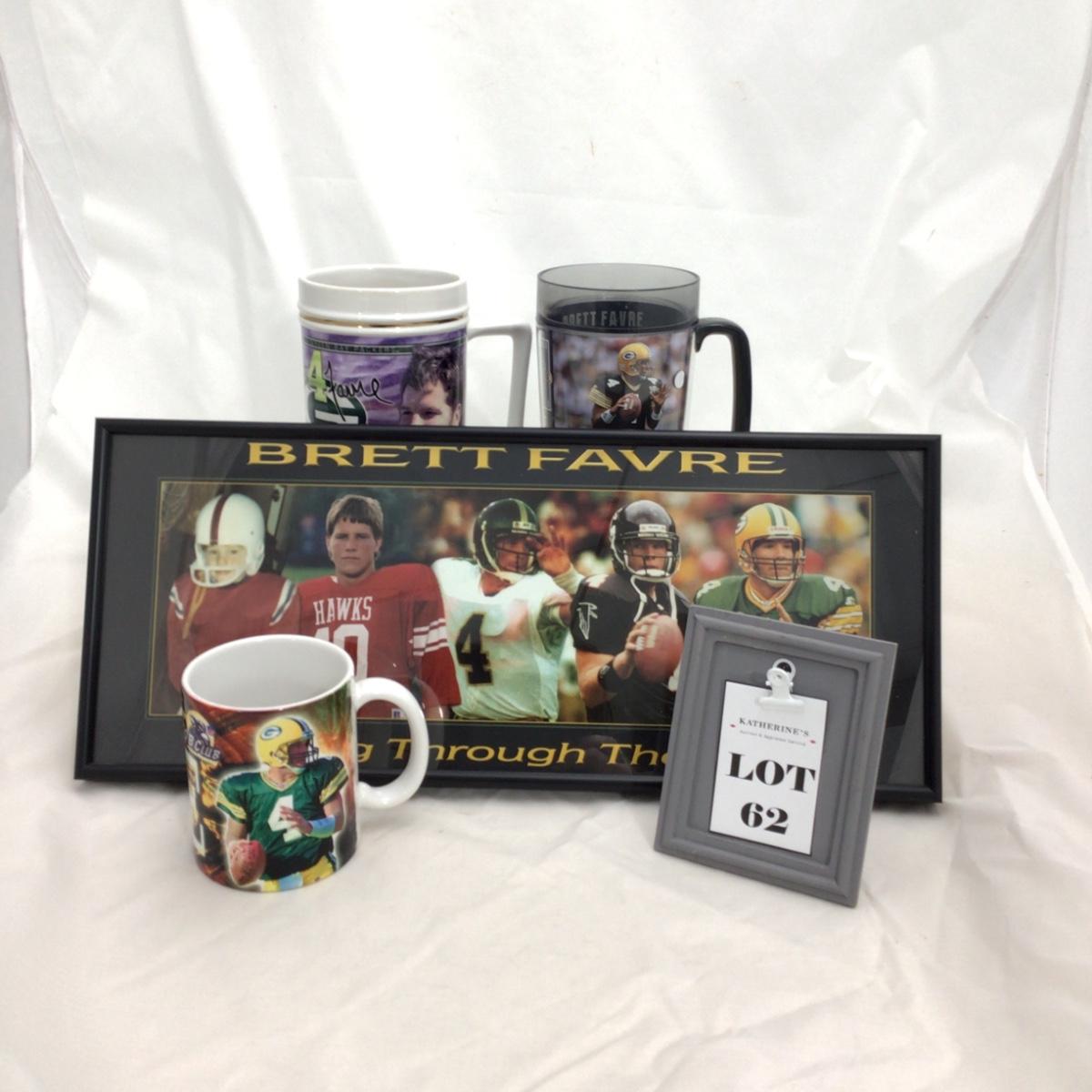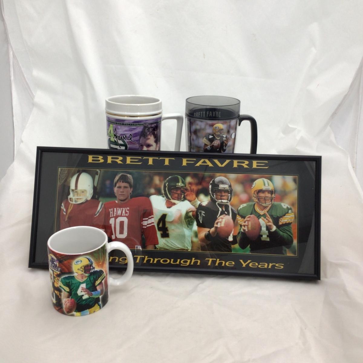 Framed Brett Farve though the years print. 8 inches by 18 inches. One Brett Farve stein, one plastic Brett Farve mug, and one ceramic Brett Farve mug. Please see photos for details and condition. ::: Shipping is available on this lot. If you require shipping you must let us know at the close of the auction. We will coordinate with you after the item has been won. Shipping fees will include insurance up to or exceeding the value of all items being mailed. If you have any questions regarding this lot please contact the auctioneer either via this website, by direct email or by phone. PICK UP TIMES and other important information can be found in the TERMS and DESCRIPTION of the auction. Please take a look for pertinent information. Thanks!