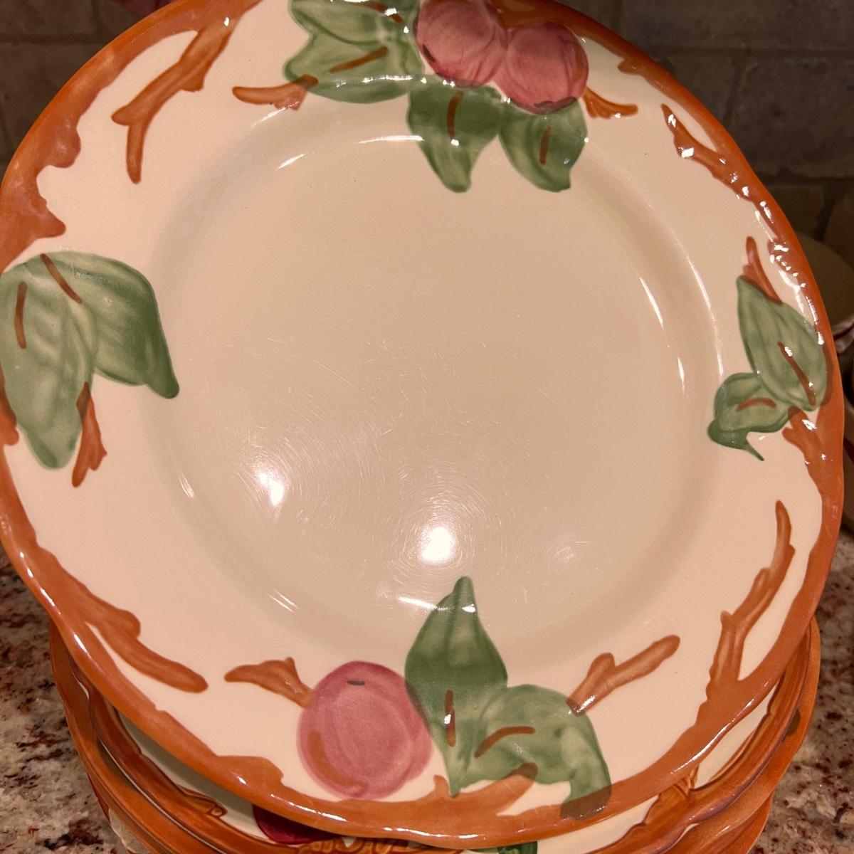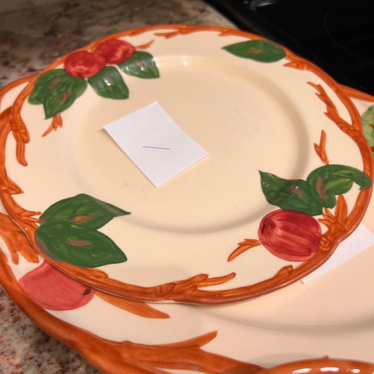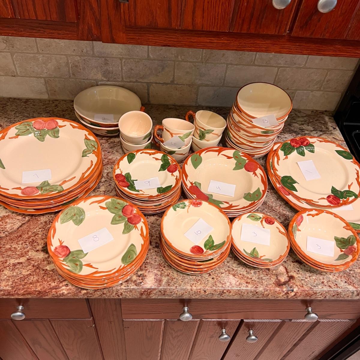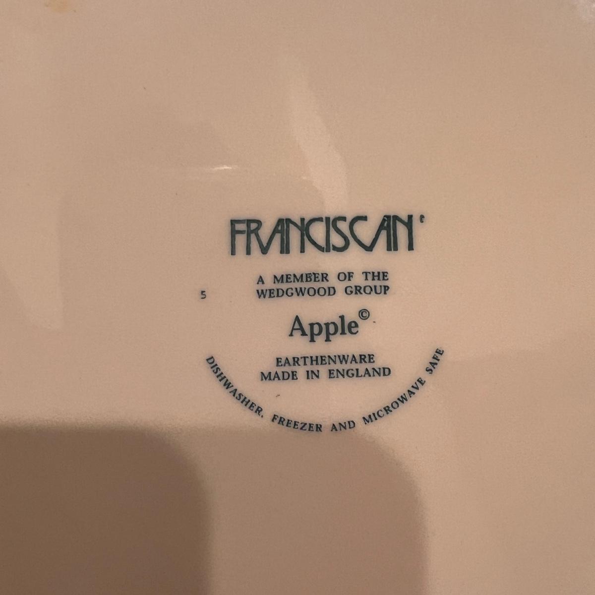 62 pieces of Franciscan (a member of the Wedgwood Group) dinnerware including serving dishes. I found 1 chip shown in pics on a dinner plate. Otherwise great condition!