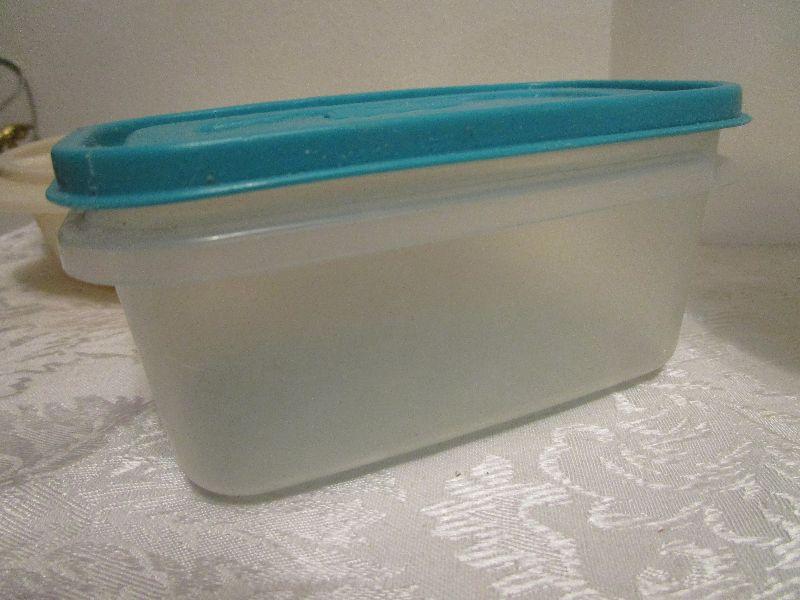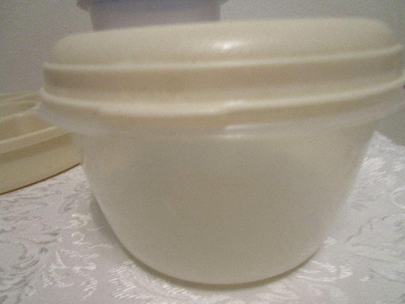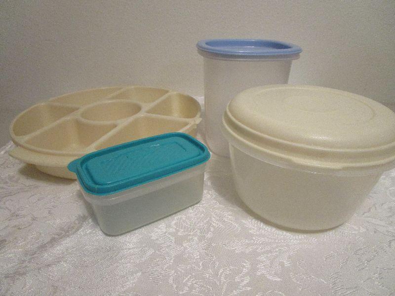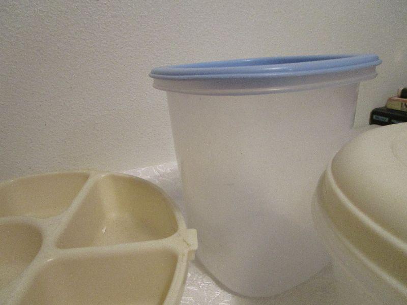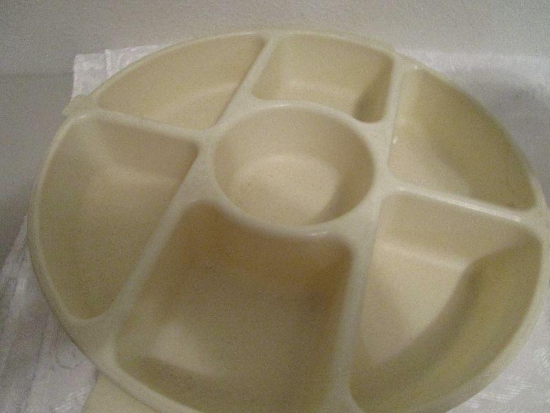 Large relish tray 12" around 2" deep; 6 cup canister; 14 oz container; 6 cup Bowl