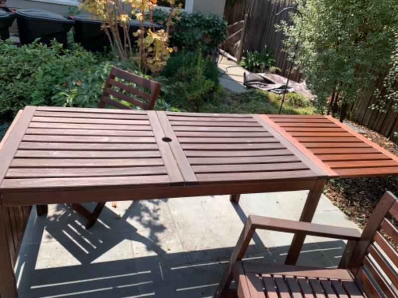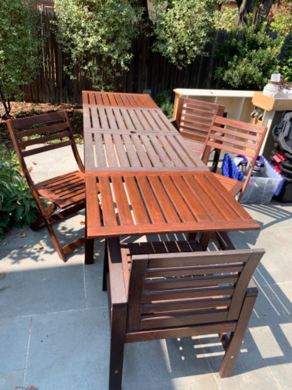 Teak picnic table with four chairs (folded: 55”x30”x28.5; leaves measure 23.5” each)