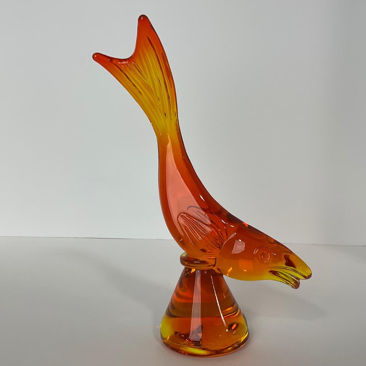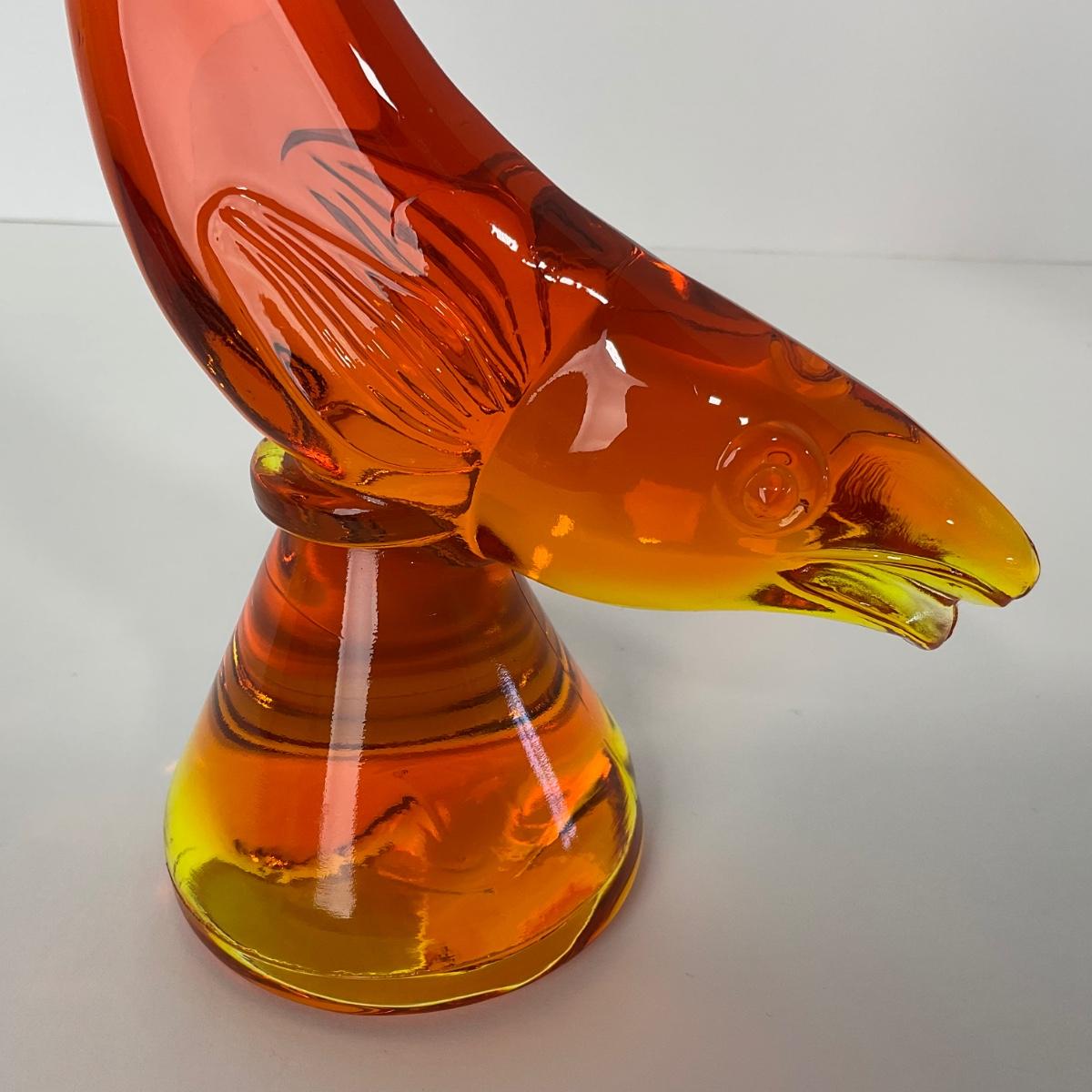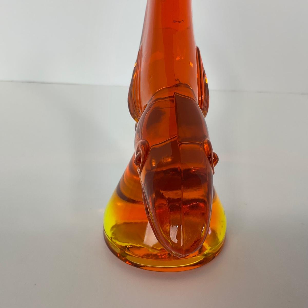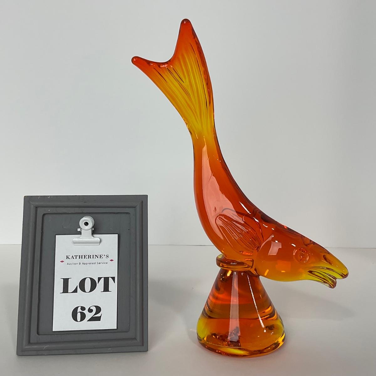 One Viking orange Amberina colored trout figure. 5 1/2 inches wide by 10 inches tall. This piece has no damage, and appears to be in great shape with no visable chips, cracks, or broken pieces. Please see photos for details and condition. Any condition statement is given as a courtesy to a client, is an opinion, and should not be treated as a statement of fact. Reference to condition written, oral or within a condition report shall not be regarded as a full account of condition and may not include all defects, alterations, or restorations. Absence of a condition report does not imply a lot is flawless or lacking imperfections or damage. Katherine’s Auction & Appraisal Service shall have no responsibility for any error or omission. Returns shall not be accepted on the basis of condition. ::: Shipping is available on this lot. If you require shipping you must let us know at the close of the auction. We will coordinate with you after the item has been won. Shipping fees will include insurance up to or exceeding the value of all items being mailed. If you have any questions regarding this lot please contact the auctioneer either via this website, by direct email or by phone. PICK UP TIMES and other important information can be found in the TERMS and DESCRIPTION of the auction. Please take a look for pertinent information. Thanks!