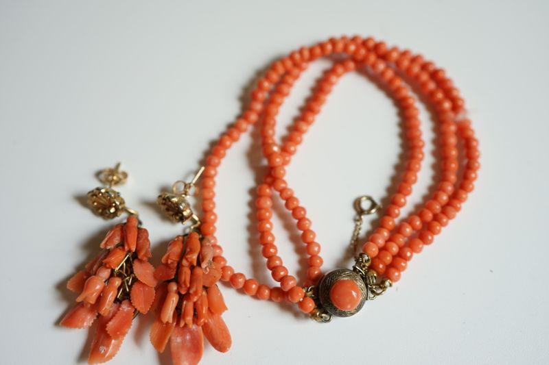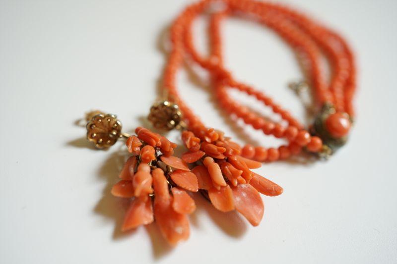 pair of carved coral drop earrings. Carving of floral and leaves, some minor pitting to a few of the leaves. Little shell shaped posts . One of the floral and leaves is missing off the earring . See earring on the left in photo.