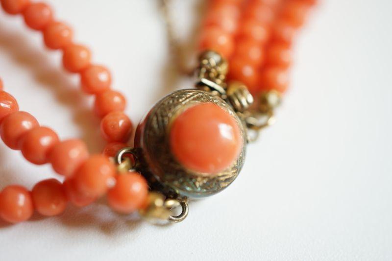 Vintage coral bracelet measures 6 1/4" with a clasp marked 800. cabochon bead on engraved clasp