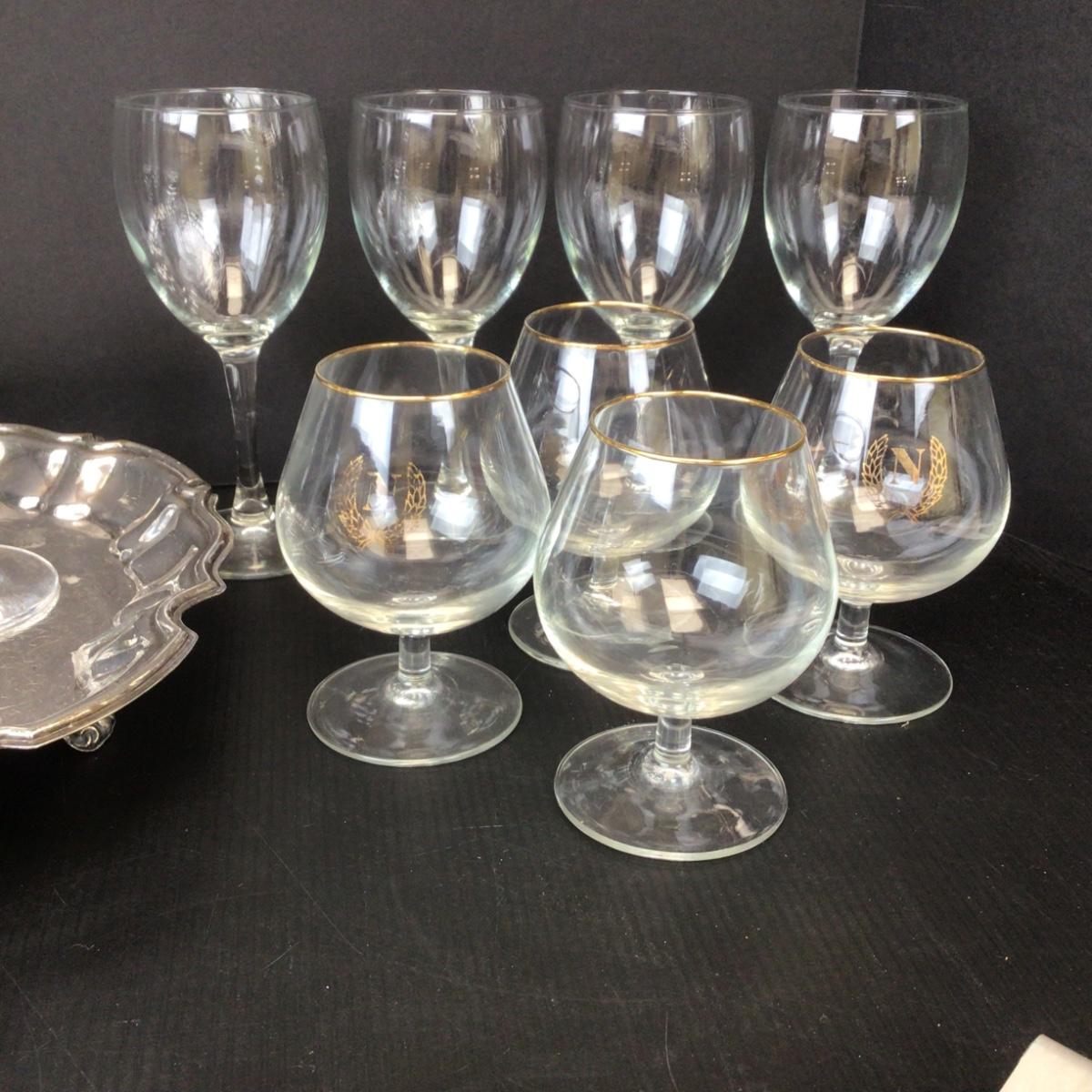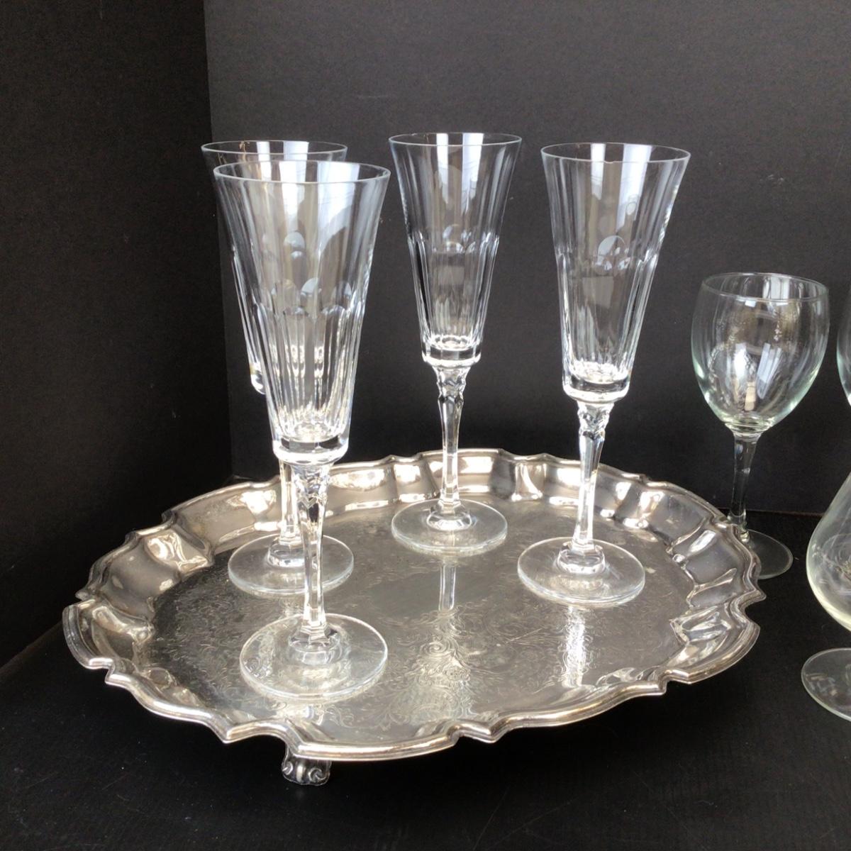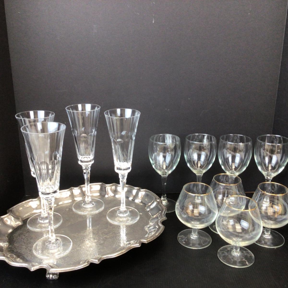There are champagne flutes, wine glasses and snifter’s in this lot as well as a Silverplate tray with feet.
