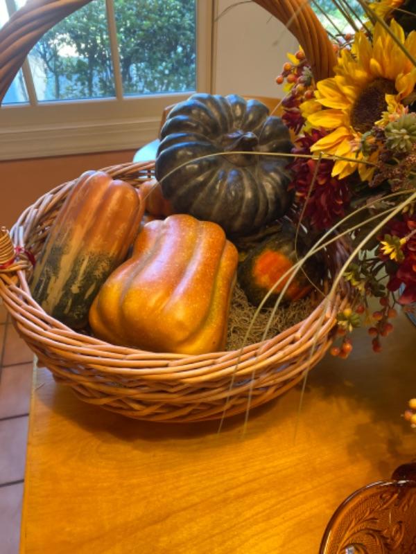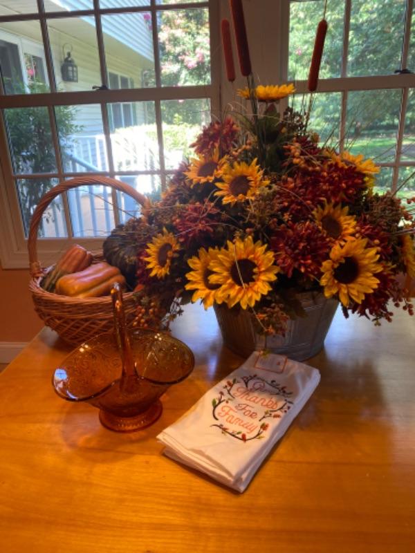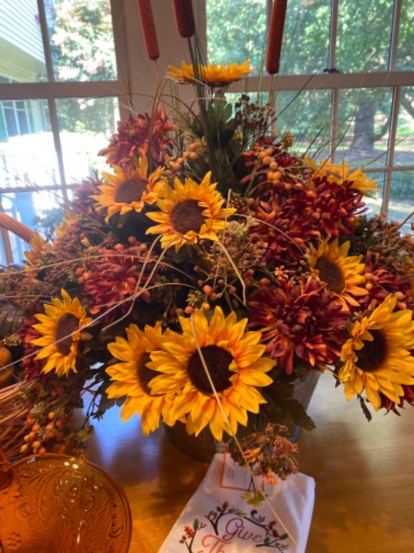 Fall Sunflower Arrangement measures approximately 30” tall x 24” round with new Fall dish towels and Faux Pumpkins , gourds, etc.