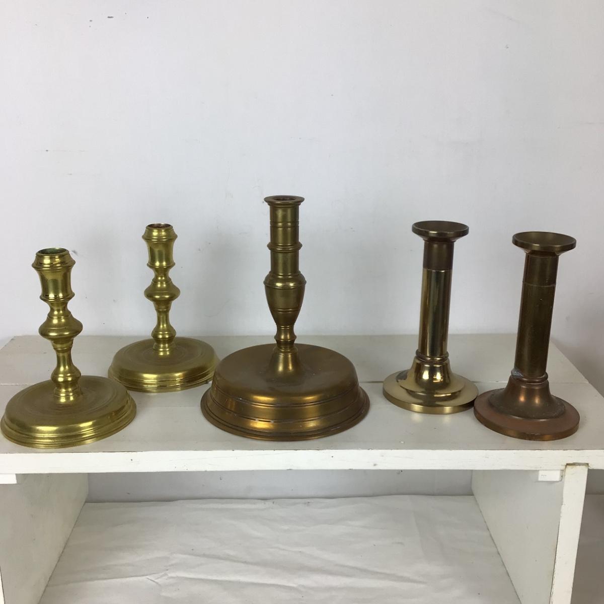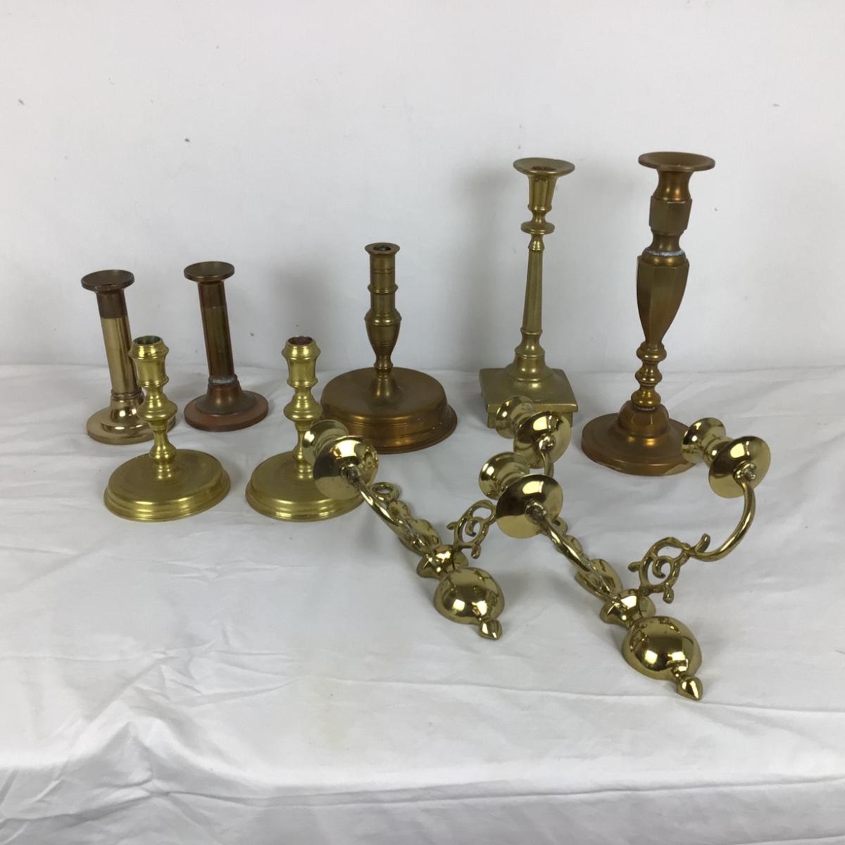 Assortment of Brass Candle Holders & Pair of Sconces.