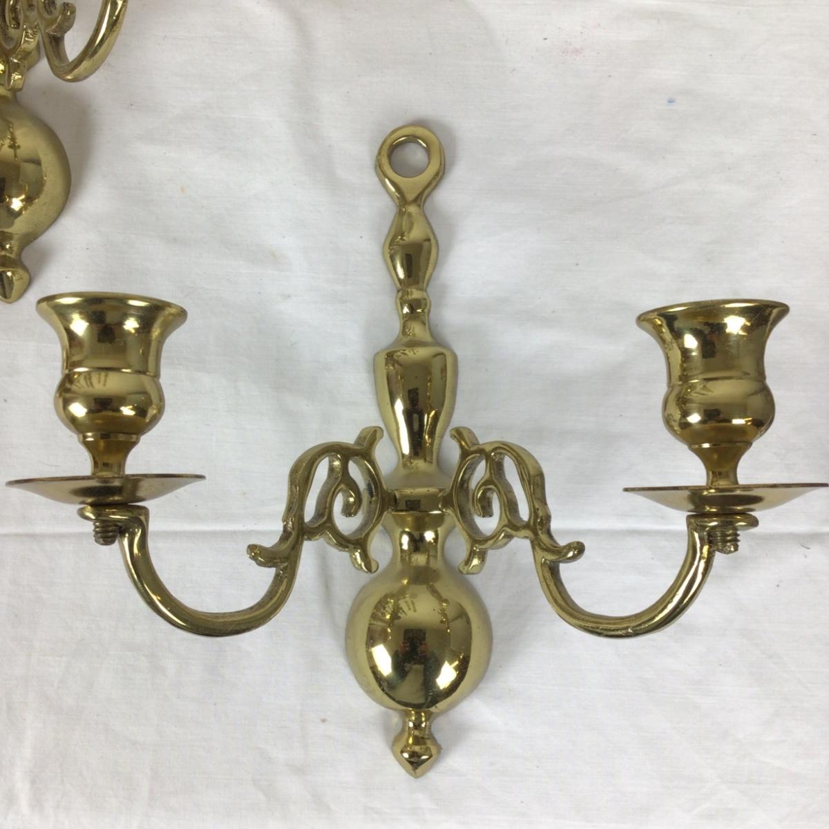 2 pairs of candle holders, one pair is Virginia Metal Crafters measuring approximately 5.5” high 3 odds without matches, measure from 7.5” to 11” & a pair sconces.measuring 9.75” high