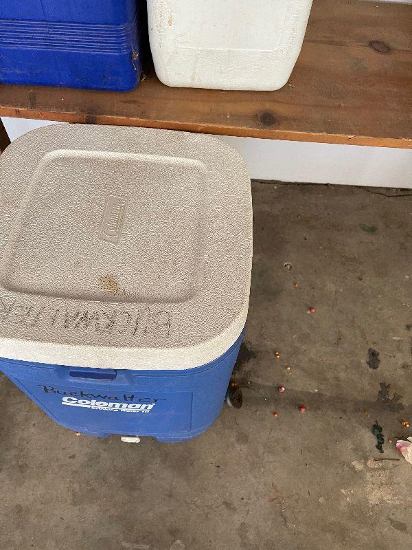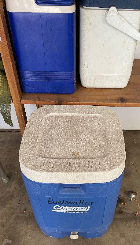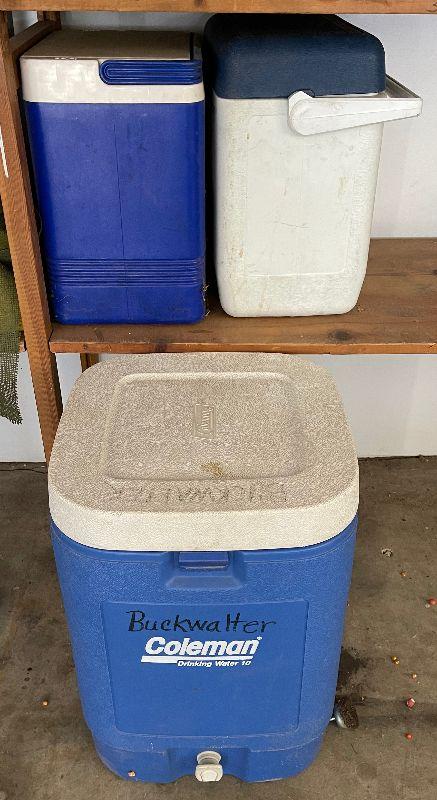 #621G 3 Blue Coolers; 1 is a water Cooler
