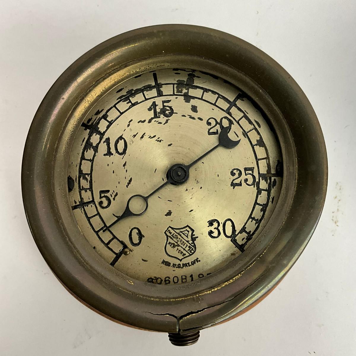 Ashcroft pressure gauge is on wood mount & has cracked brass