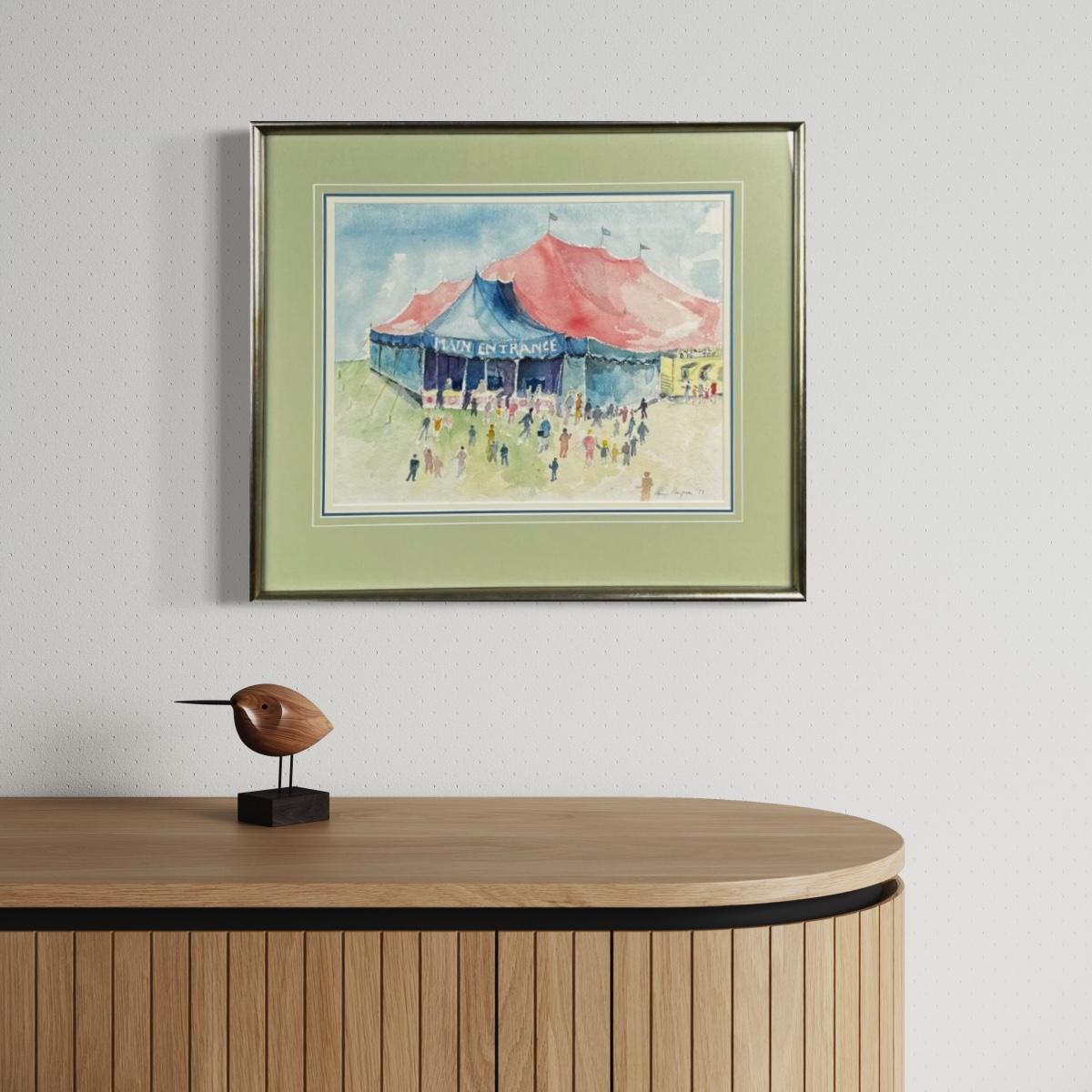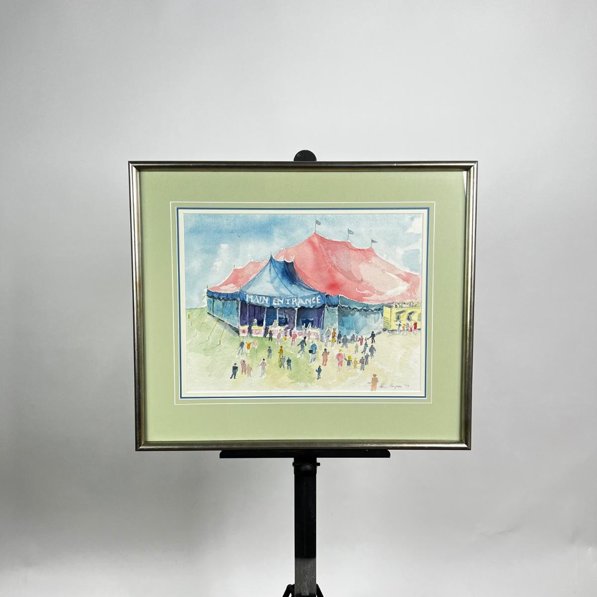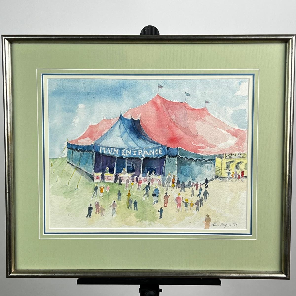 Watercolor depicts the main entrance of a circus. Framed and is double matted.