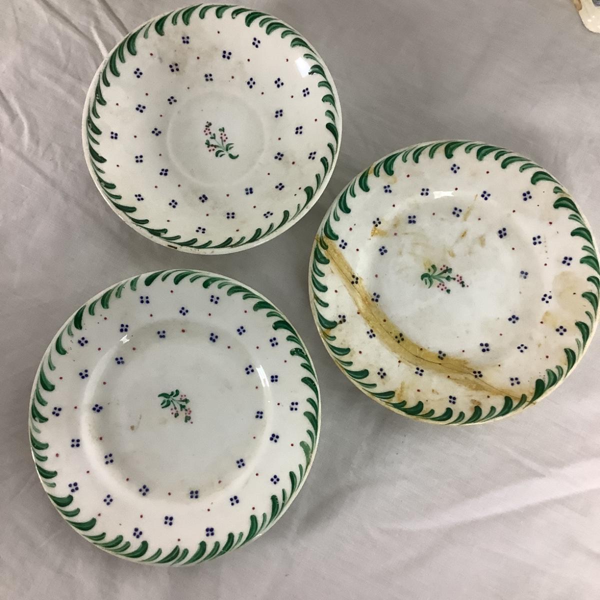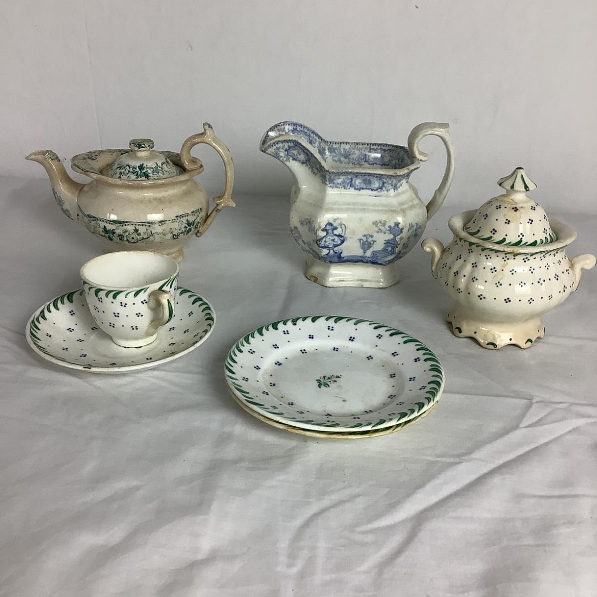 Teapot, creamer, & set of 5 sugar, tea cup, 3 plates.