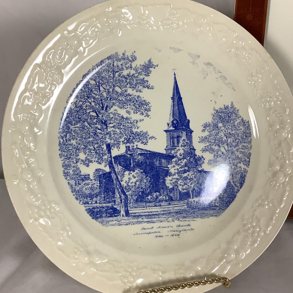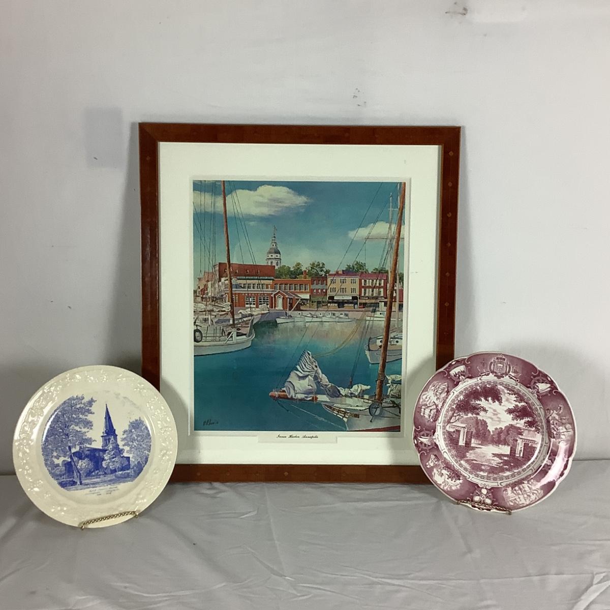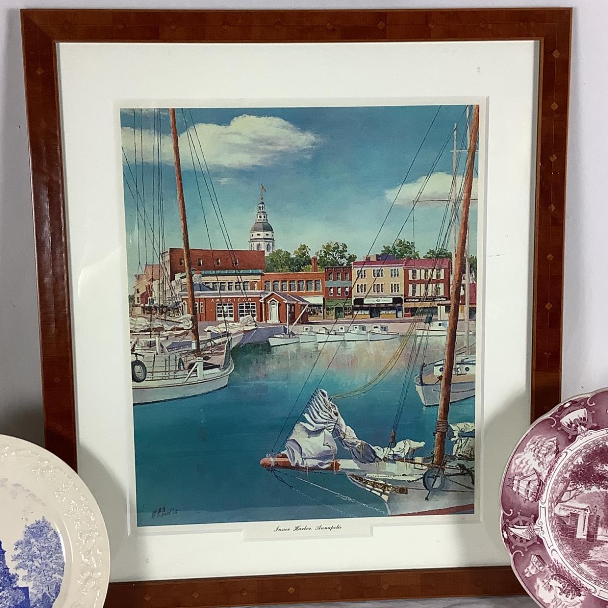 Inner Harbor Annapolis Print w/ 2 Collectable Annapolis Plates "Old Maingate" US Naval Academy Wedgwood & Homer Laughin Saint Annes Church in Annapolis.