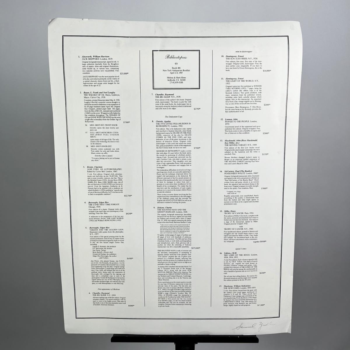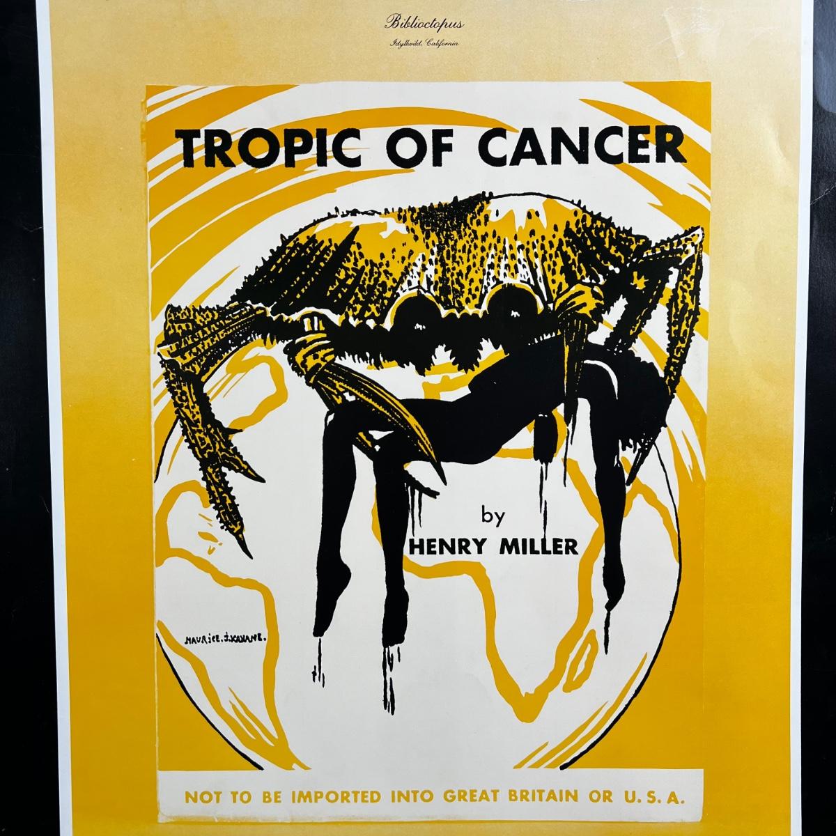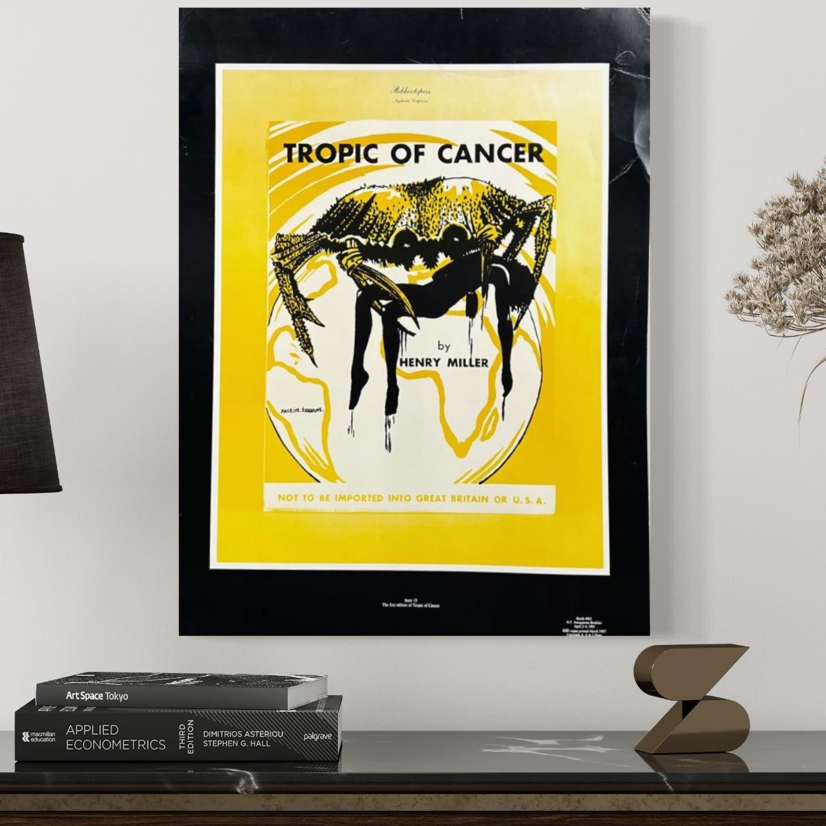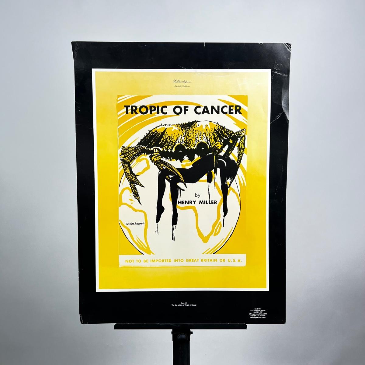Only 600 originals were printed for booth 401, front of poster is the cover of 1st edition Tropic of Cancer, back of poster lists books and sets that were to buy that year. Poster has a few wrinkles and tears on the edges.