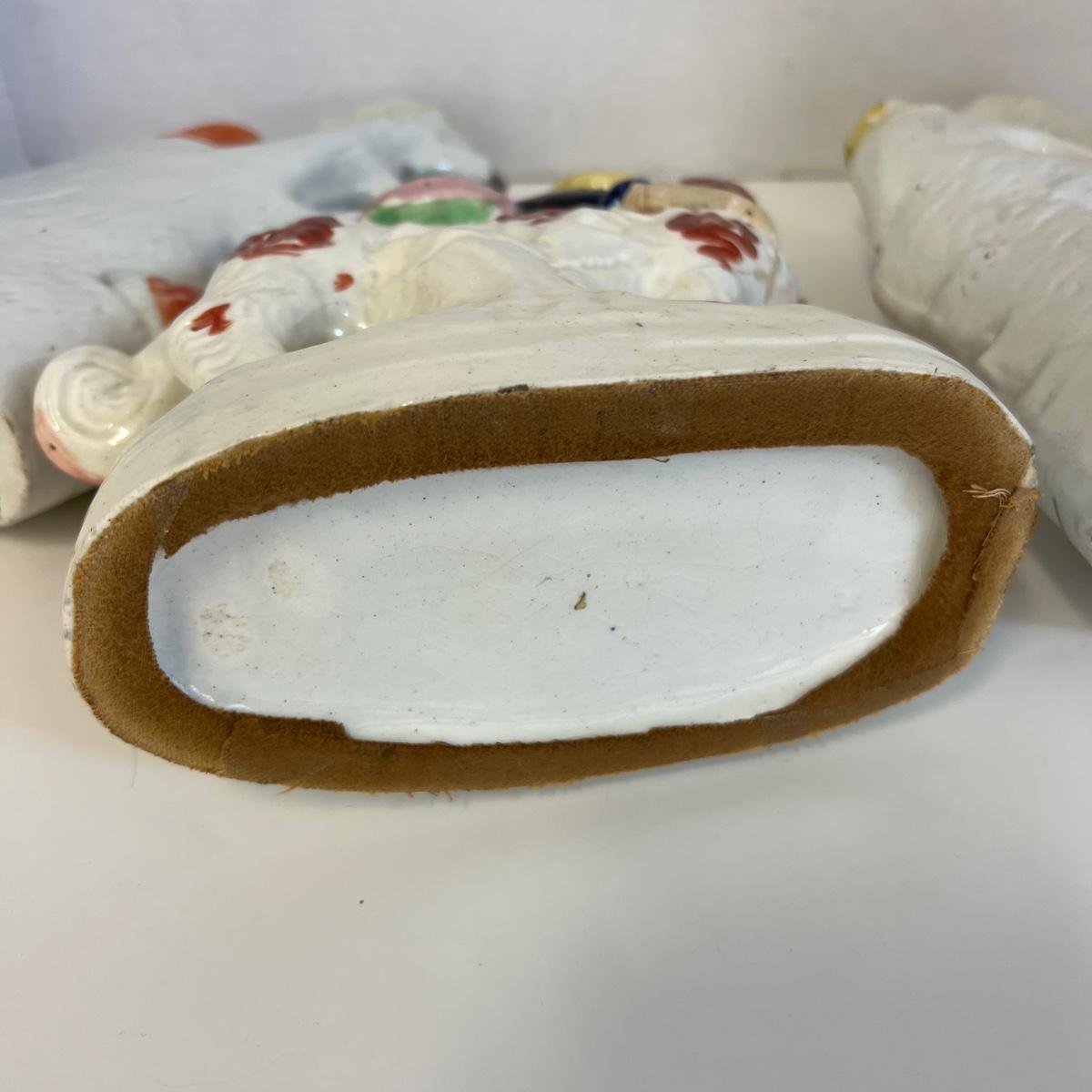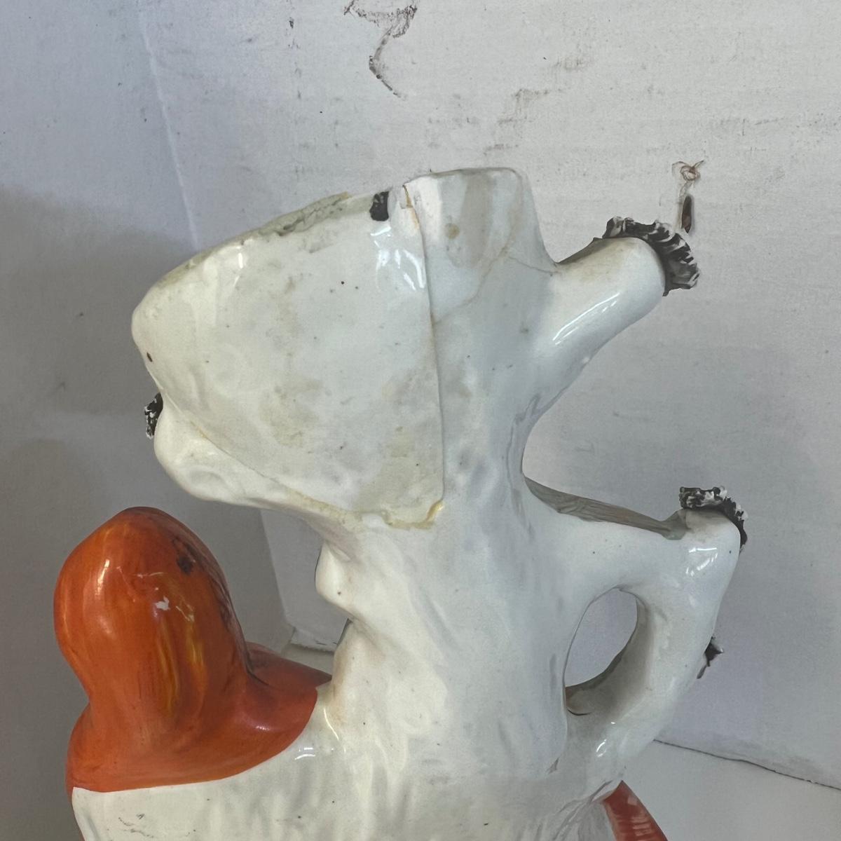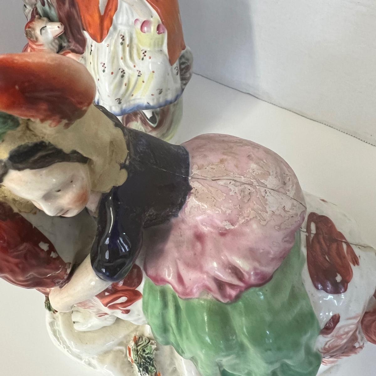 Child with lion measures 7” w x 9” high and has been repaired. The woman figure measures 10” high with repair on top and the man is 10”