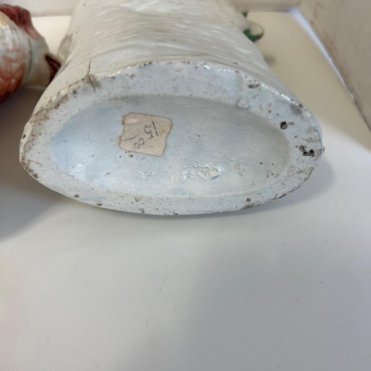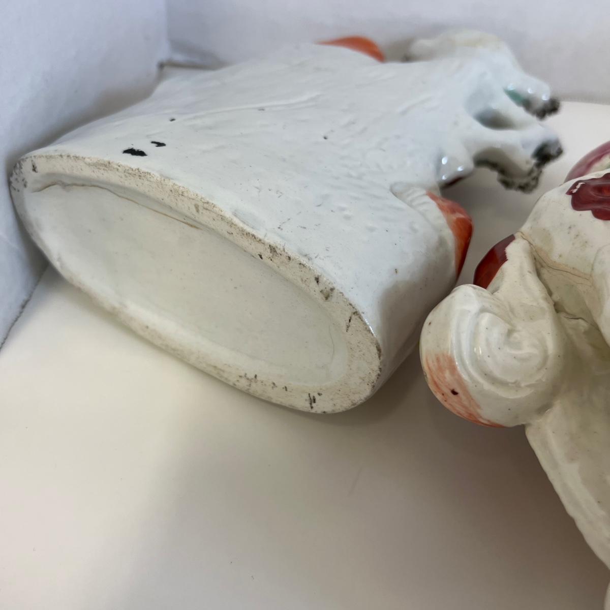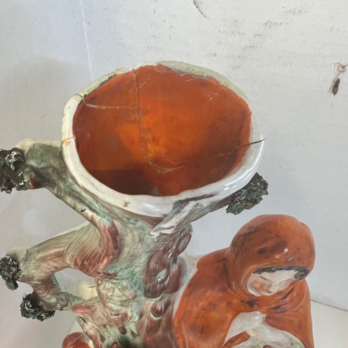 Child with lion measures 7” w x 9” high and has been repaired. The woman figure measures 10” high with repair on top and the man is 10”