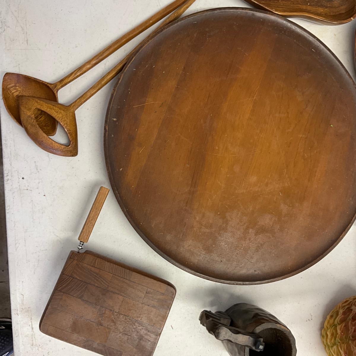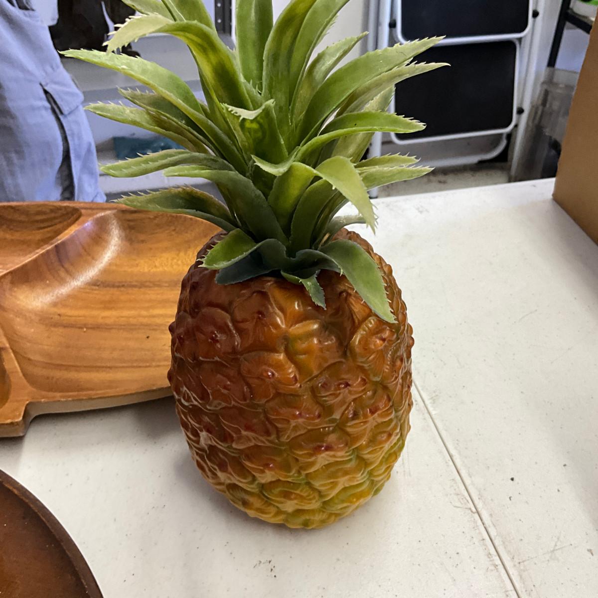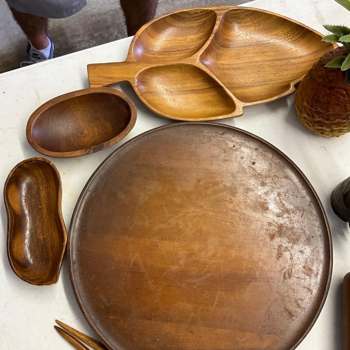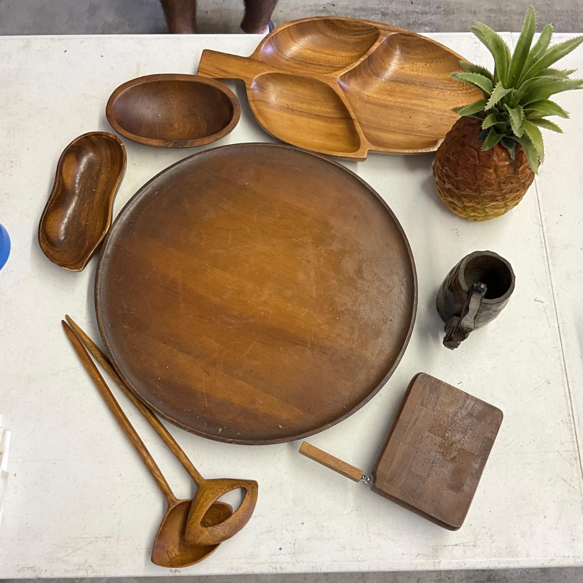 Comes with wooden circle lazy susan, wooden leaf tray, two wooden bowls, pineapple, two serving spoons, small wooden cut block, one wooden cup