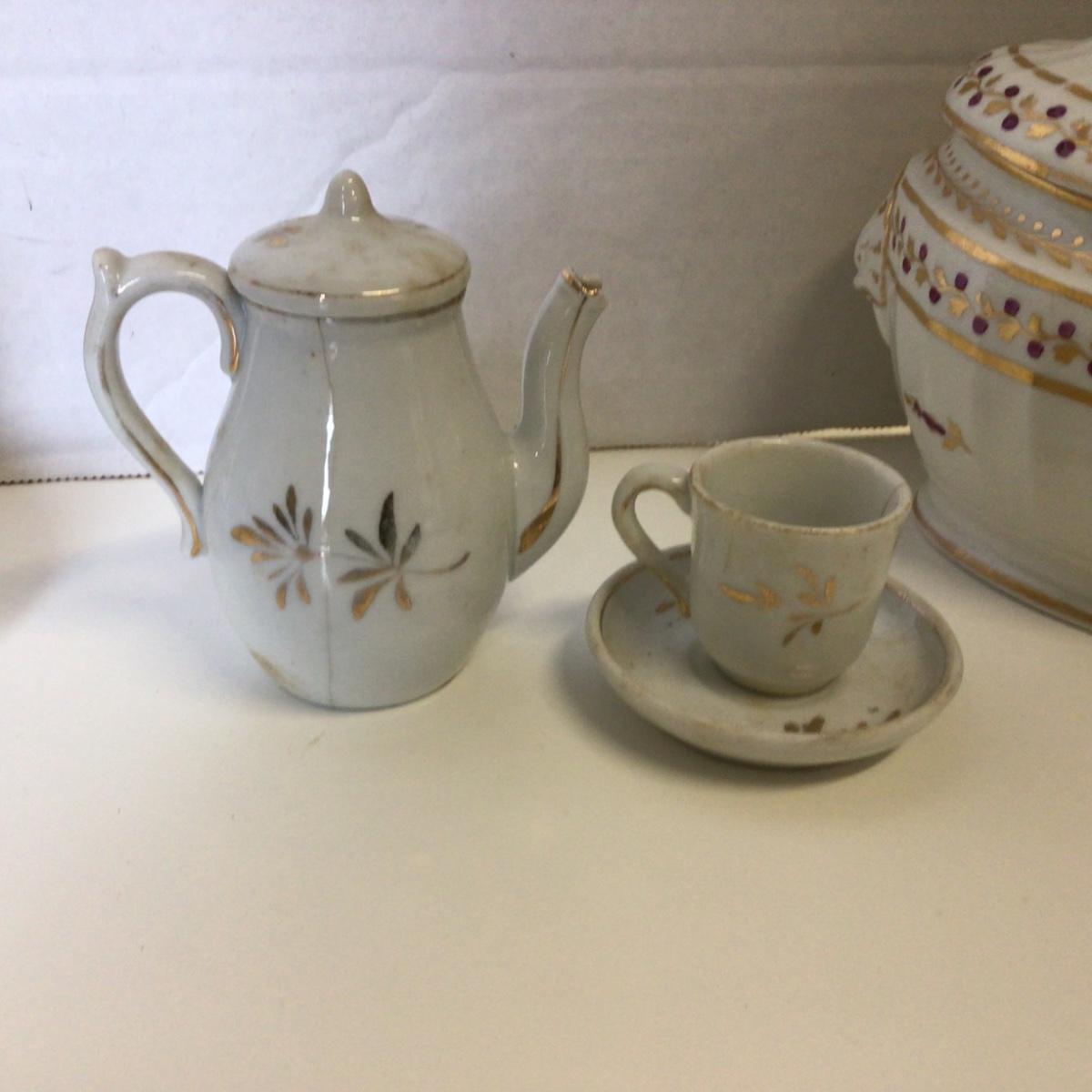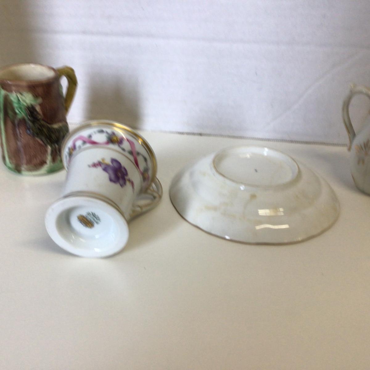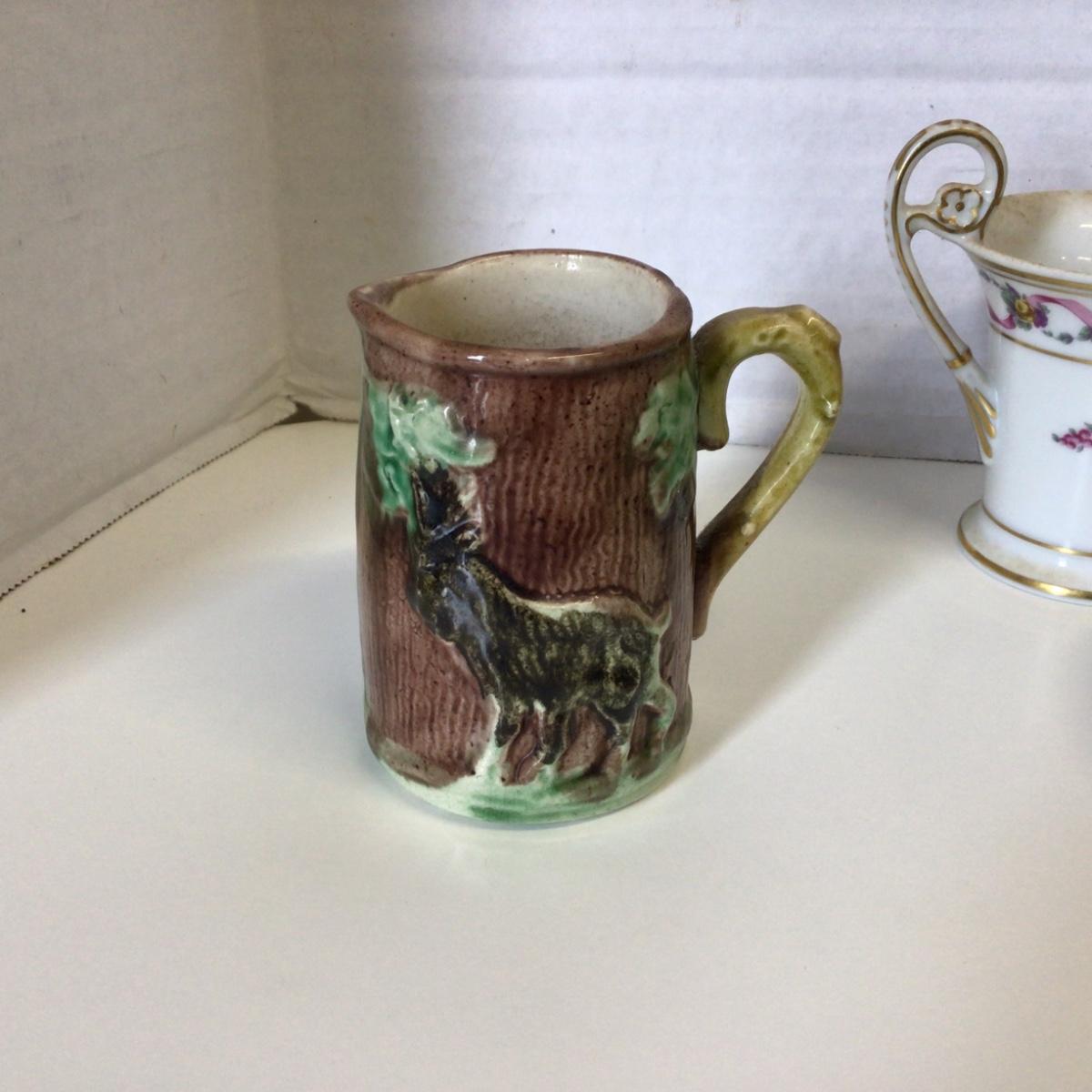 Majolica Moose Creamer measuring 3.25” high , covered tureen measures 6.25” x 6” high with small Childs teapot with chip on spout, with cup and saucer,