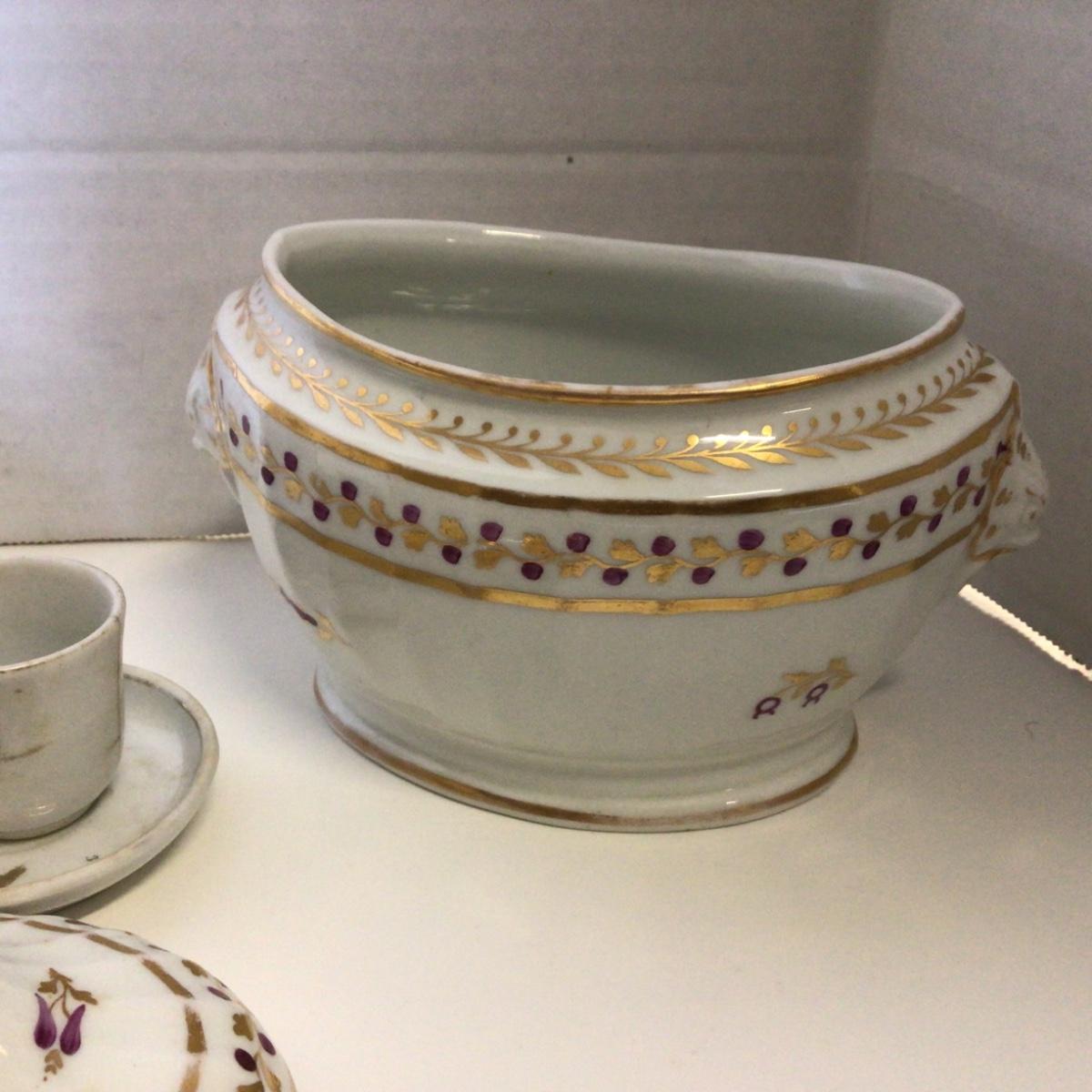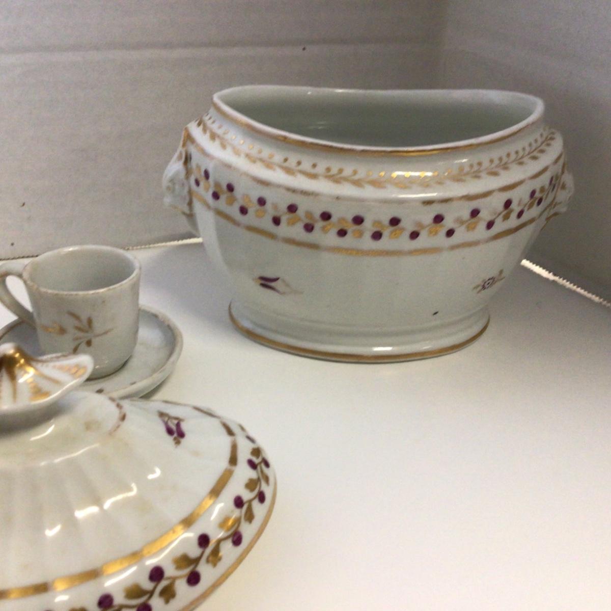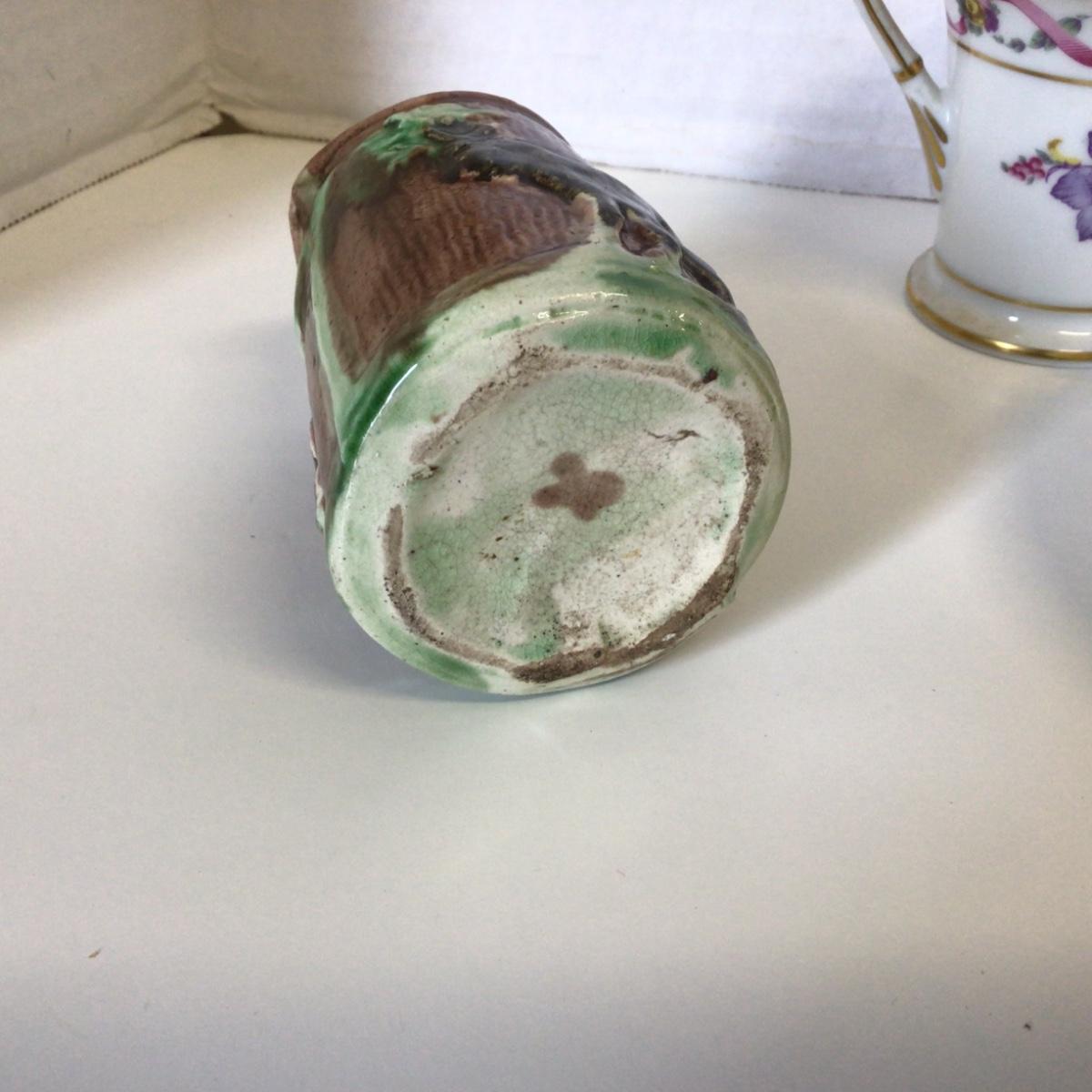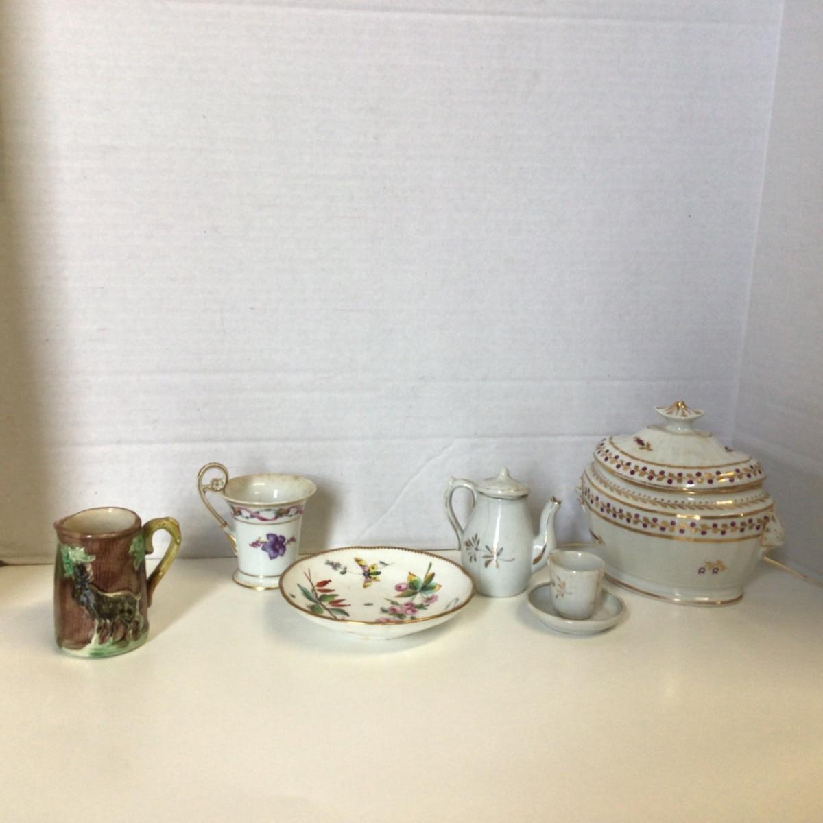 Majolica Moose Creamer measuring 3.25” high , covered tureen measures 6.25” x 6” high with small Childs teapot with chip on spout, with cup and saucer,