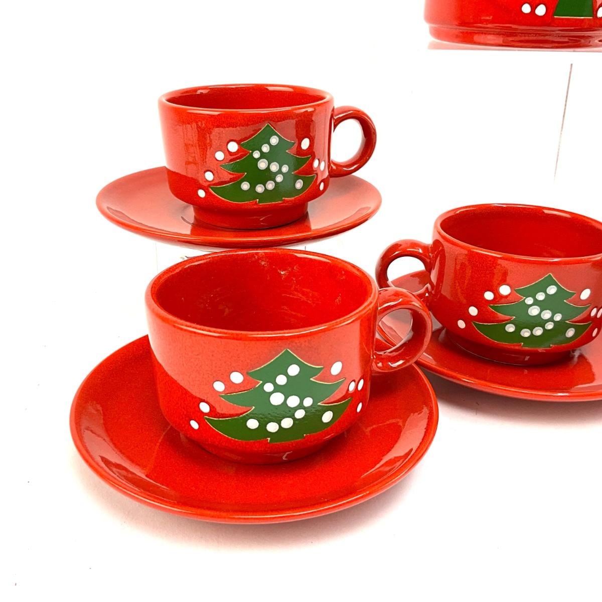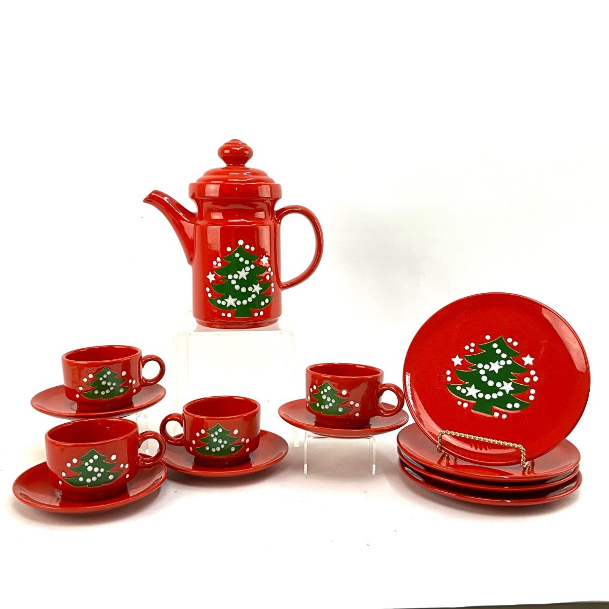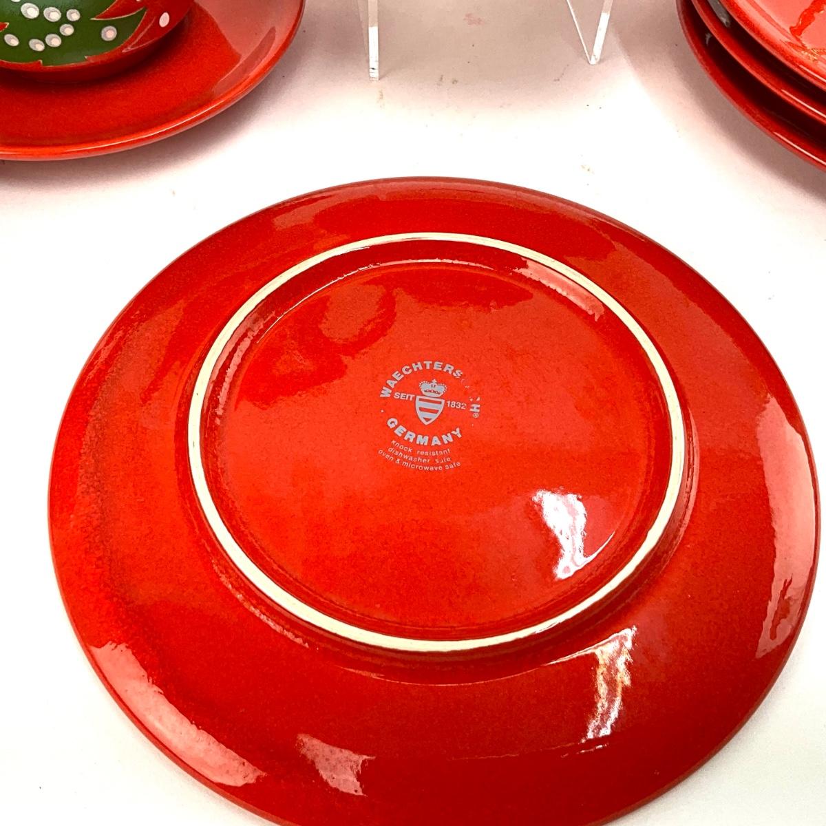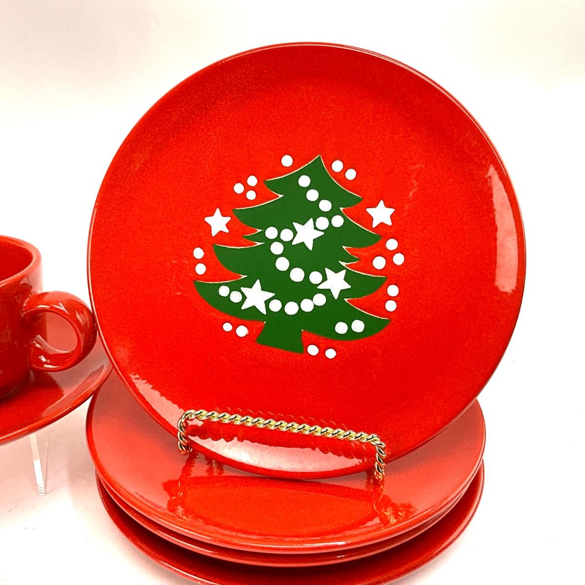 Teapot with 4 red dessert plates measuring 7.75" diameter