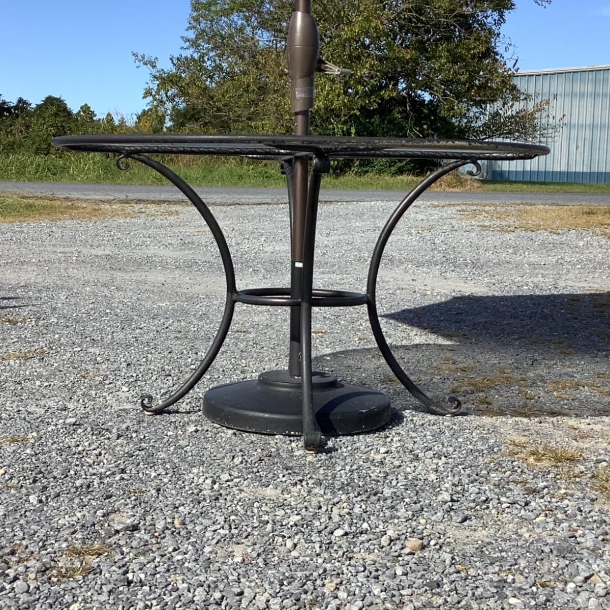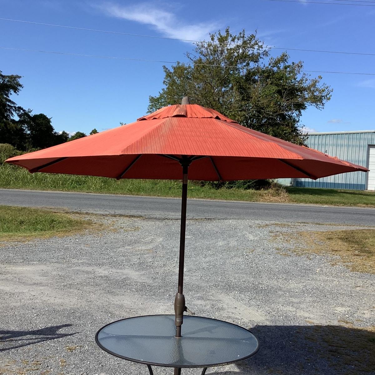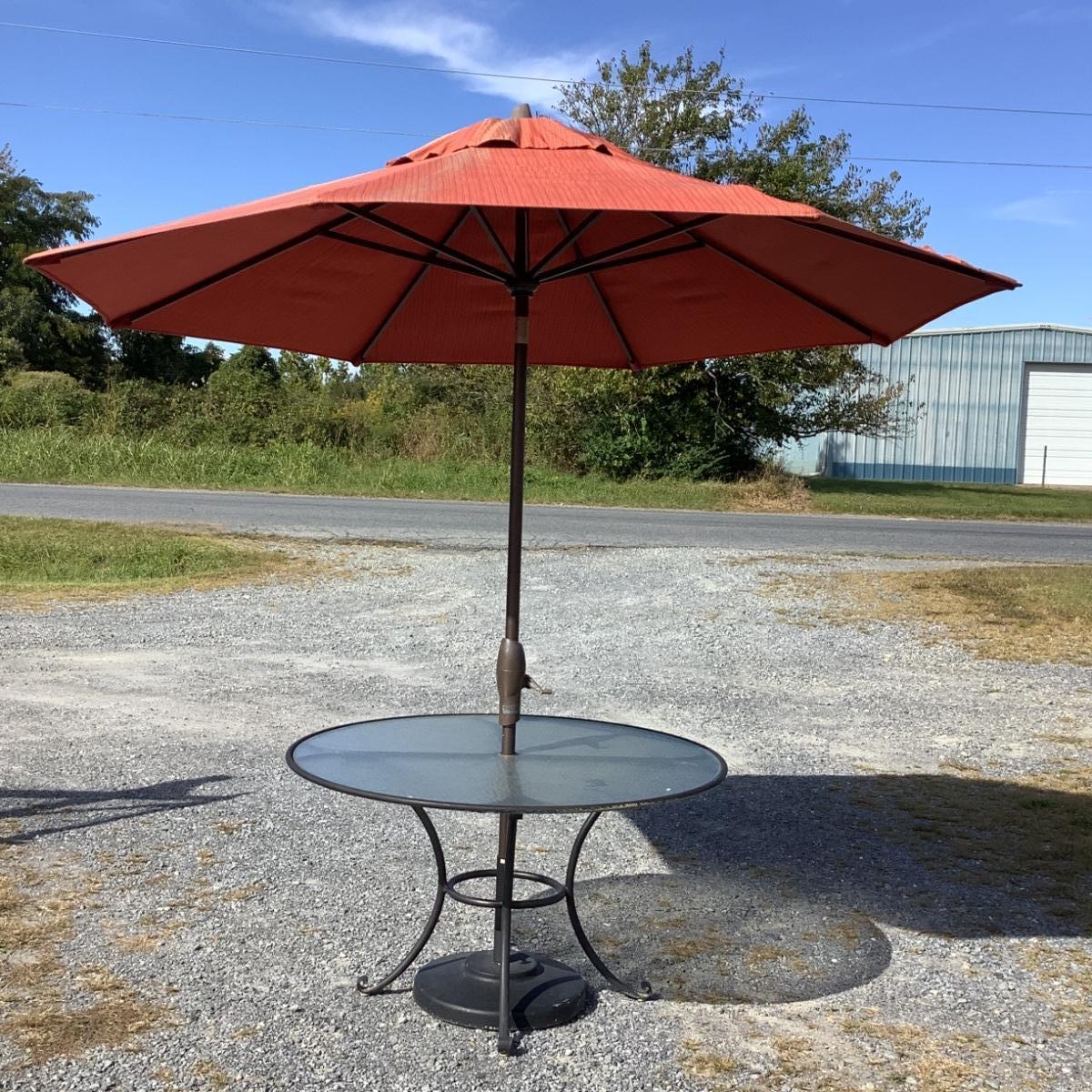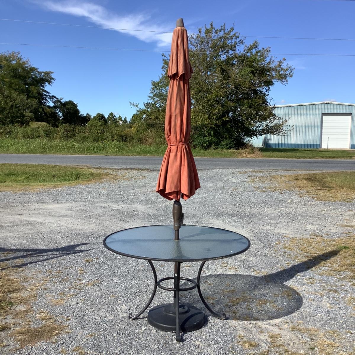 Outdoor Round Glass Top Table & 8' Crank Umbrella.