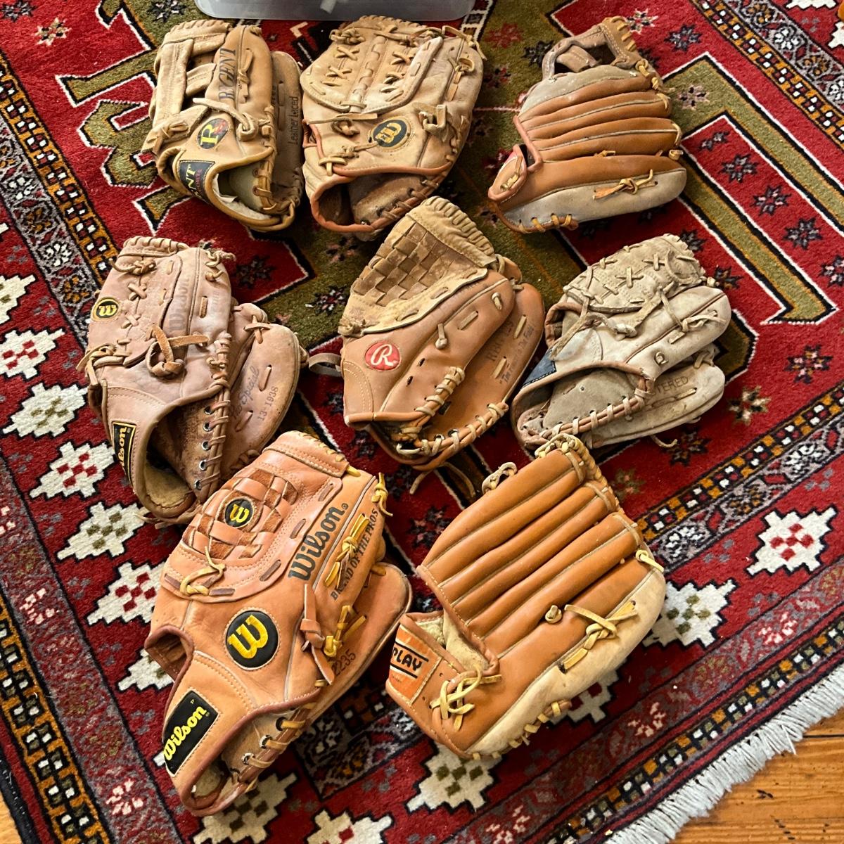 Lot of 8 baseball gloves and balls