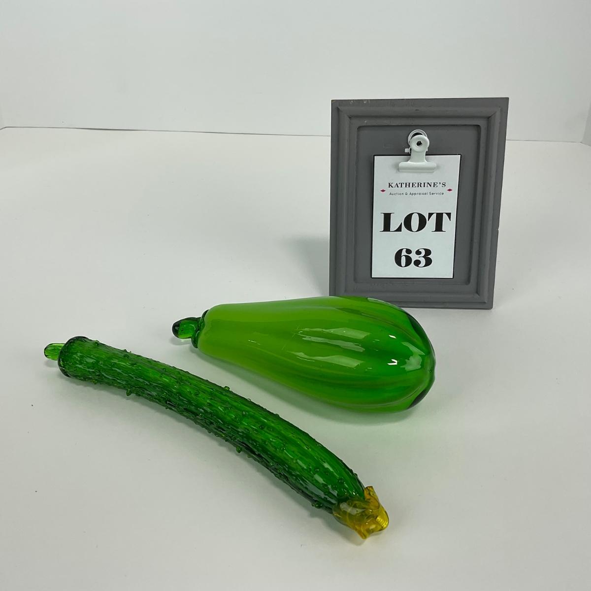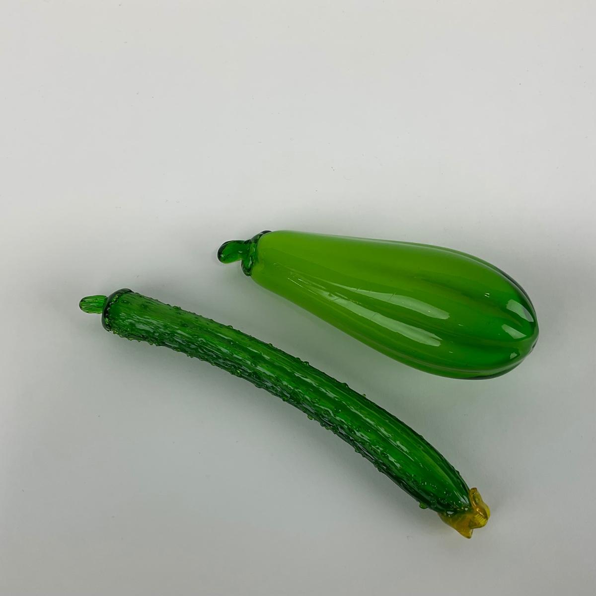 Two vintage art glass green vegetable figures. This piece has no damage, and appears to be in great shape with no visable chips, cracks, or broken pieces. Please see photos for details and condition. Any condition statement is given as a courtesy to a client, is an opinion, and should not be treated as a statement of fact. Reference to condition written, oral or within a condition report shall not be regarded as a full account of condition and may not include all defects, alterations, or restorations. Absence of a condition report does not imply a lot is flawless or lacking imperfections or damage. Katherine’s Auction & Appraisal Service shall have no responsibility for any error or omission. Returns shall not be accepted on the basis of condition. ::: Shipping is available on this lot. If you require shipping you must let us know at the close of the auction. We will coordinate with you after the item has been won. Shipping fees will include insurance up to or exceeding the value of all items being mailed. If you have any questions regarding this lot please contact the auctioneer either via this website, by direct email or by phone. PICK UP TIMES and other important information can be found in the TERMS and DESCRIPTION of the auction. Please take a look for pertinent information. Thanks!