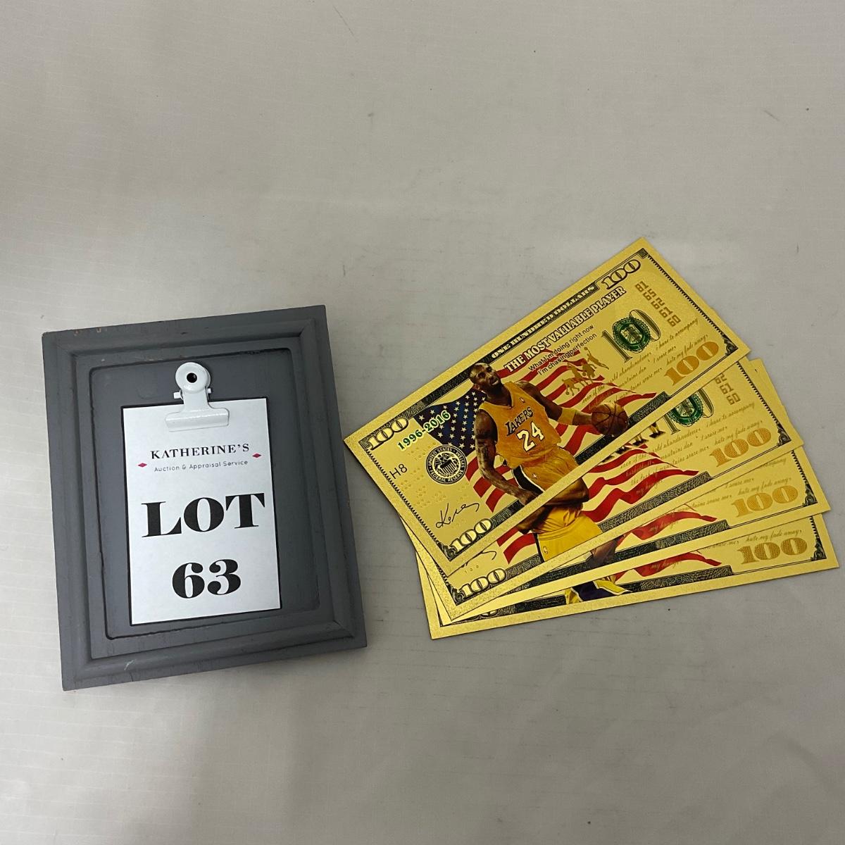 Four Kobe Bryant gold foil collectible fake 100 dollar bills. Please see photos for details and condition. ::: Shipping is available on this lot. If you require shipping you must let us know at the close of the auction. We will coordinate with you after the item has been won. Shipping fees will include insurance up to or exceeding the value of all items being mailed. If you have any questions regarding this lot please contact the auctioneer either via this website, by direct email or by phone. PICK UP TIMES and other important information can be found in the TERMS and DESCRIPTION of the auction. Please take a look for pertinent information. Thanks!