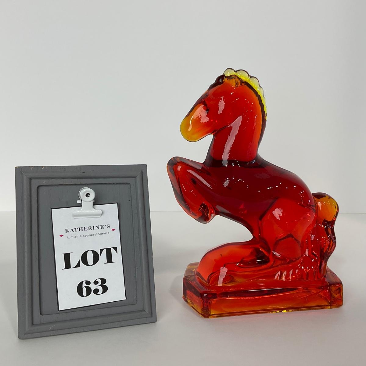 One LE Smith red Amberina rearing horse bookend. 6 inches wide by 8 inches tall. This piece has no damage, and appears to be in great shape with no visable chips, cracks, or broken pieces. Please see photos for details and condition. Any condition statement is given as a courtesy to a client, is an opinion, and should not be treated as a statement of fact. Reference to condition written, oral or within a condition report shall not be regarded as a full account of condition and may not include all defects, alterations, or restorations. Absence of a condition report does not imply a lot is flawless or lacking imperfections or damage. Katherine’s Auction & Appraisal Service shall have no responsibility for any error or omission. Returns shall not be accepted on the basis of condition. ::: Shipping is available on this lot. If you require shipping you must let us know at the close of the auction. We will coordinate with you after the item has been won. Shipping fees will include insurance up to or exceeding the value of all items being mailed. If you have any questions regarding this lot please contact the auctioneer either via this website, by direct email or by phone. PICK UP TIMES and other important information can be found in the TERMS and DESCRIPTION of the auction. Please take a look for pertinent information. Thanks!