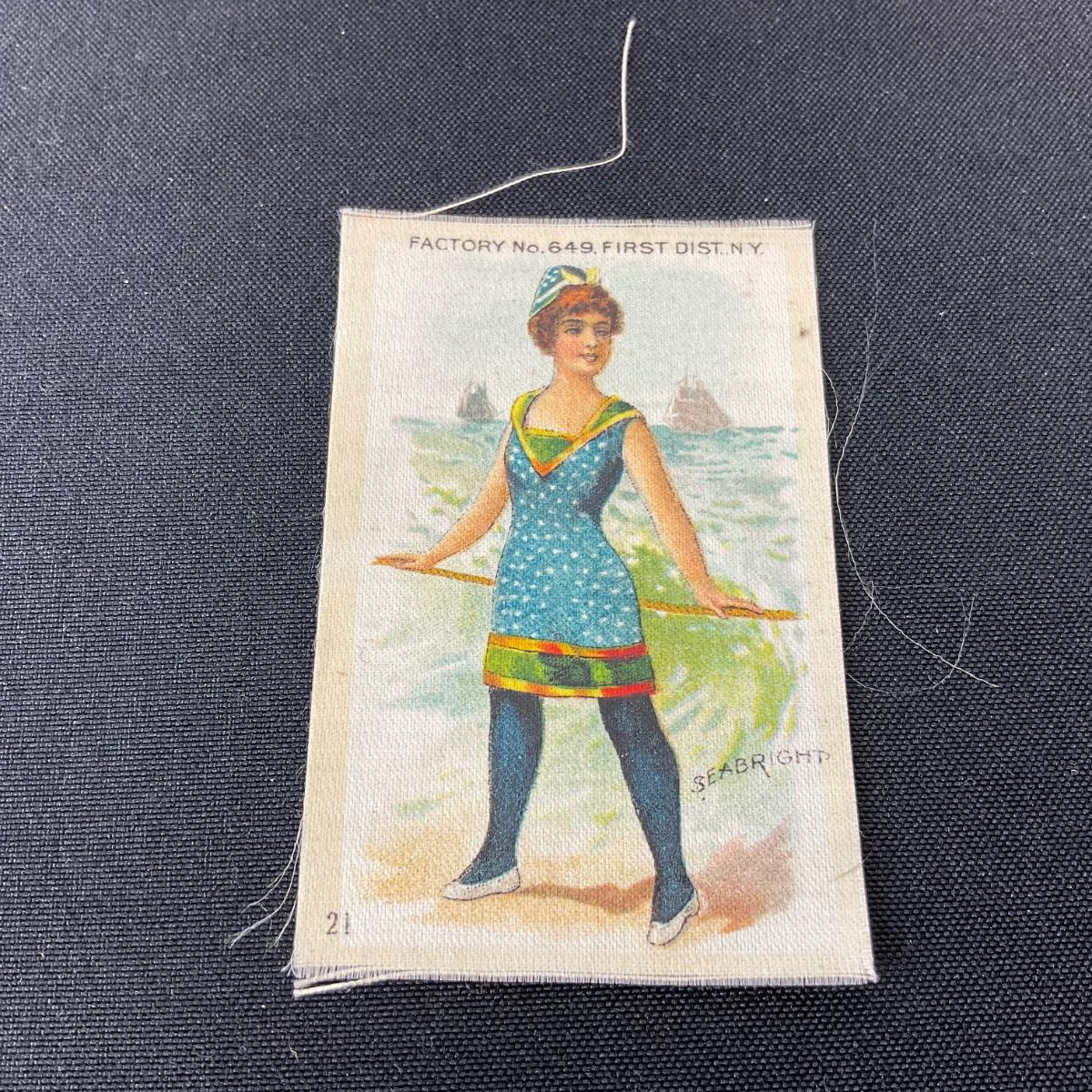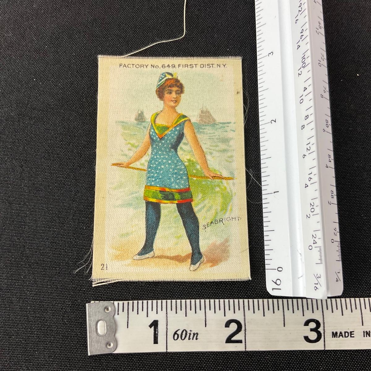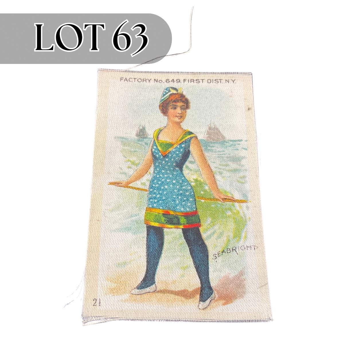 One antique Edwardian bathing beauty tobacco silk. #21 Seabright silk. Please see photos for details and condition. Any condition statement is given as a courtesy to a client, is an opinion, and should not be treated as a statement of fact. Reference to condition written, oral or within a condition report shall not be regarded as a full account of condition and may not include all defects, alterations, or restorations. Absence of a condition report does not imply a lot is flawless or lacking imperfections or damage. Katherine’s Auction & Appraisal Service shall have no responsibility for any error or omission. Returns shall not be accepted on the basis of condition. ::: Shipping is available on this lot. If you require shipping you must let us know at the close of the auction. We will coordinate with you after the item has been won. Shipping fees will include insurance up to or exceeding the value of all items being mailed. If you have any questions regarding this lot please contact the auctioneer either via this website, by direct email or by phone. PICK UP TIMES and other important information can be found in the TERMS and DESCRIPTION of the auction. Please take a look for pertinent information. Thanks!