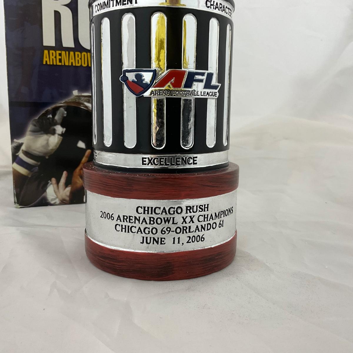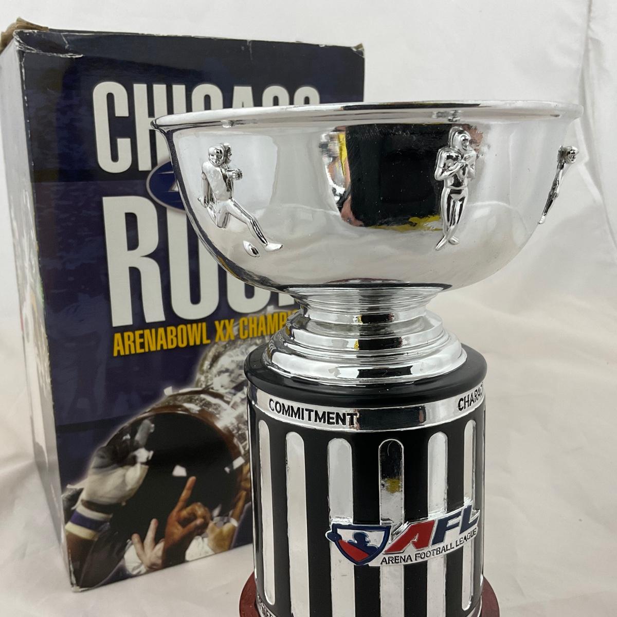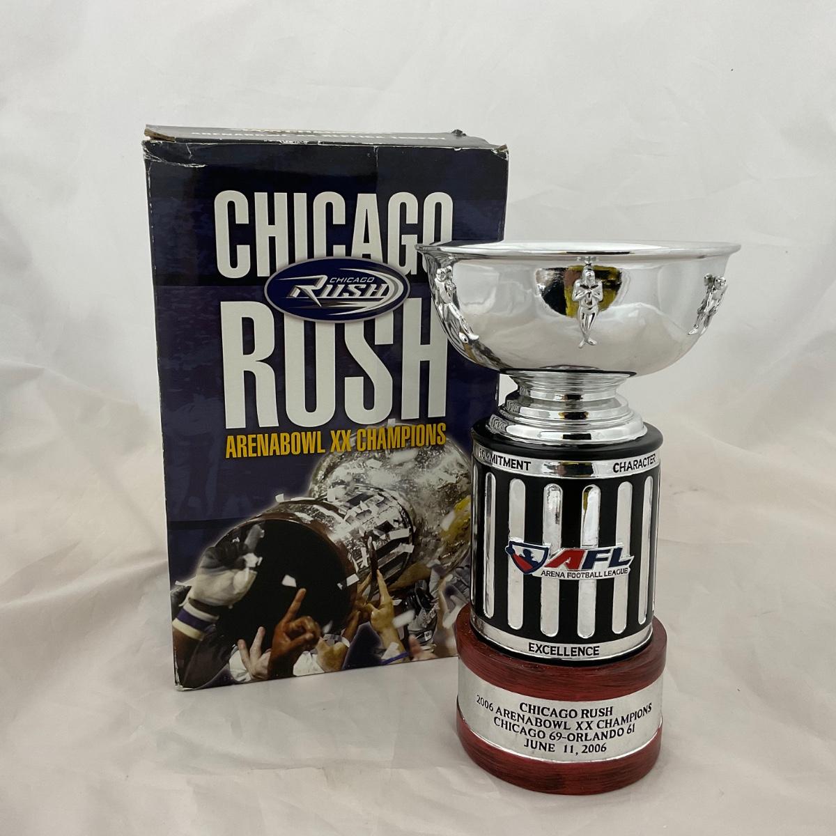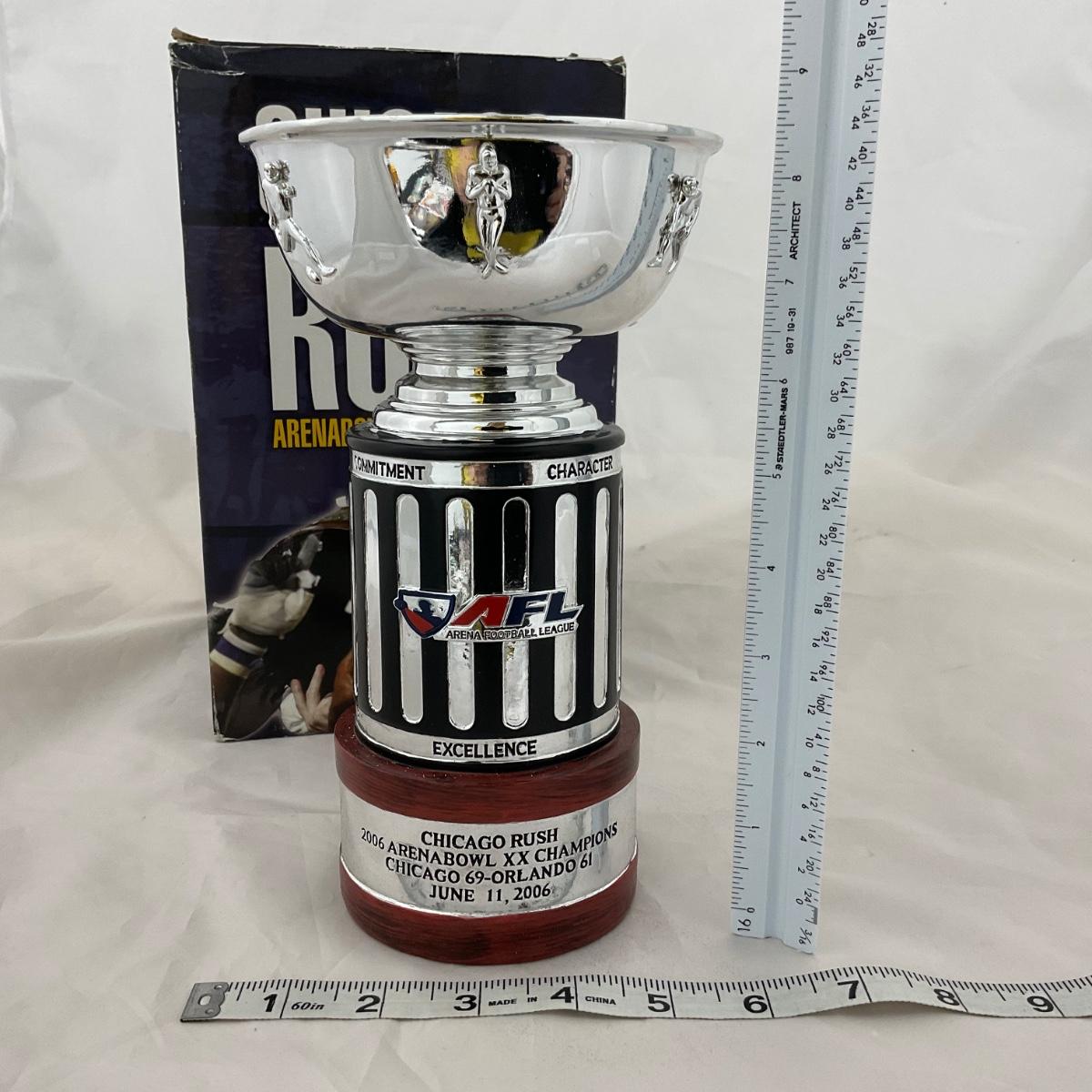 One collectors Chicago Rush Trophy from Arenabowl XX Replica Trophy. Please see photos for details and condition. ::: Shipping is available on this lot. If you require shipping you must let us know at the close of the auction. We will coordinate with you after the item has been won. Shipping fees will include insurance up to or exceeding the value of all items being mailed. If you have any questions regarding this lot please contact the auctioneer either via this website, by direct email or by phone. PICK UP TIMES and other important information can be found in the TERMS and DESCRIPTION of the auction. Please take a look for pertinent information. Thanks!