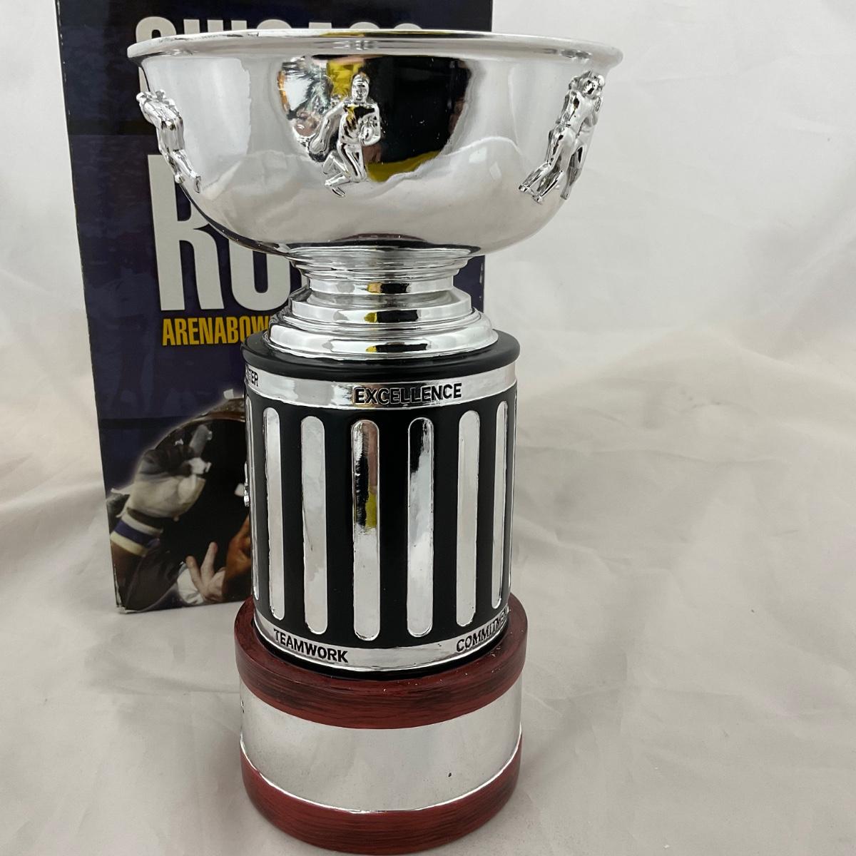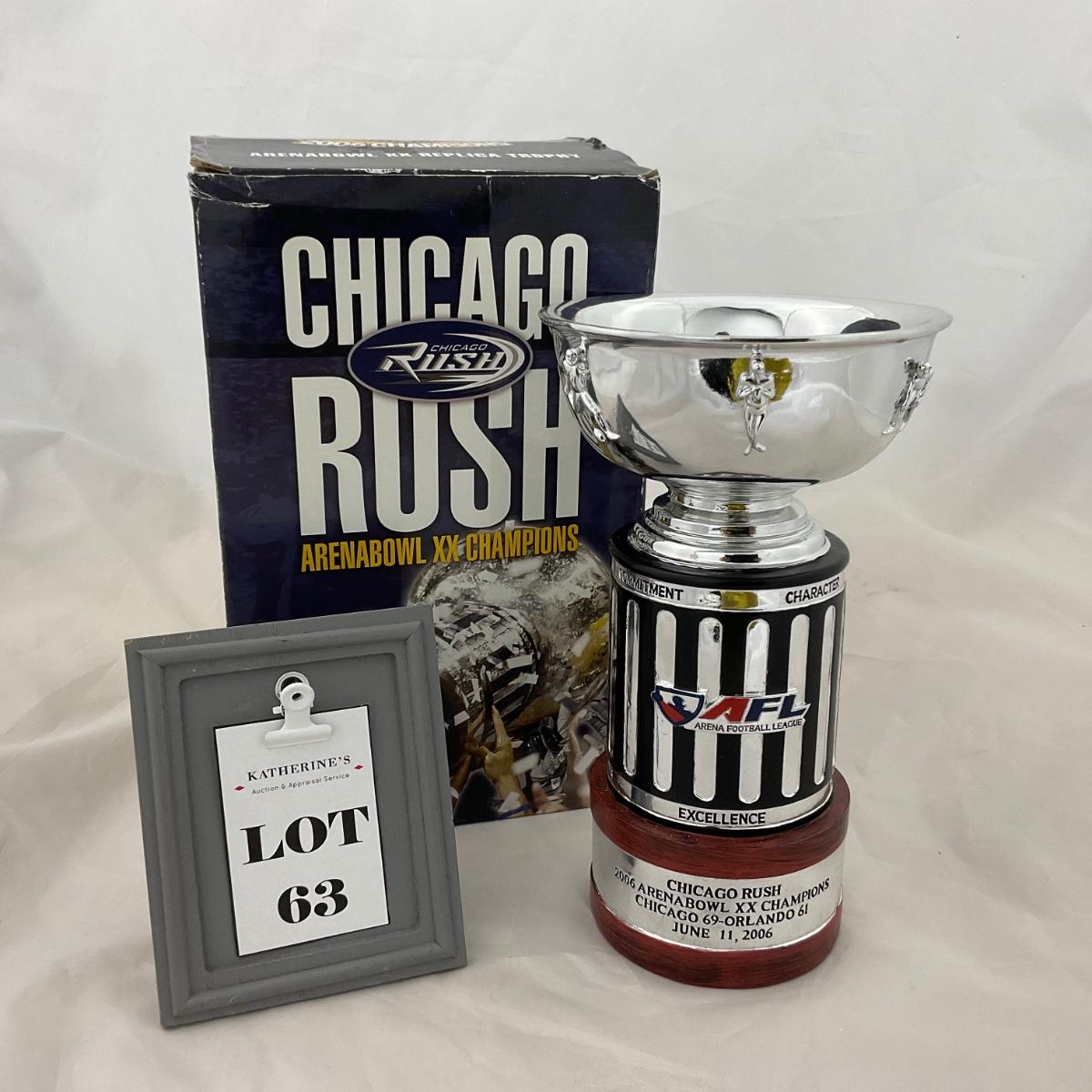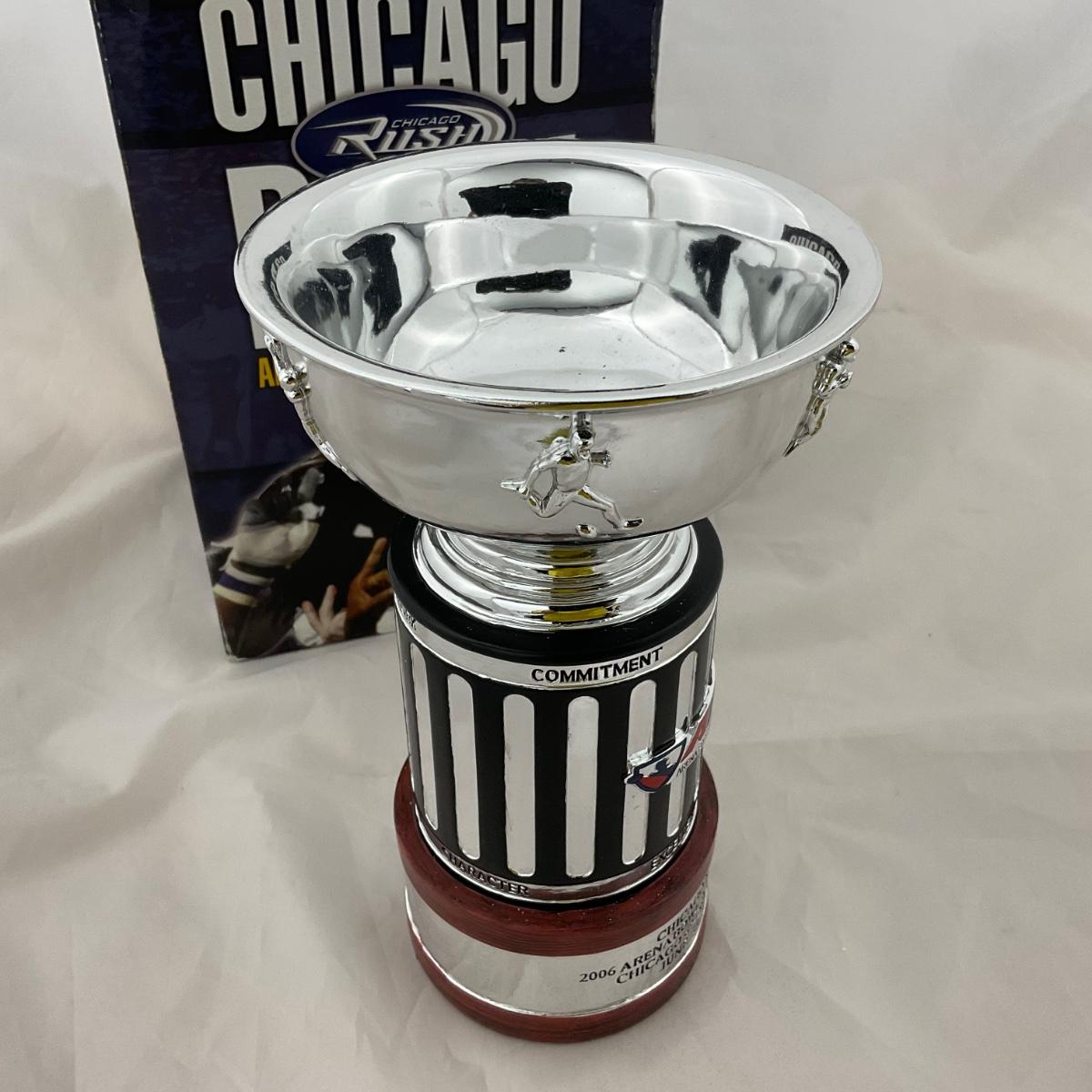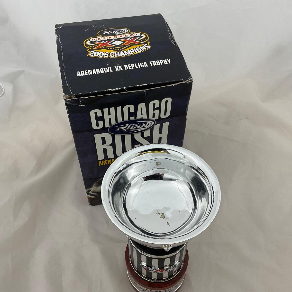 One collectors Chicago Rush Trophy from Arenabowl XX Replica Trophy. Please see photos for details and condition. ::: Shipping is available on this lot. If you require shipping you must let us know at the close of the auction. We will coordinate with you after the item has been won. Shipping fees will include insurance up to or exceeding the value of all items being mailed. If you have any questions regarding this lot please contact the auctioneer either via this website, by direct email or by phone. PICK UP TIMES and other important information can be found in the TERMS and DESCRIPTION of the auction. Please take a look for pertinent information. Thanks!