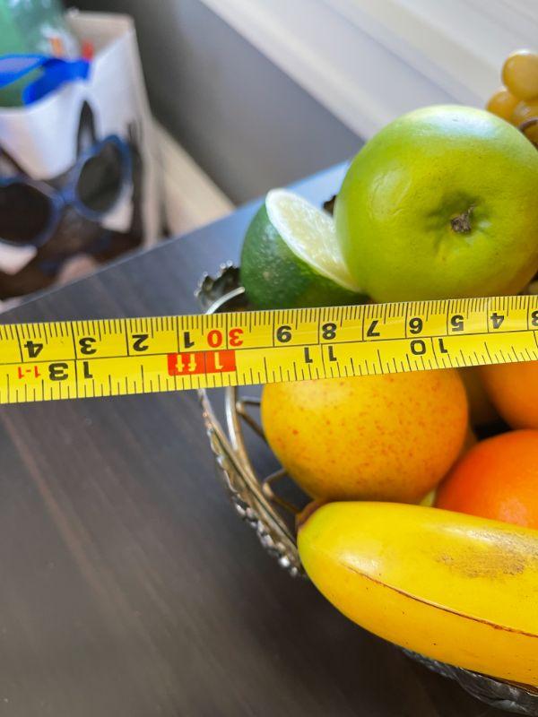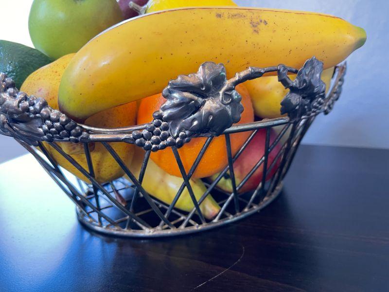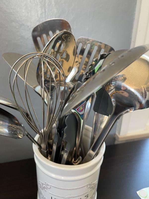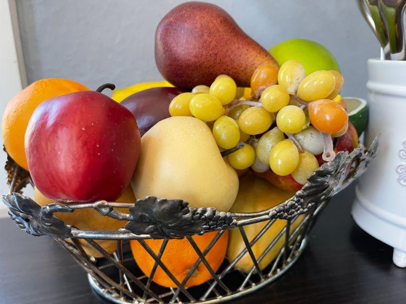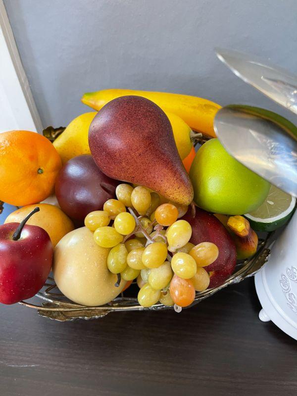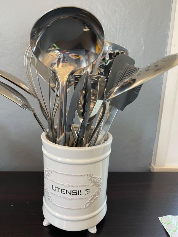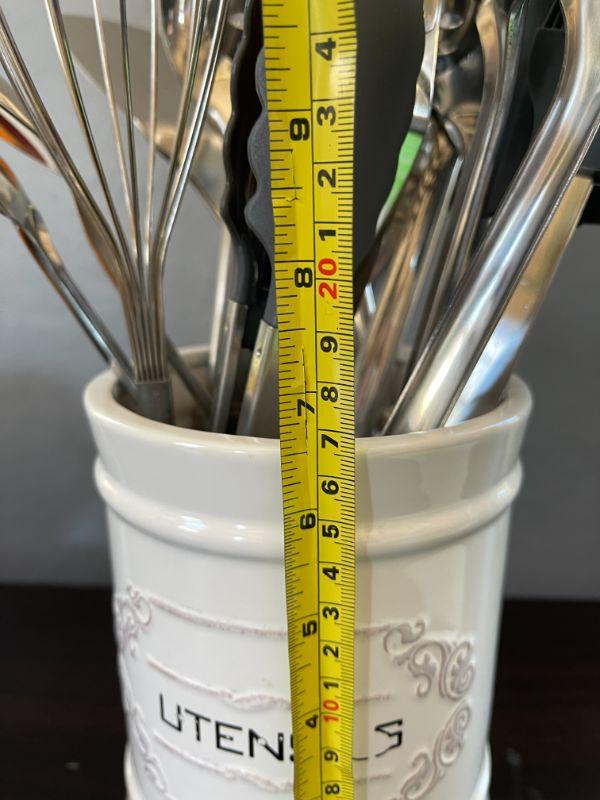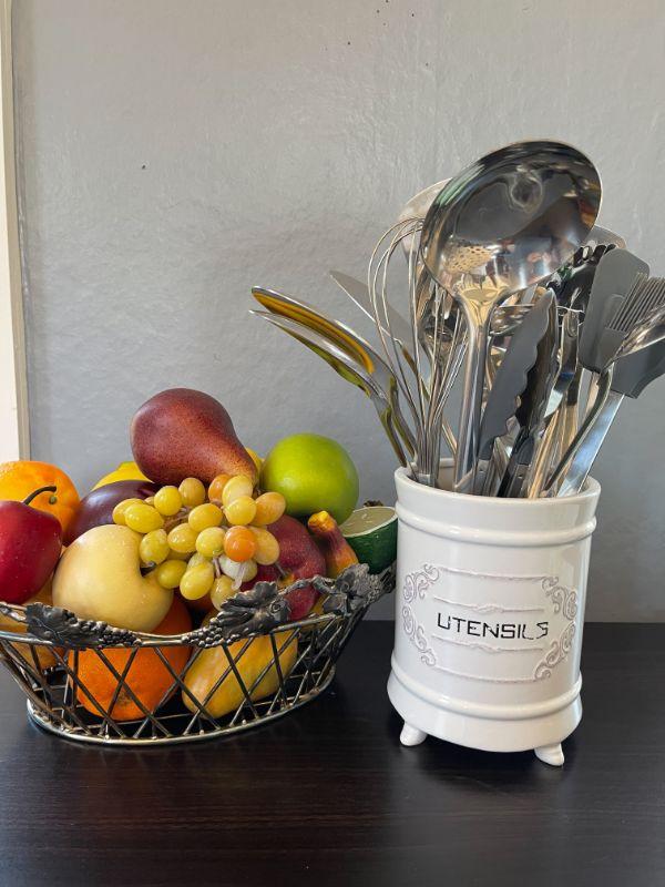 Nice set of kitchen utensils with holder. Plastic fruit in wire basket