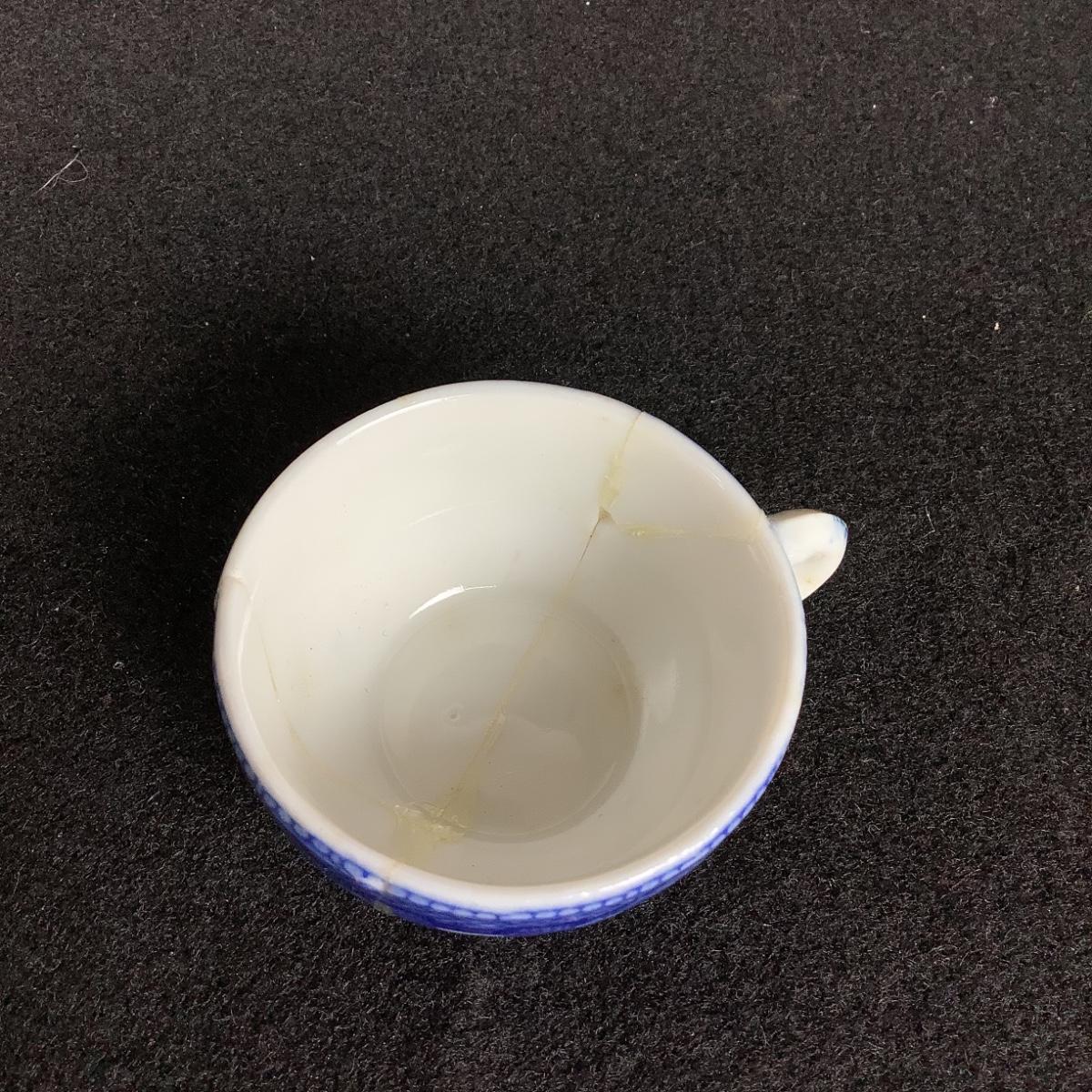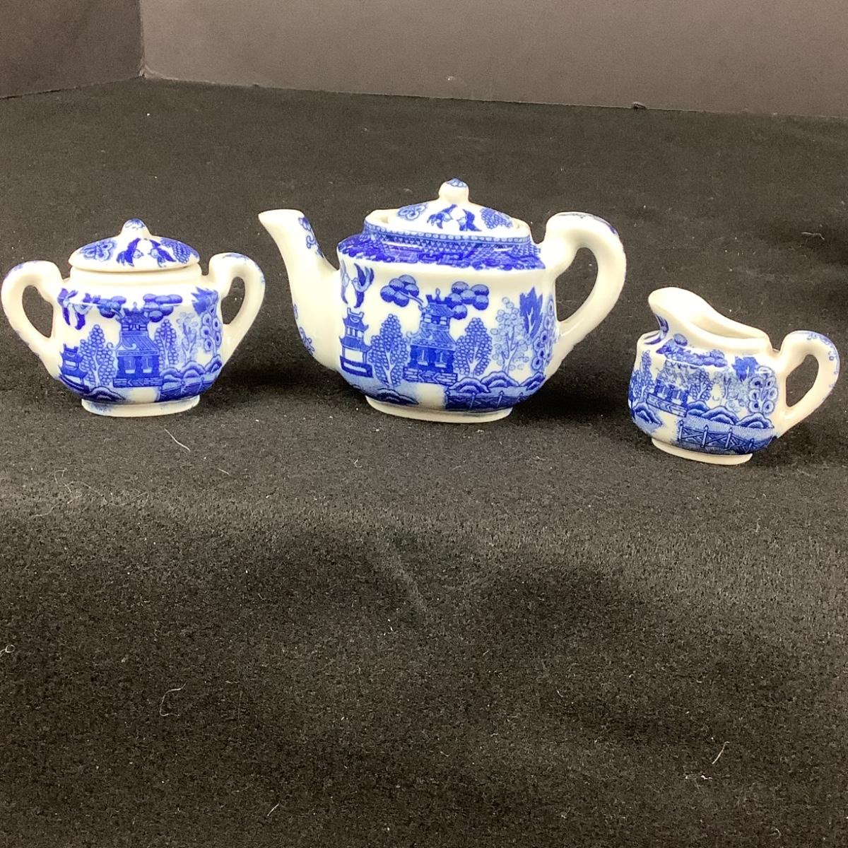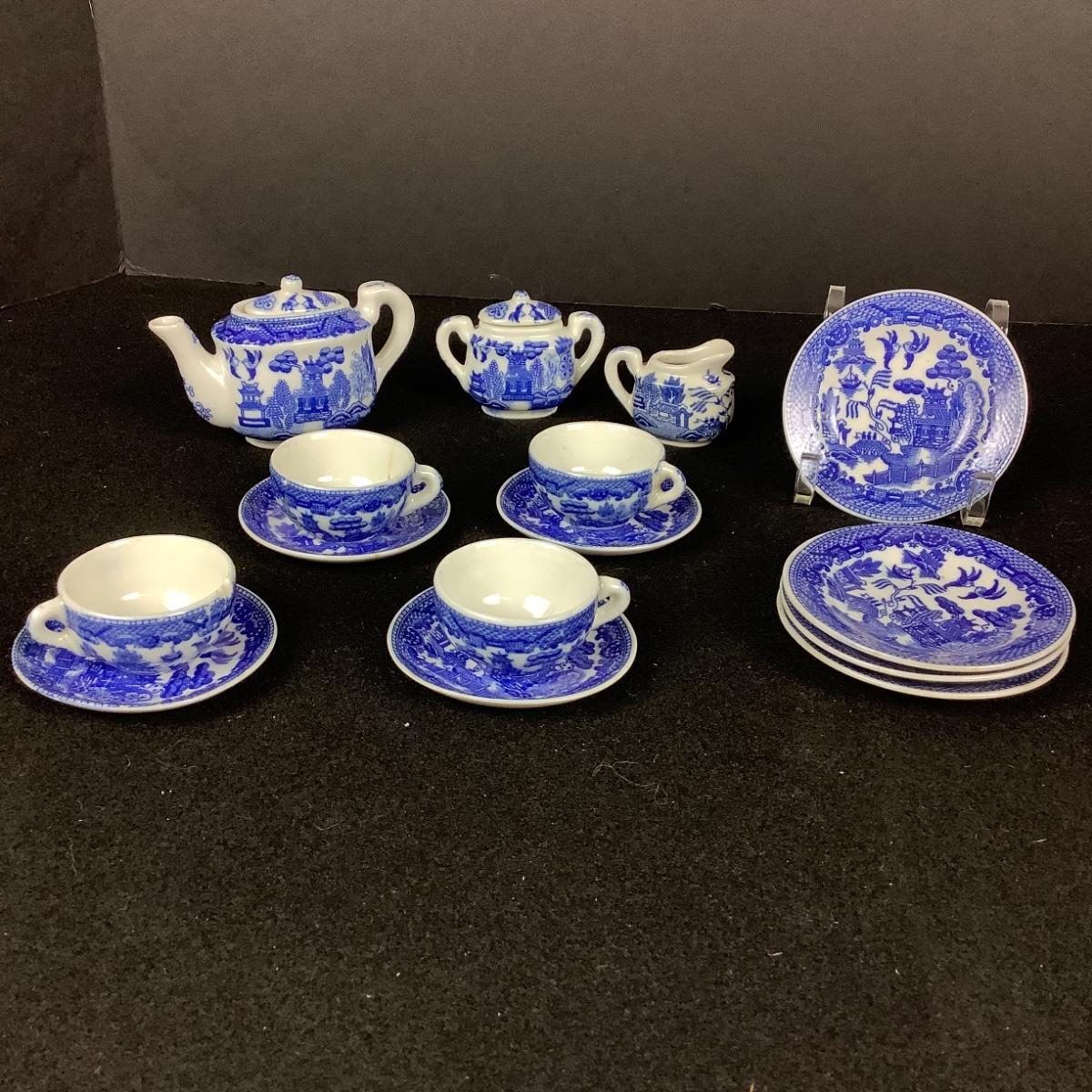 Childs Blue Willow Tea Set 15pcs. 1 Cup has been repaired, 1 Cup has chip. See Pictures!