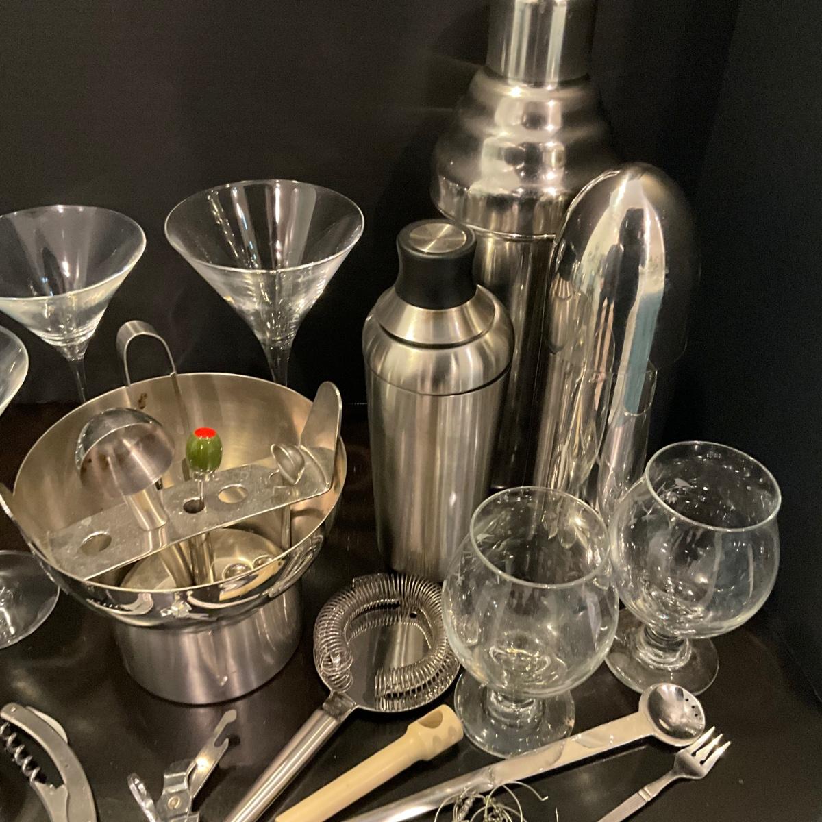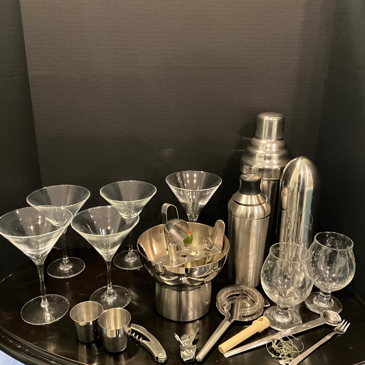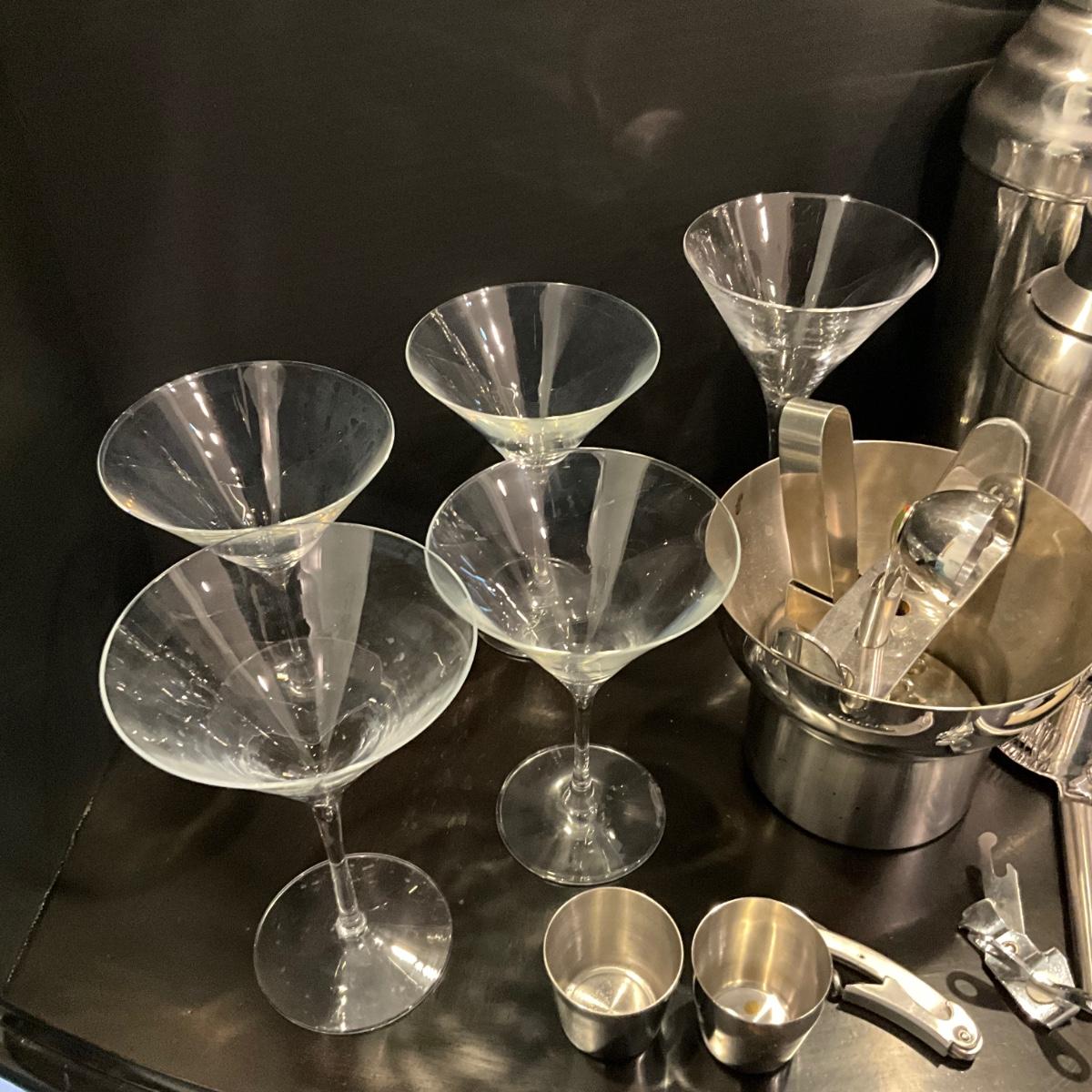 Set of 5 martini glasses, OXO shaker, Crate and Barrel barware holder and more