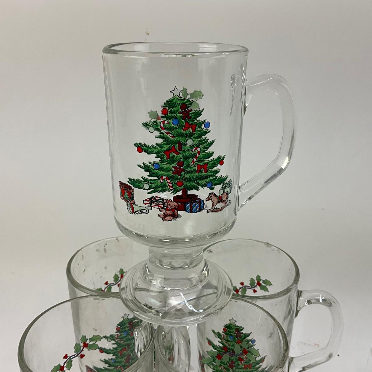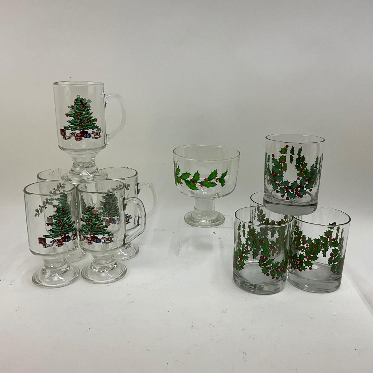 Set of 5 spode pattern christmas tree clear glass coffee mugs with 4 holly design rocks glasses, and one pedestal dessert glass