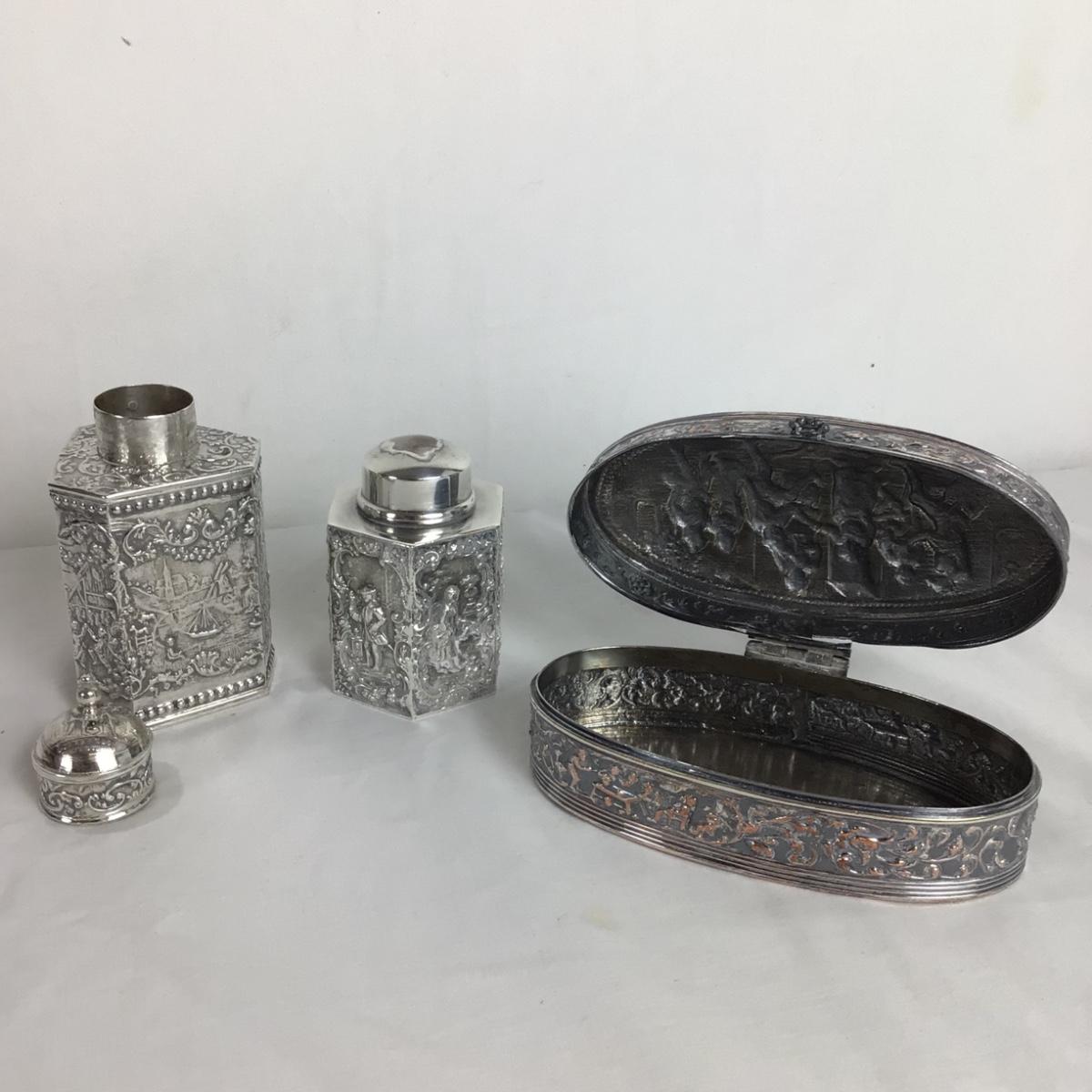 Silver Plate Tea Caddy’s & Copper Over Silver Jewelry Box.