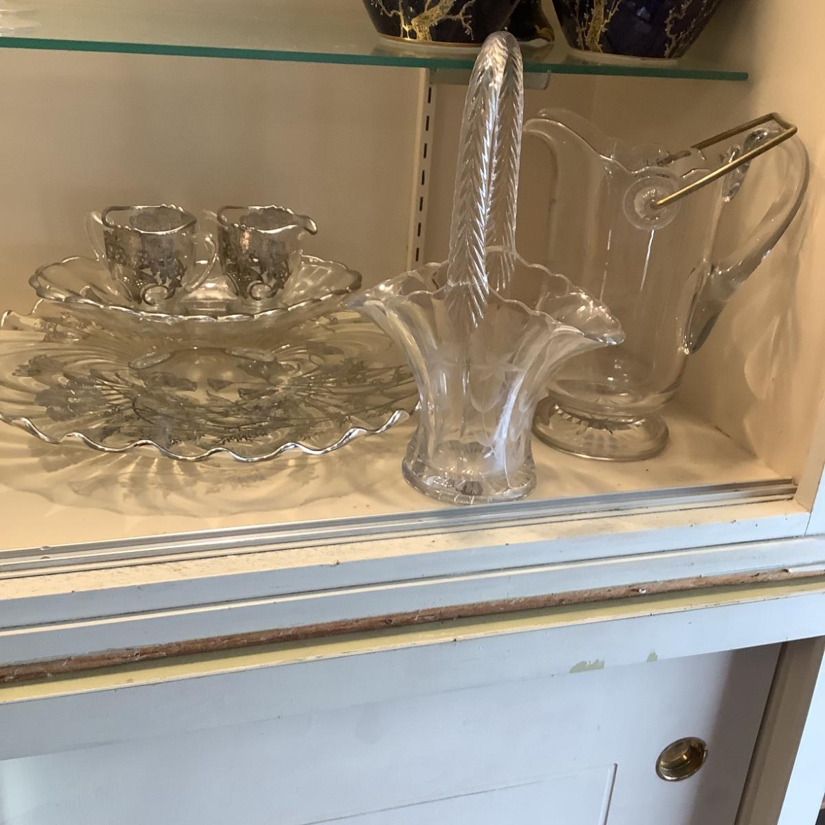 633 Antique Victorian Glass Water Pitcher with Victorian Glass Flower Basket and more