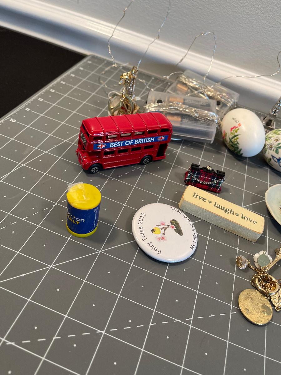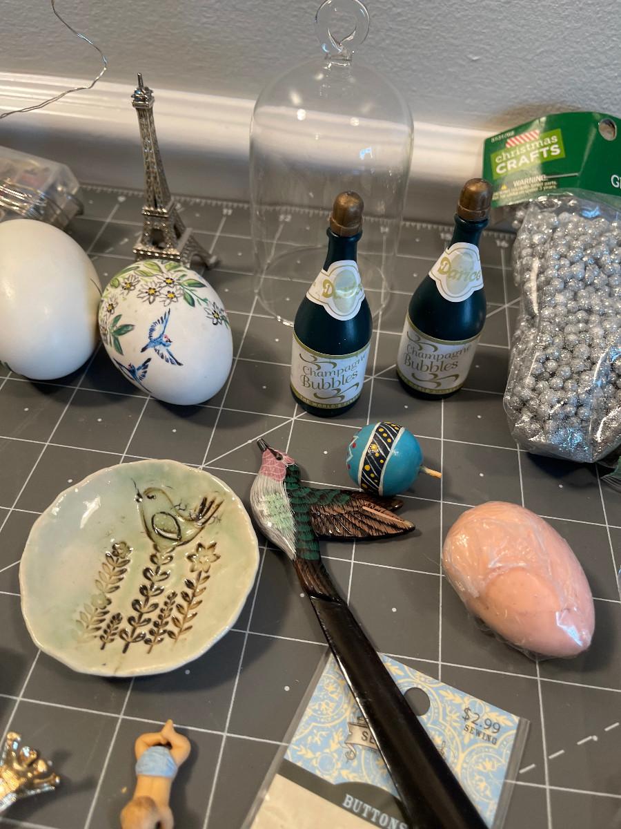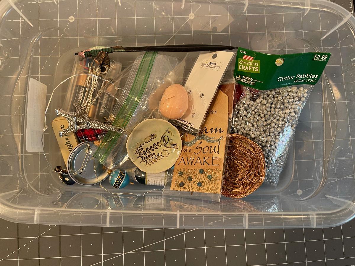#633 Bin of odds & ends; doll house, crafting items