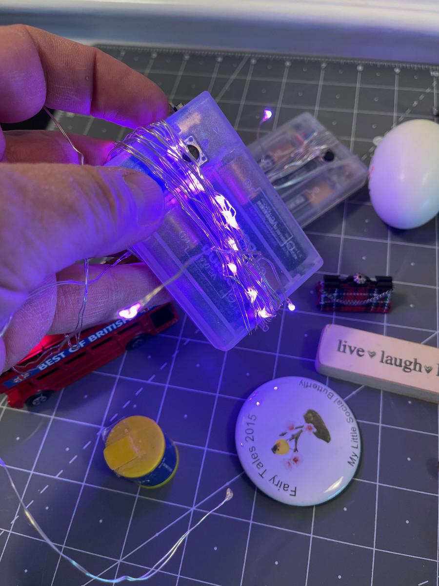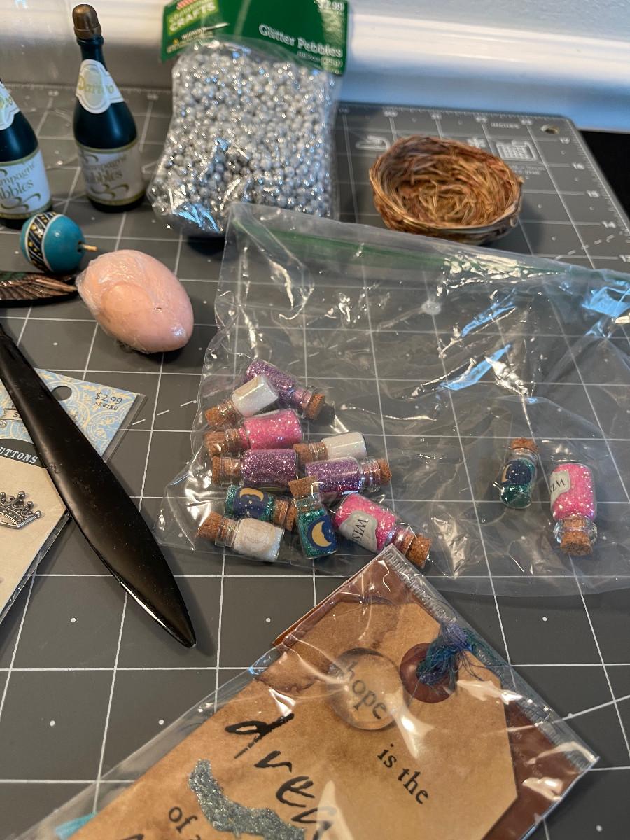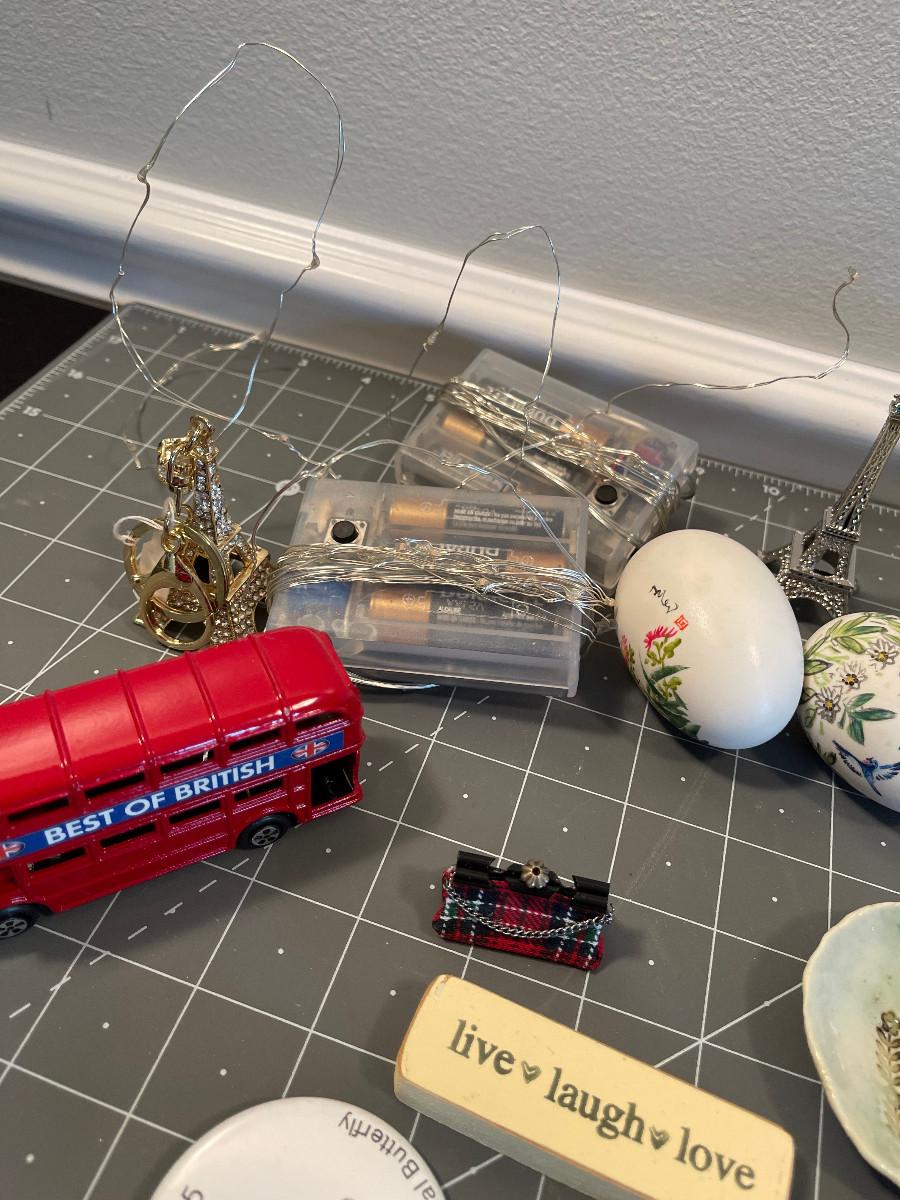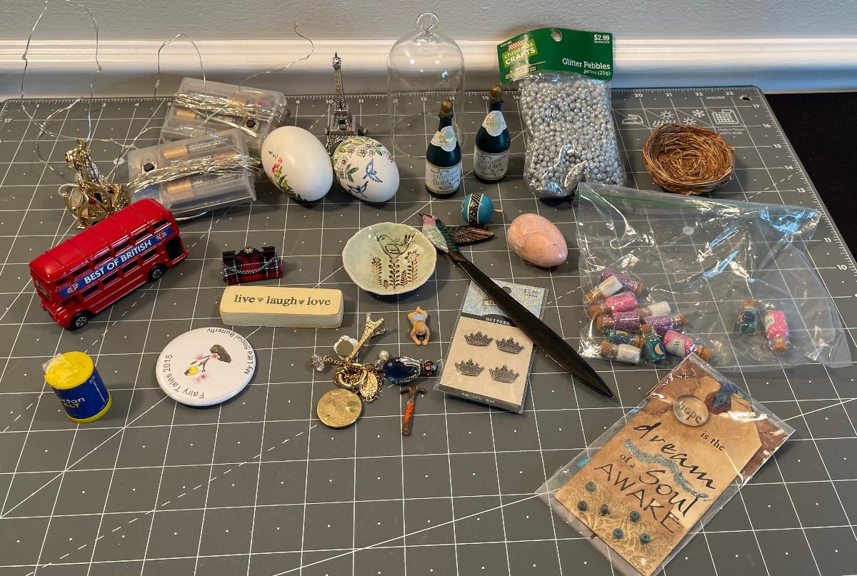 #633 Bin of odds & ends; doll house, crafting items