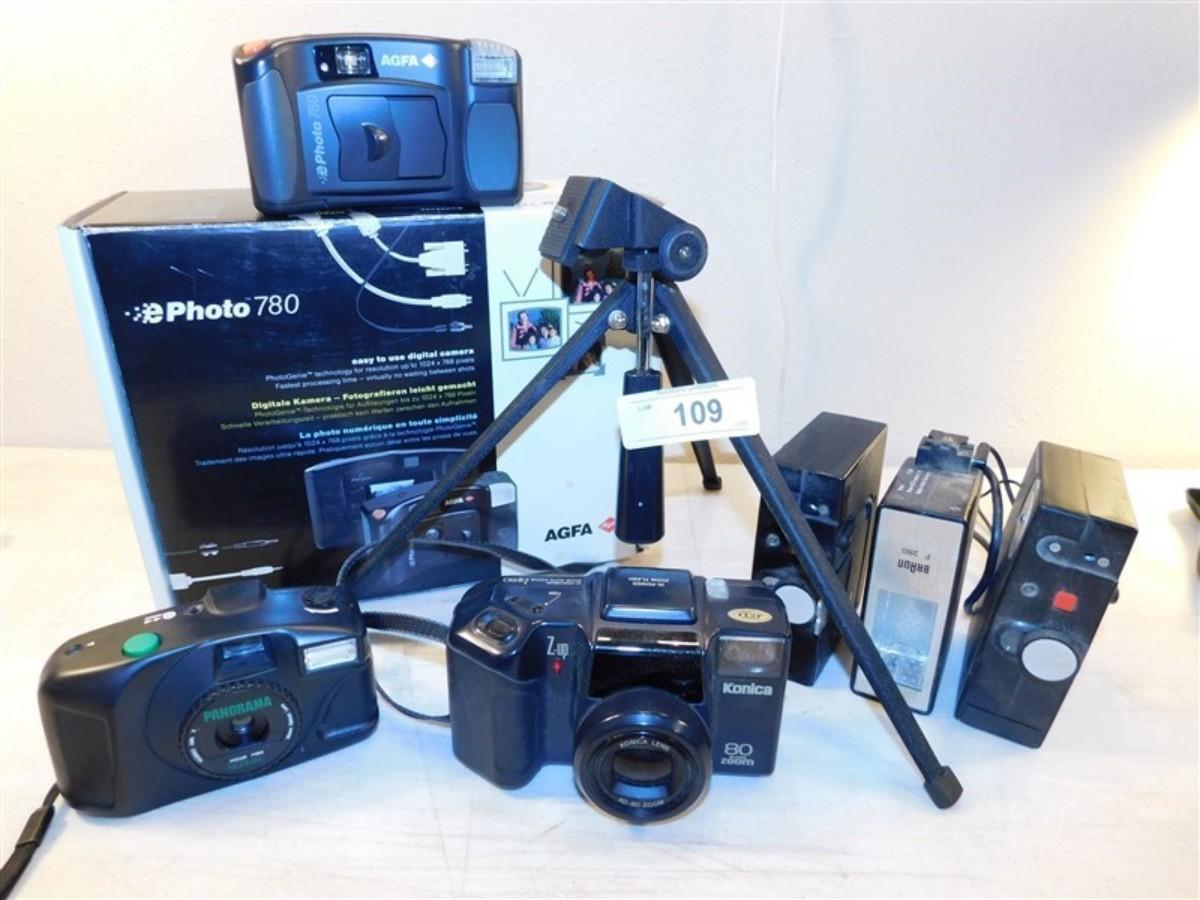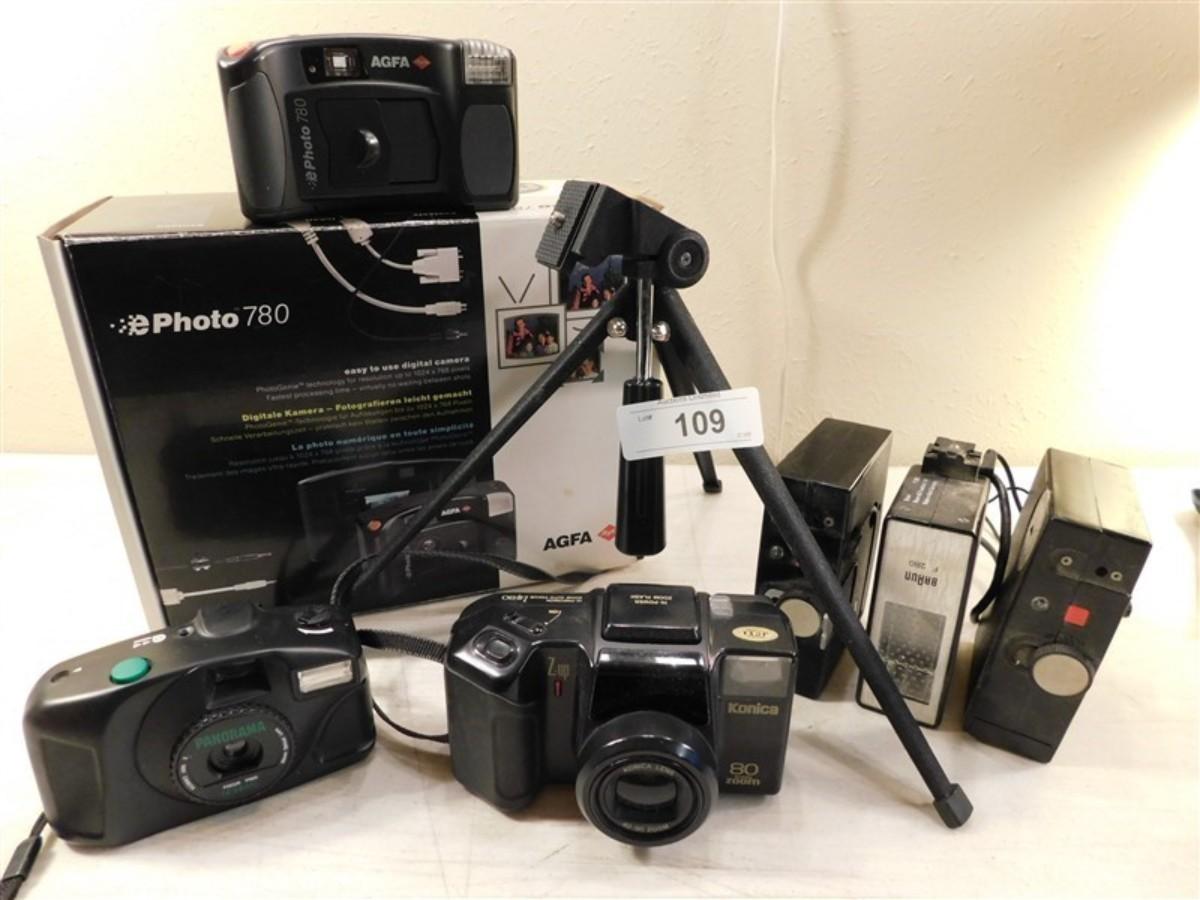 6337/109 Lot of Cameras ~ Konica 80200M Panorama Camera / AGFA Photo 780 3 Meters / Tripod