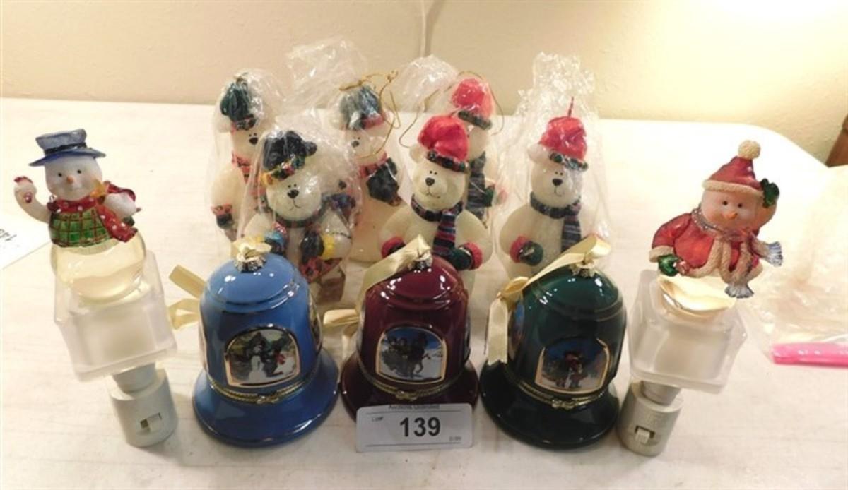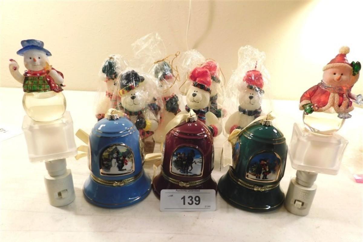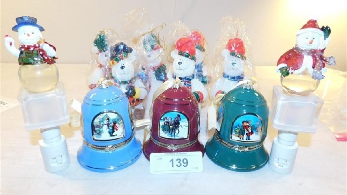6337/139 Lot of Snowman ~ 6 Snowman Candles / 3 Musical Bells Trinket Boxes Ornaments / 2 Nightlights