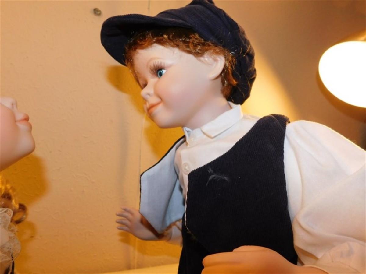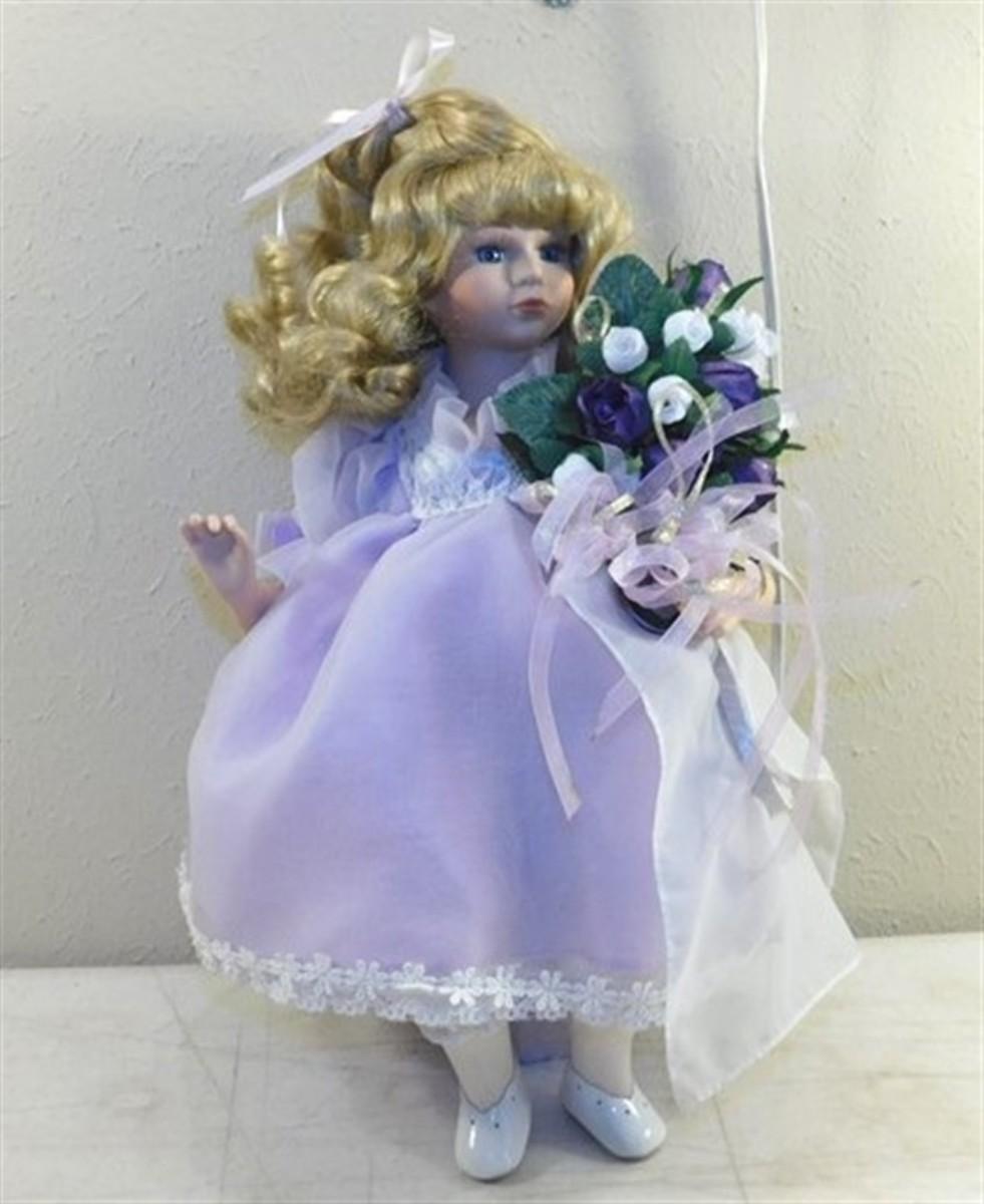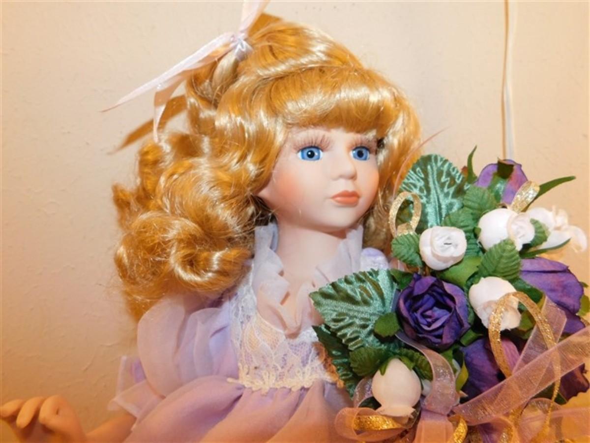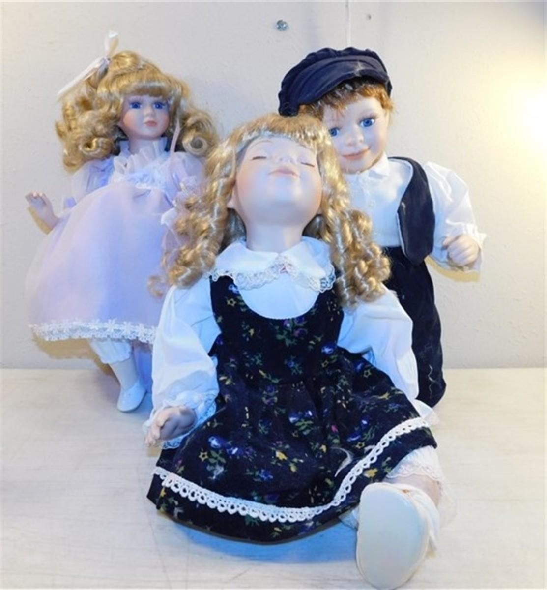 6337/229 Lot of 3 Porcelain Dolls ~ 15-19" Tall ~ Purple Dress and First Kiss Dolls