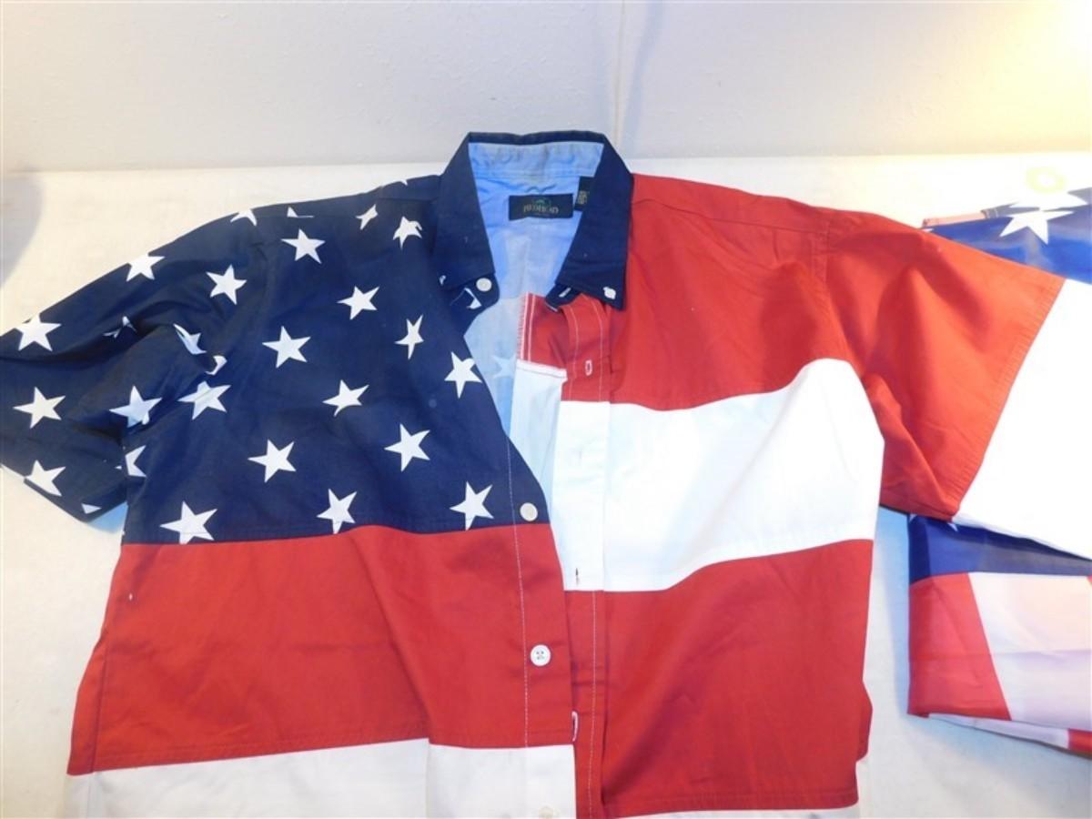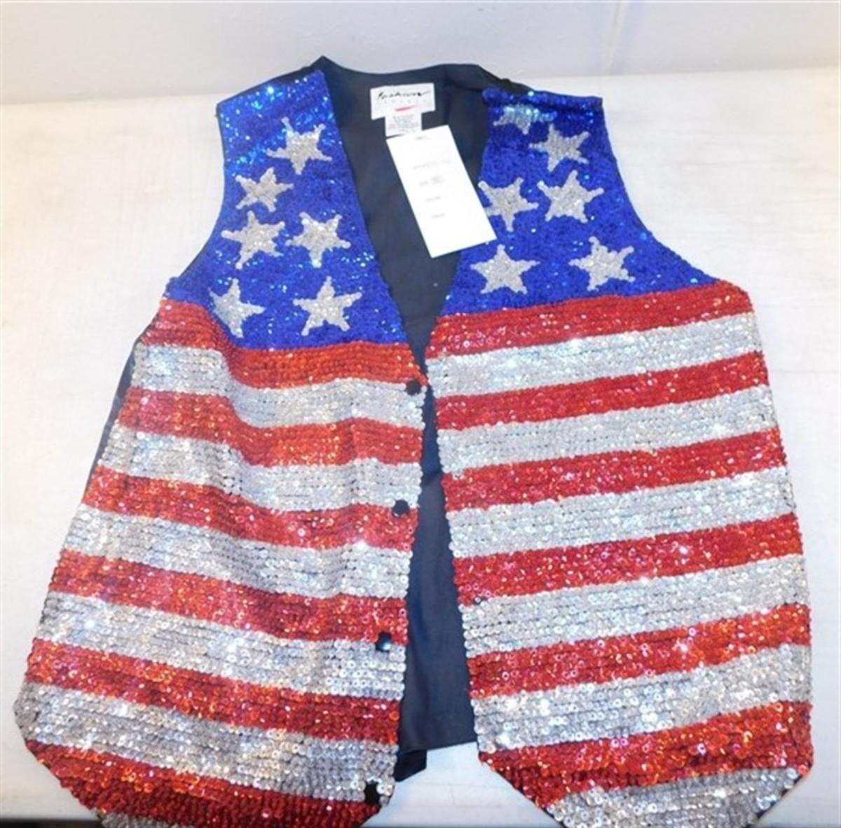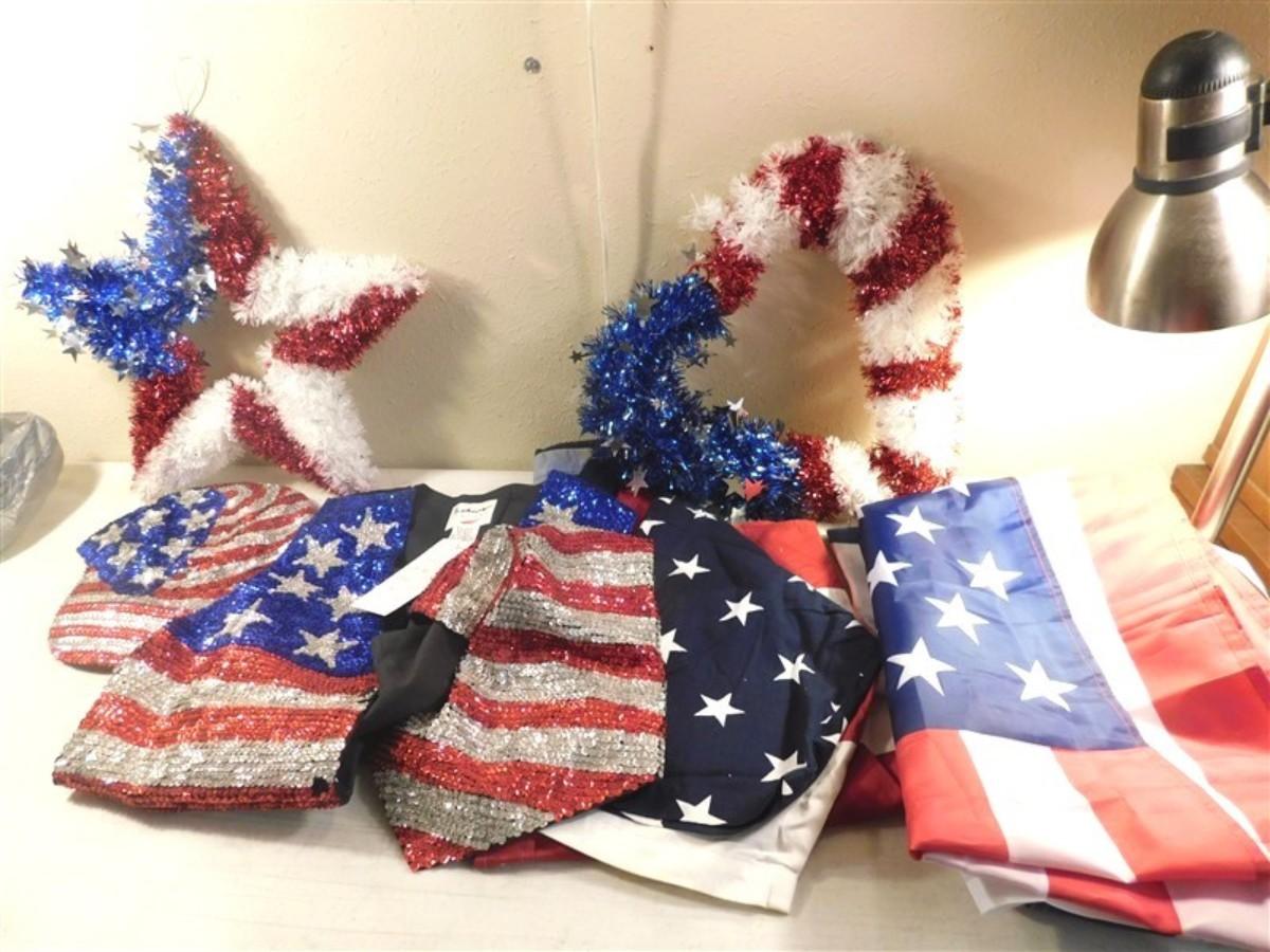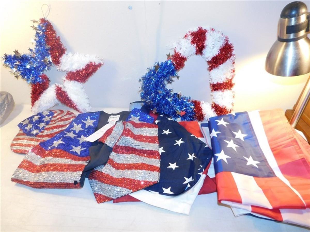 6337/288 Lot of Red White and Blue Decorations ~ Large Redhead Small Spot / Sequin Hat / Extra Large Fashion Vest / Flag 57" x 34" / Flag 60" x 36"