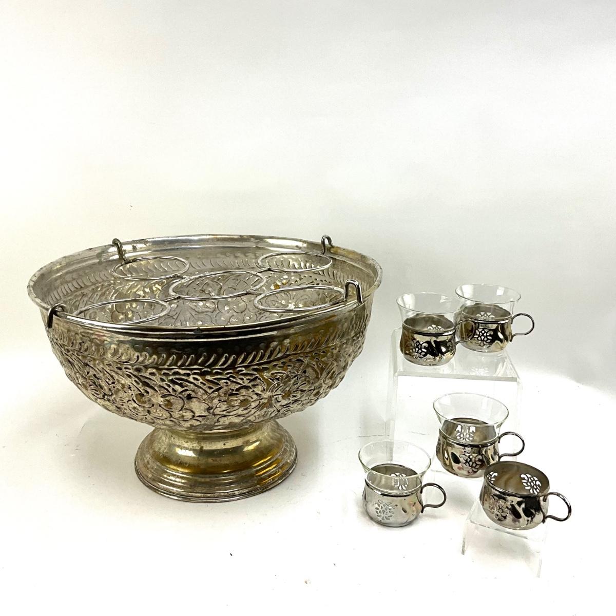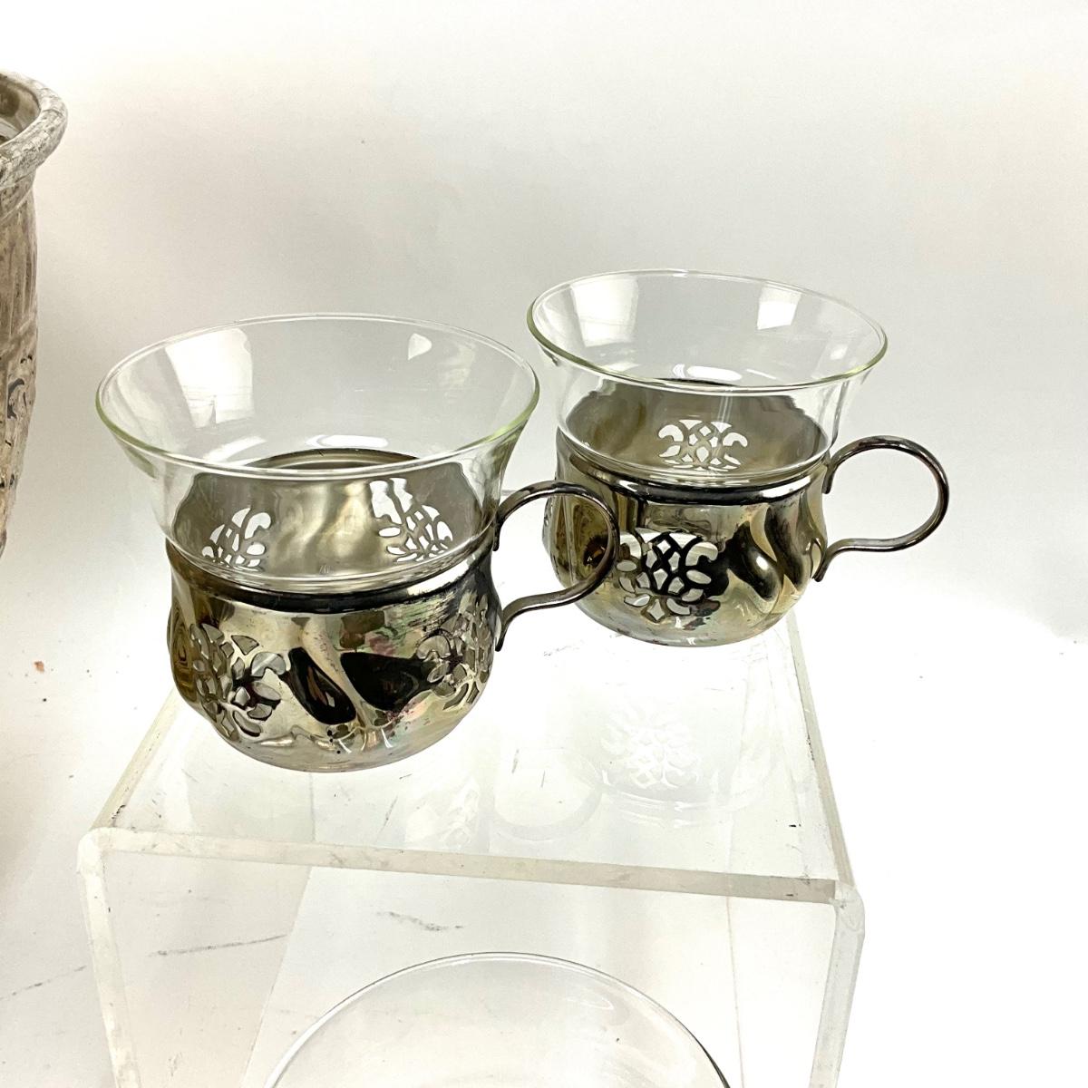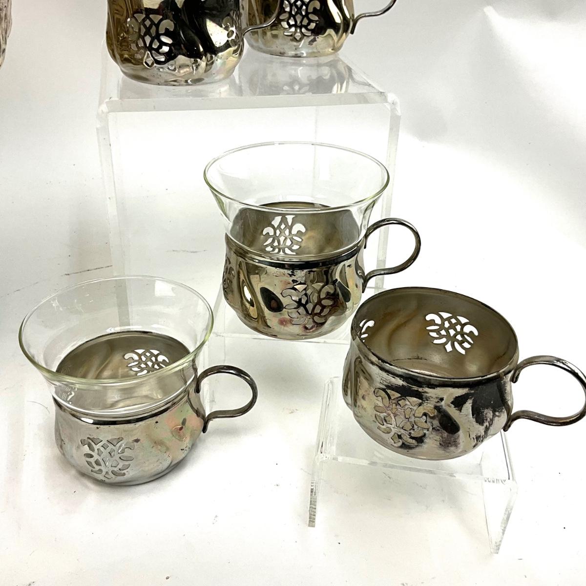The 4 glass insert cups set into stainless steel design (5 total 1 is missing glass insert)